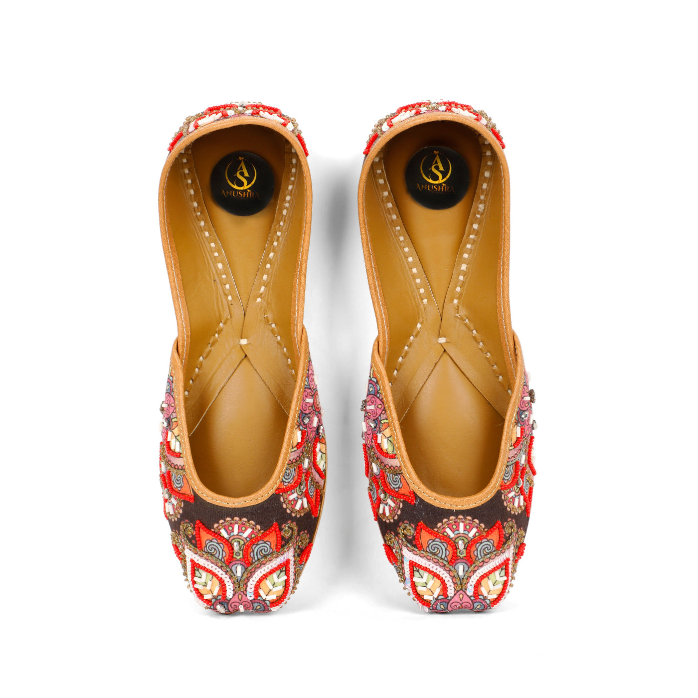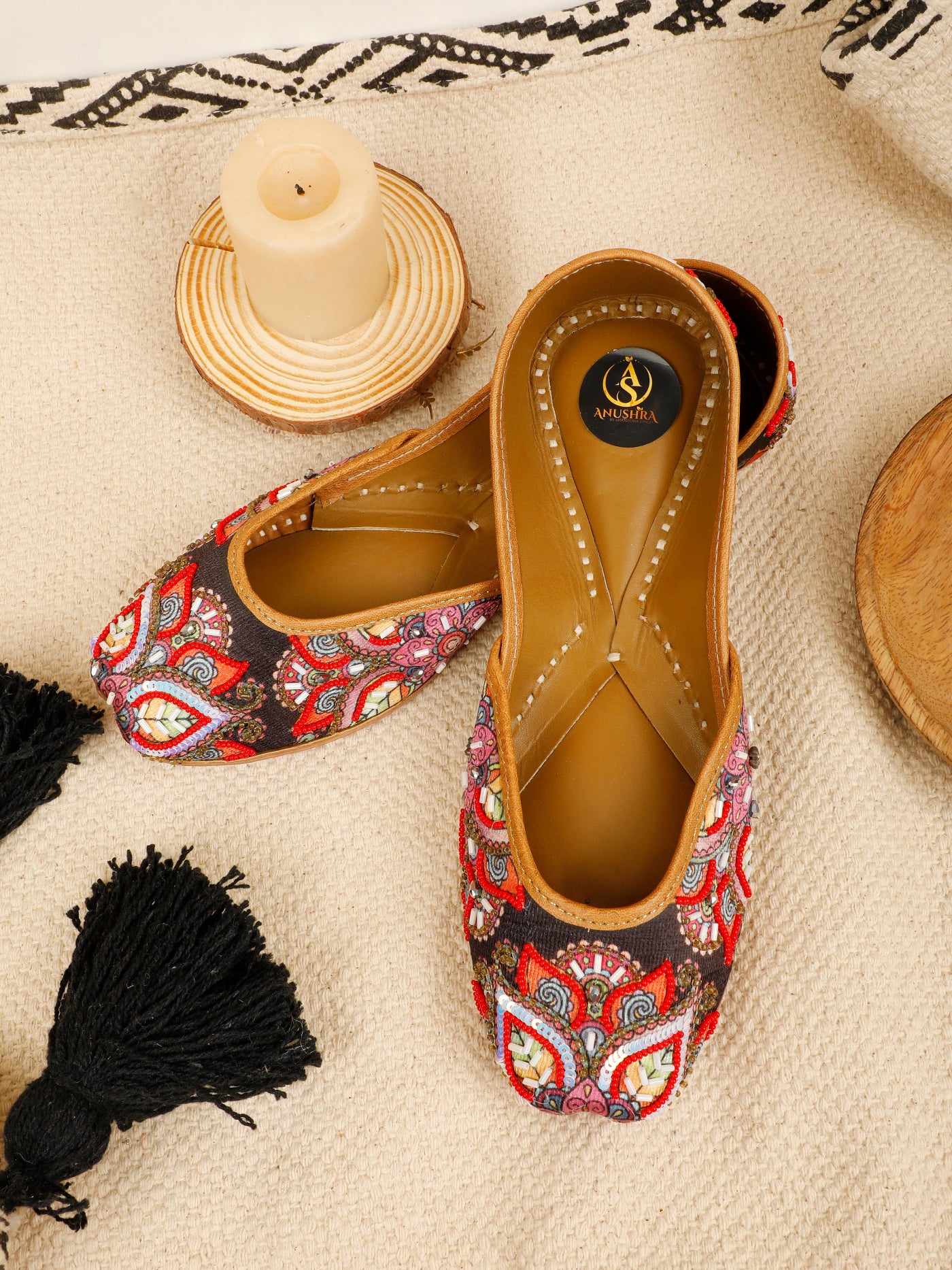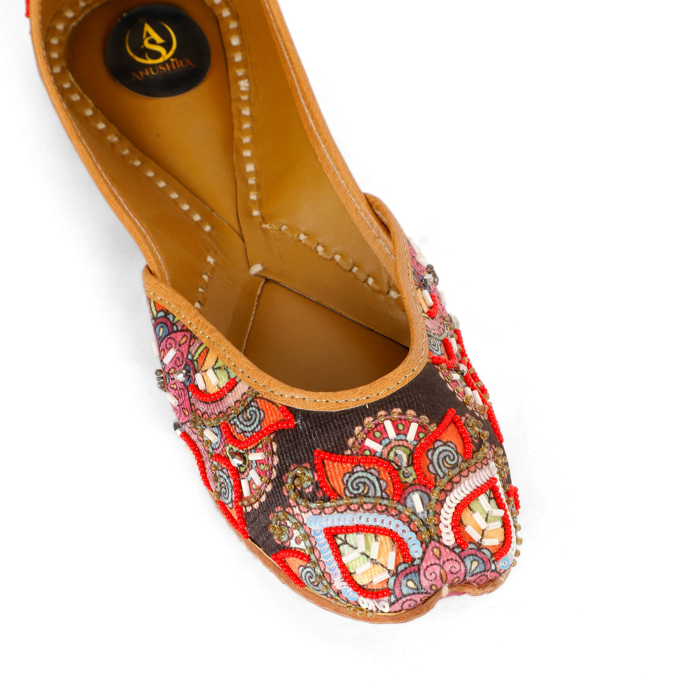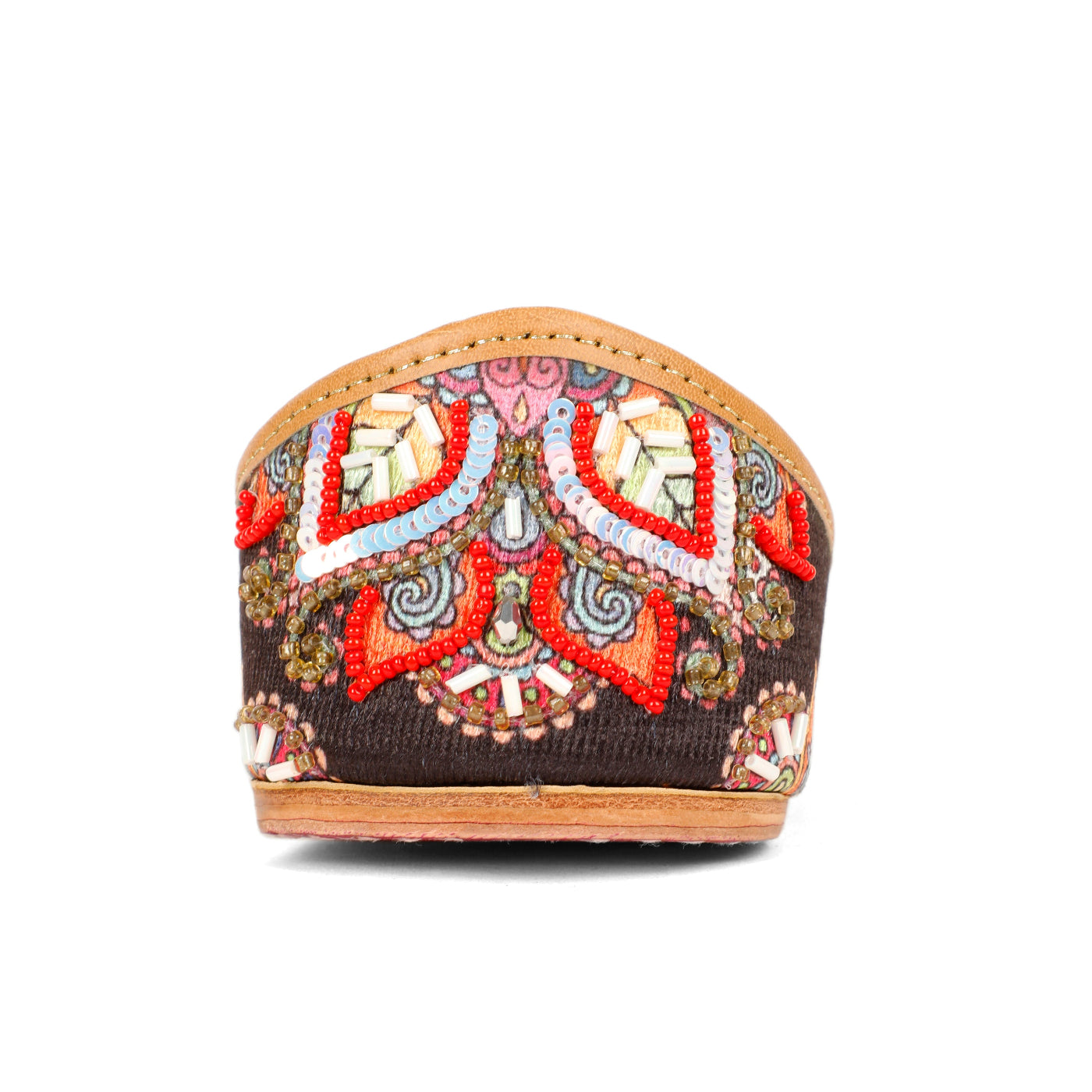 Celebrate color, craft, and culture with our Rangriti Kalamkari Jutti. Featuring a rich dark base adorned with intricate multicolor floral and paisley-inspired embroidery, this jutti comes alive with detailed beadwork, sequins, and thread artistry. The bold red accents paired with soft pastels create a striking yet harmonious design that instantly draws attention.