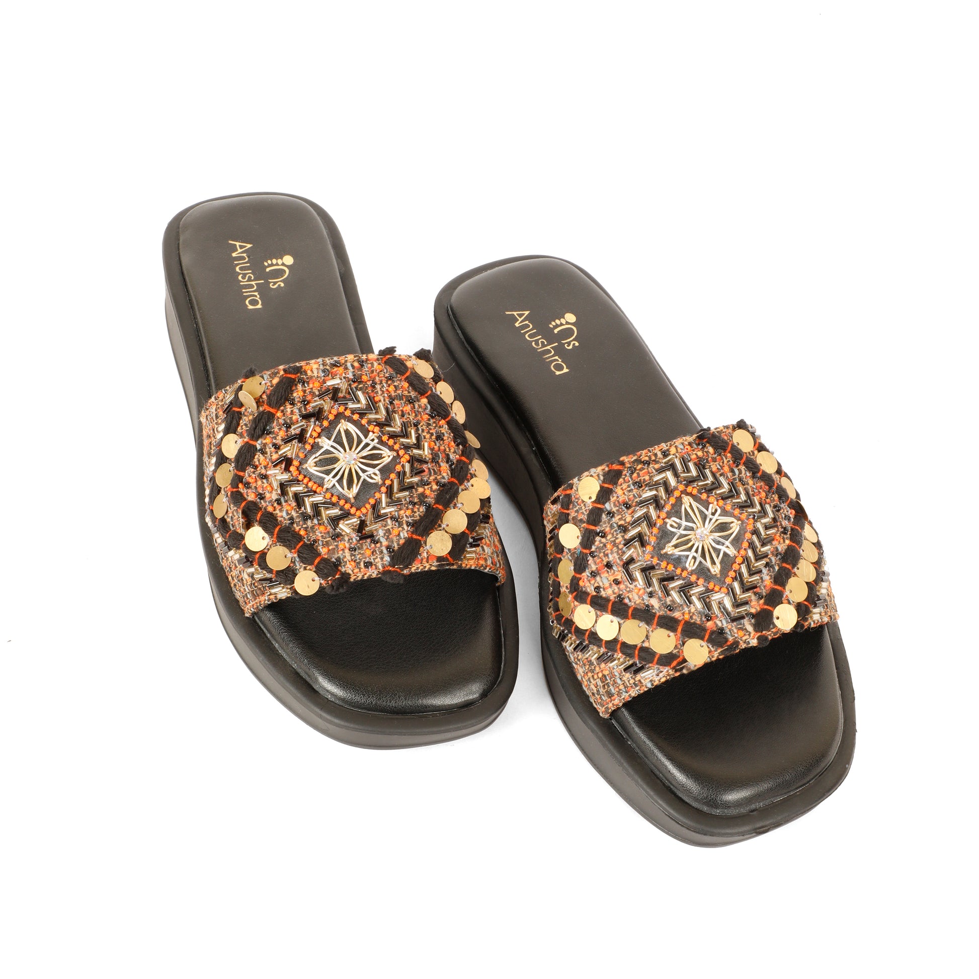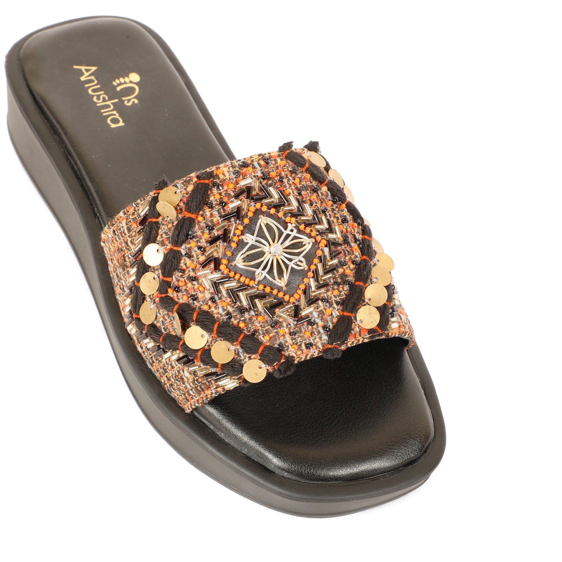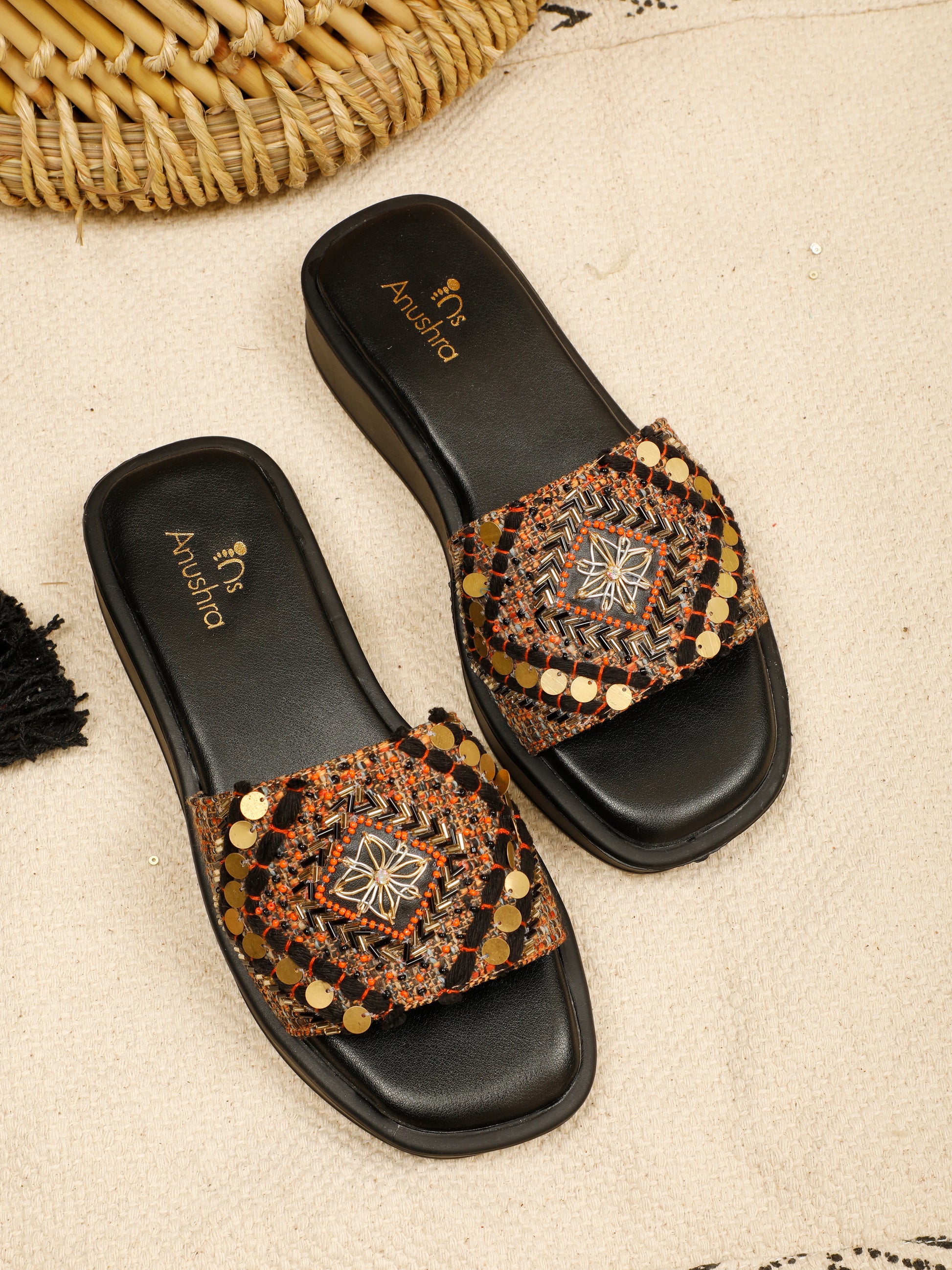 Striking and statement-worthy, the Banjara Bomber Slider is inspired by handcrafted tribal artistry and modern edge. Set on a sleek black cushioned footbed, the textured strap features intricate geometric weaving, highlighted with metallic siquine and threadwork, antique gold discs, and a central handcrafted motif that adds depth and character.