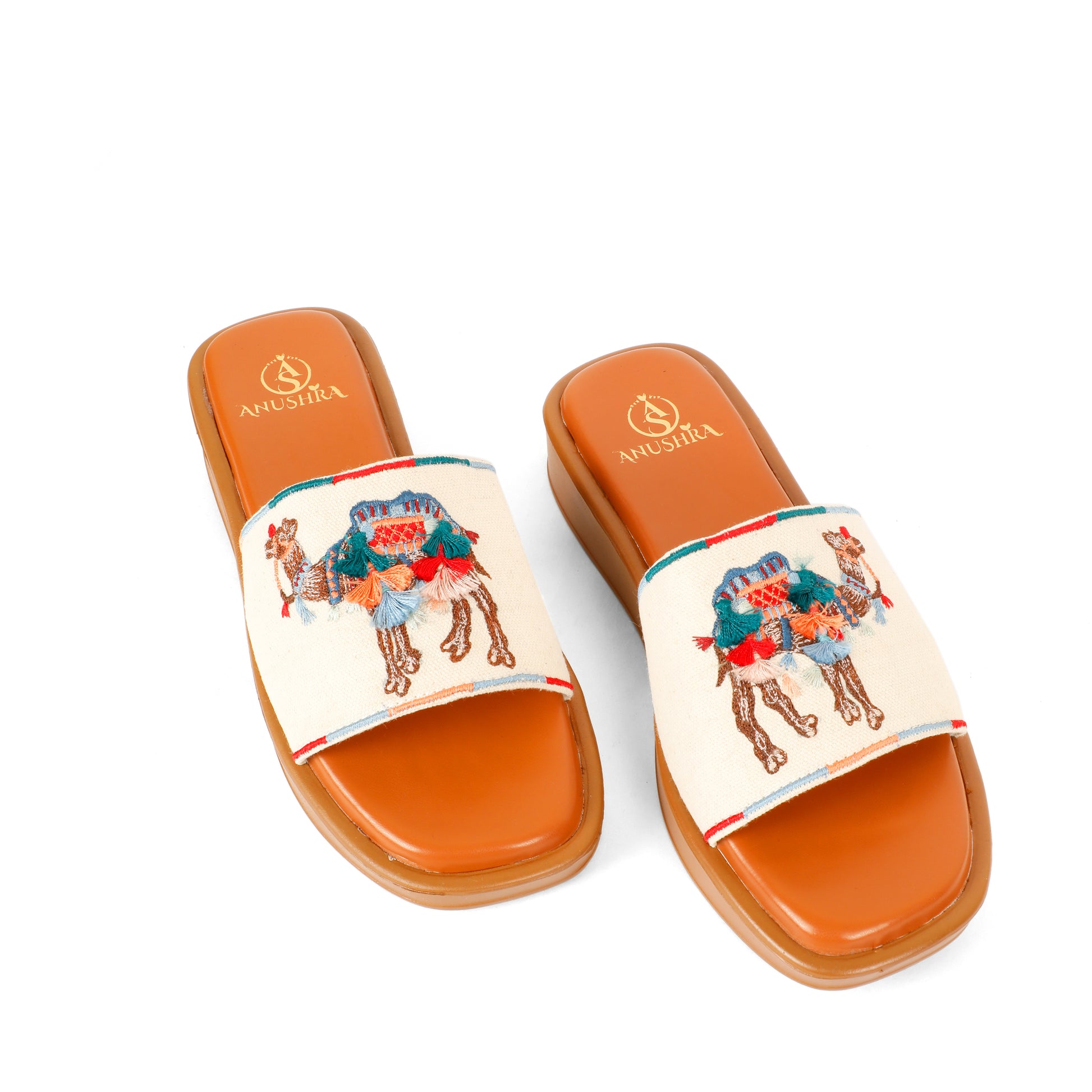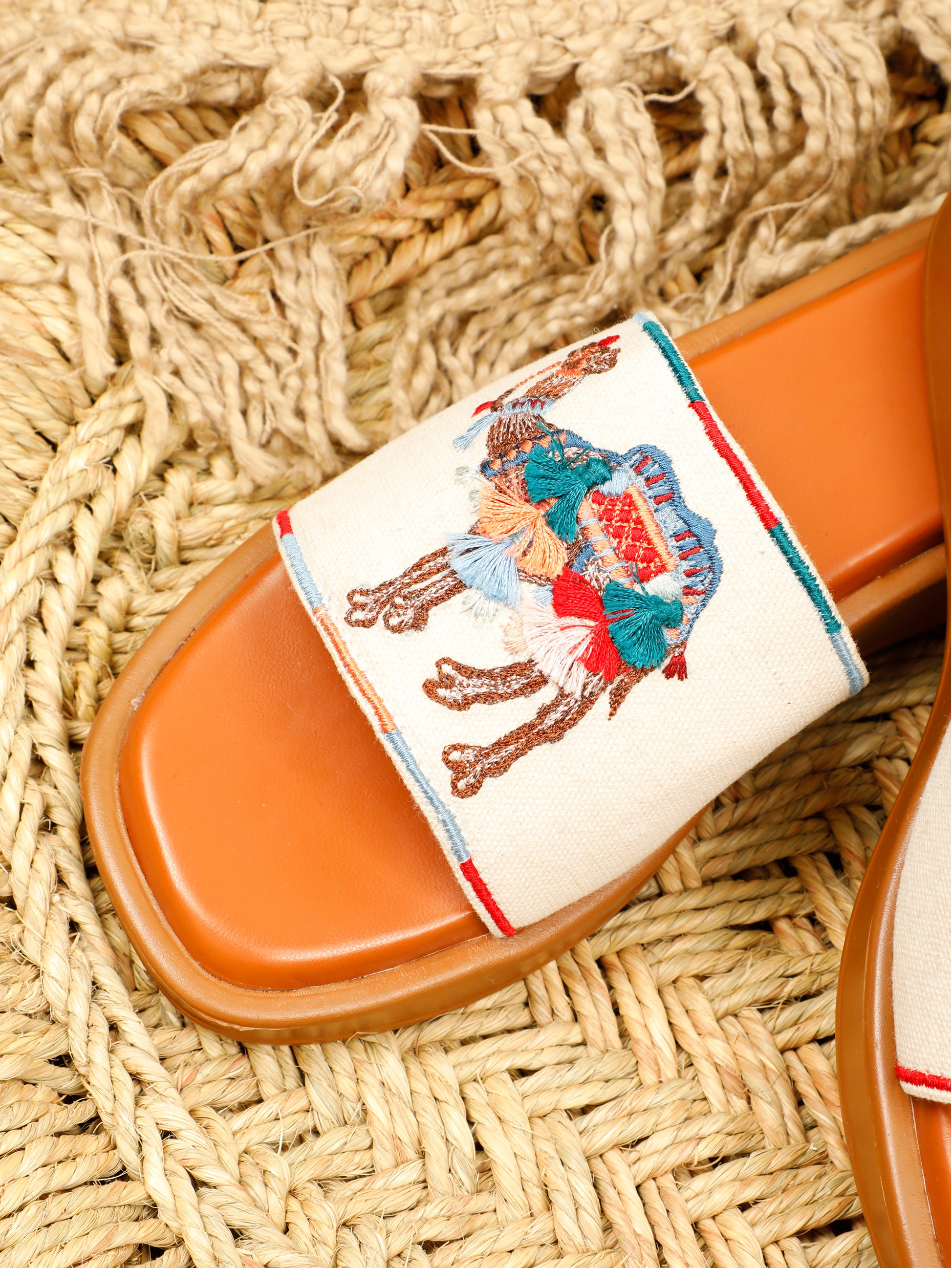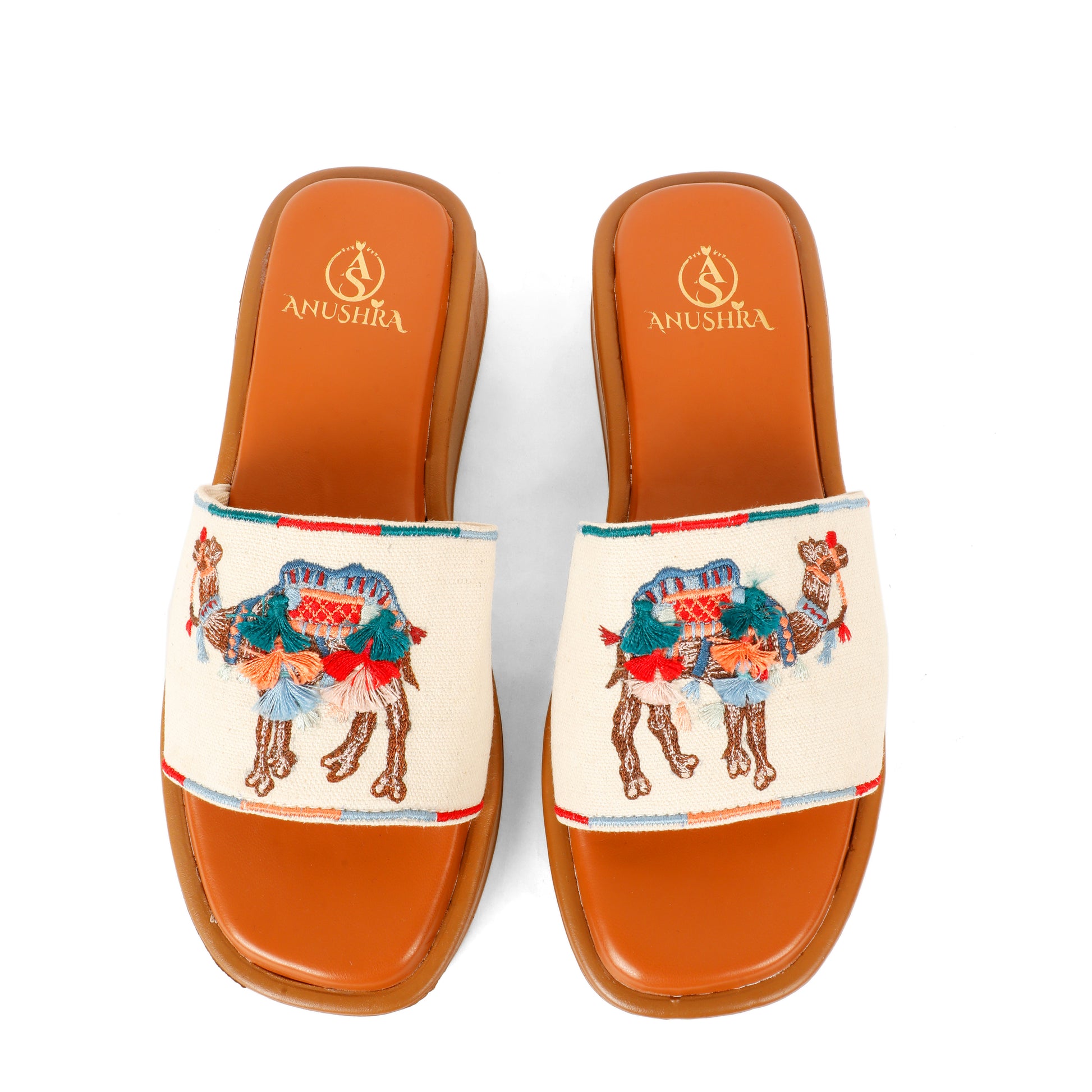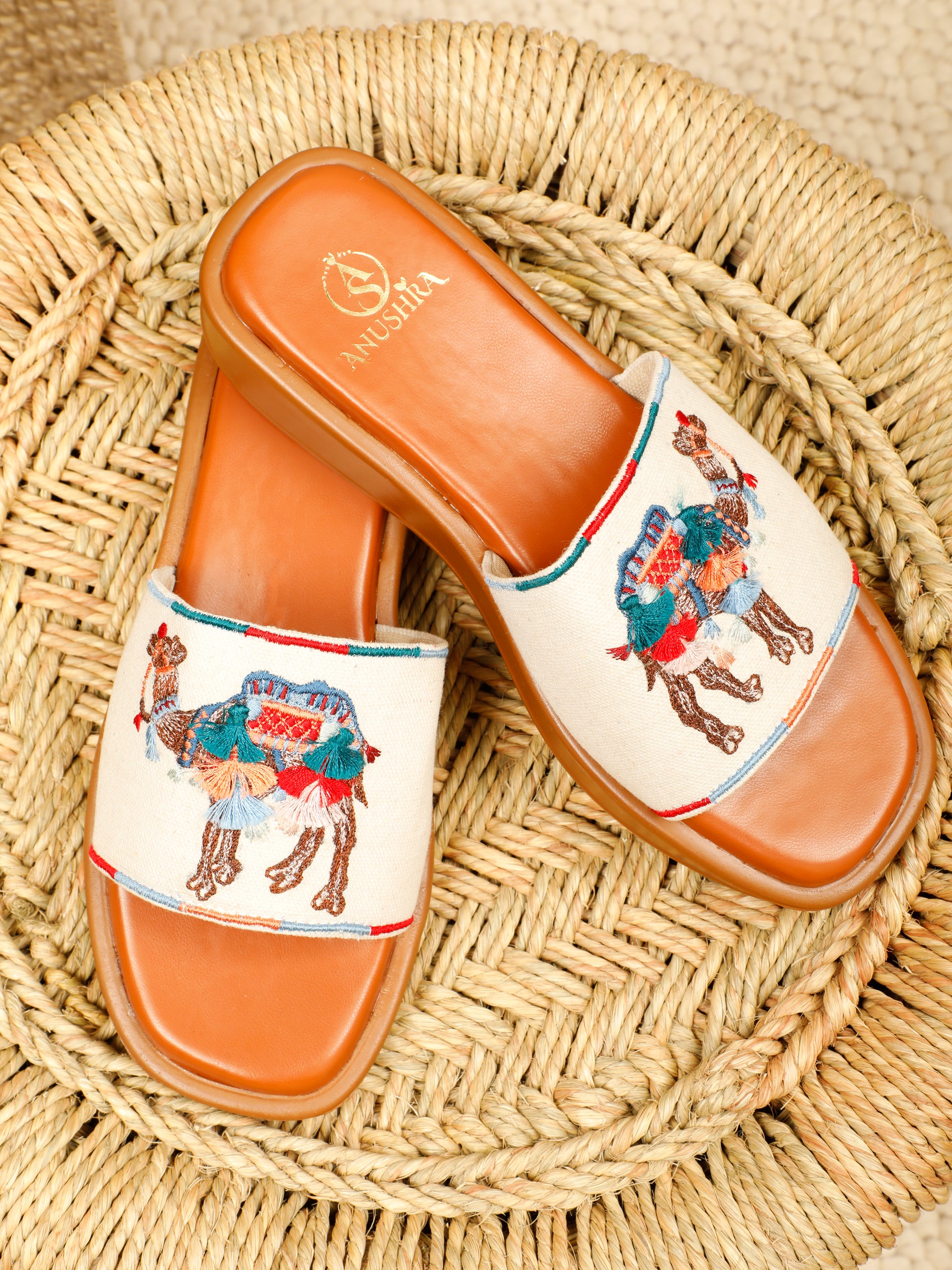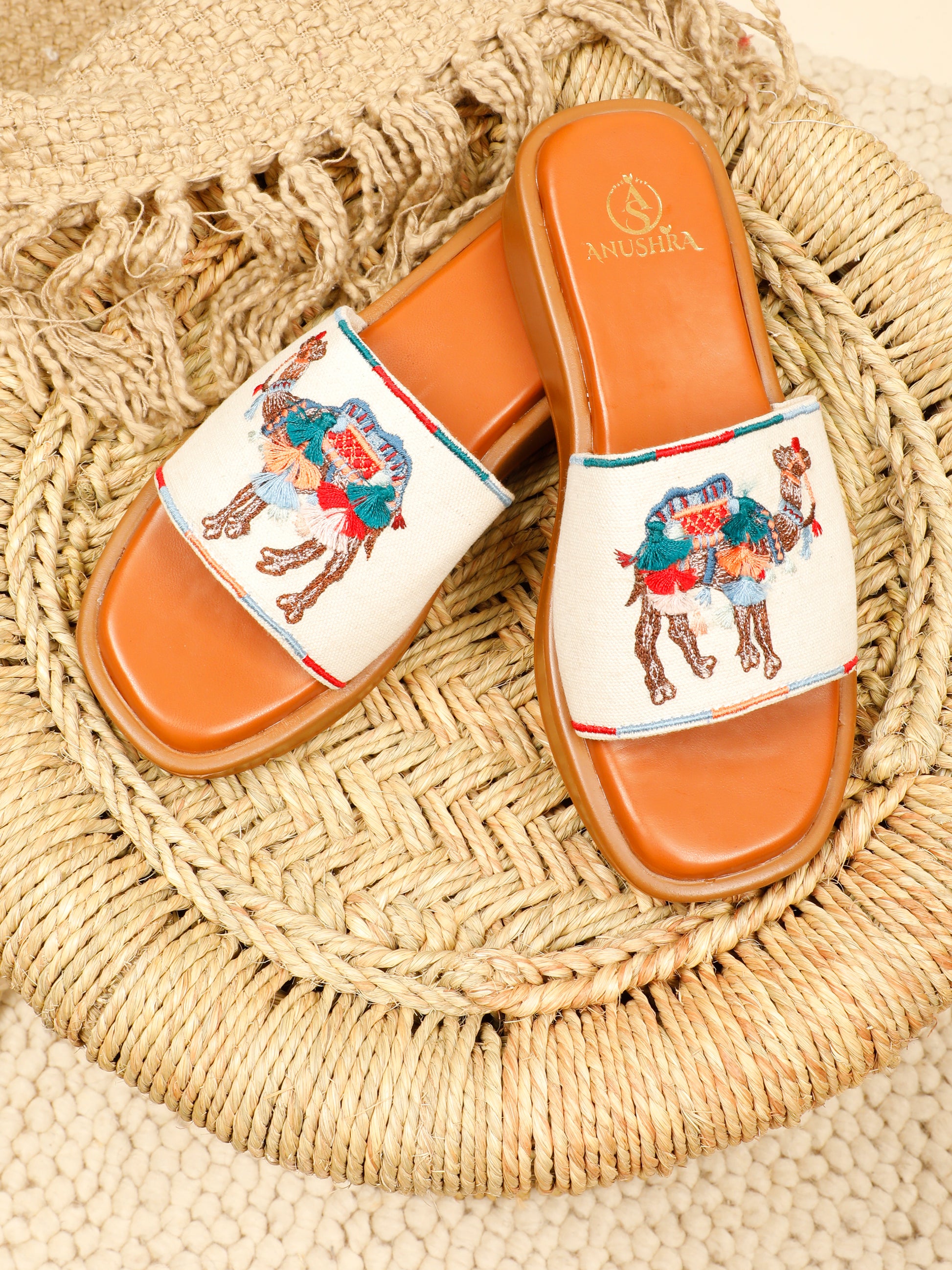 Step into effortless style with Caravan Bomber Slider, where comfort meets craftsmanship. Designed with a soft tan sole and a beautifully embroidered camel motif, this slider draws inspiration from timeless desert journeys and folk artistry. The textured embroidery in earthy hues adds a touch of heritage charm, while the cushioned sole ensures all-day comfort.