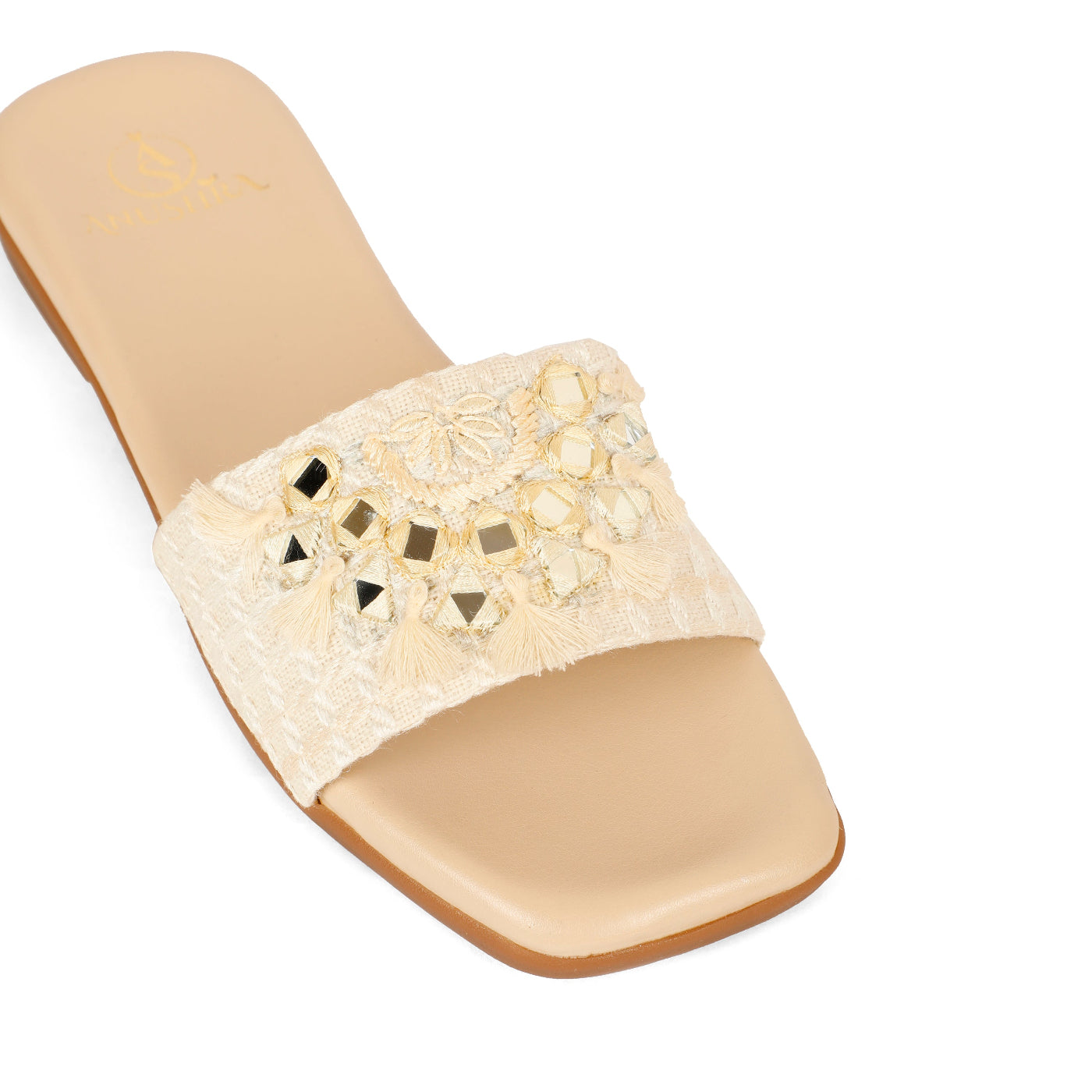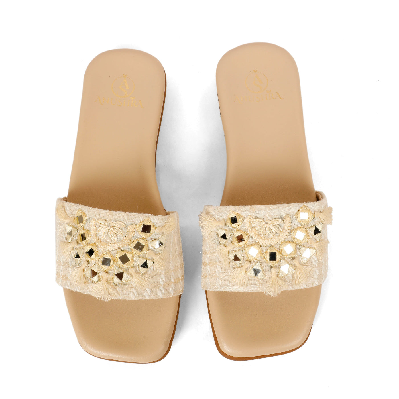 Subtle sparkle meets timeless elegance in the Ivory Boho  Flats. Designed with a soft beige cushioned sole and a richly textured ivory strap, this pair is adorned with delicate zari embroidery, mirror accents, and fine fringe detailing. The neutral palette makes it effortlessly versatile, while the handcrafted embellishments add a festive glow. Lightweight and easy to slip on, these flats are perfect for weddings, celebrations, and refined ethnic styling.