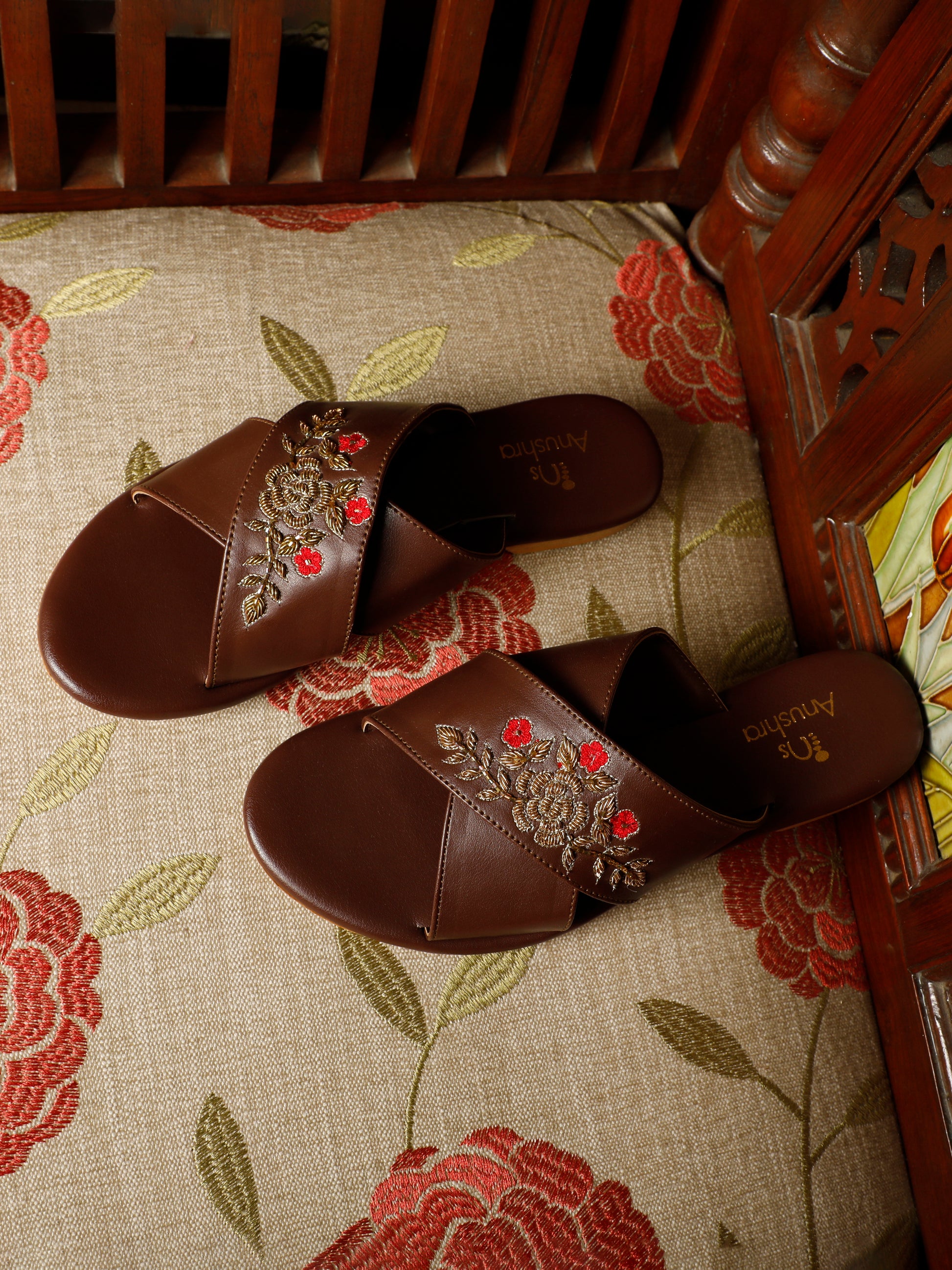 Step into timeless elegance with the Mehru Bloom Criss-Cross Flats. Crafted in a rich coffee-brown tone, these flats feature a graceful criss-cross strap design adorned with delicate floral embroidery with dabka and resam zardosi handwork warm gold and soft red hues.