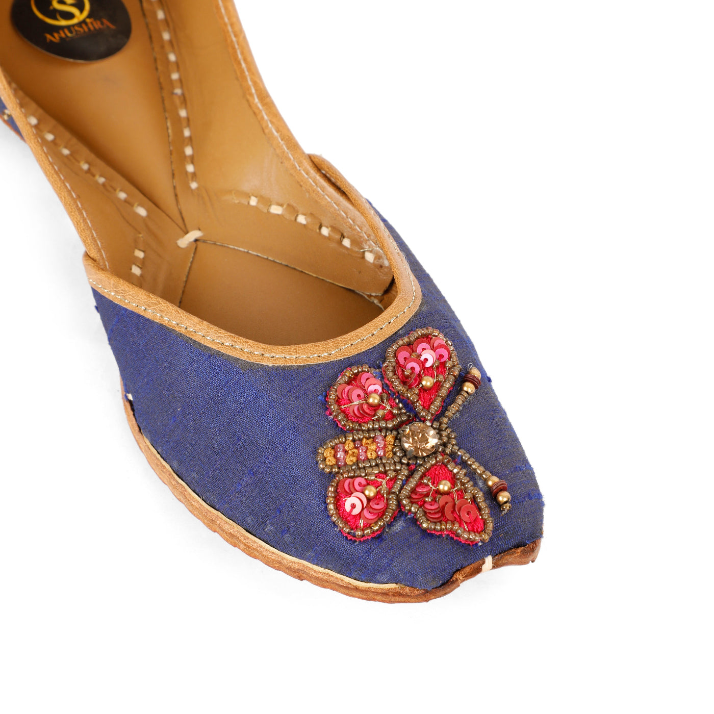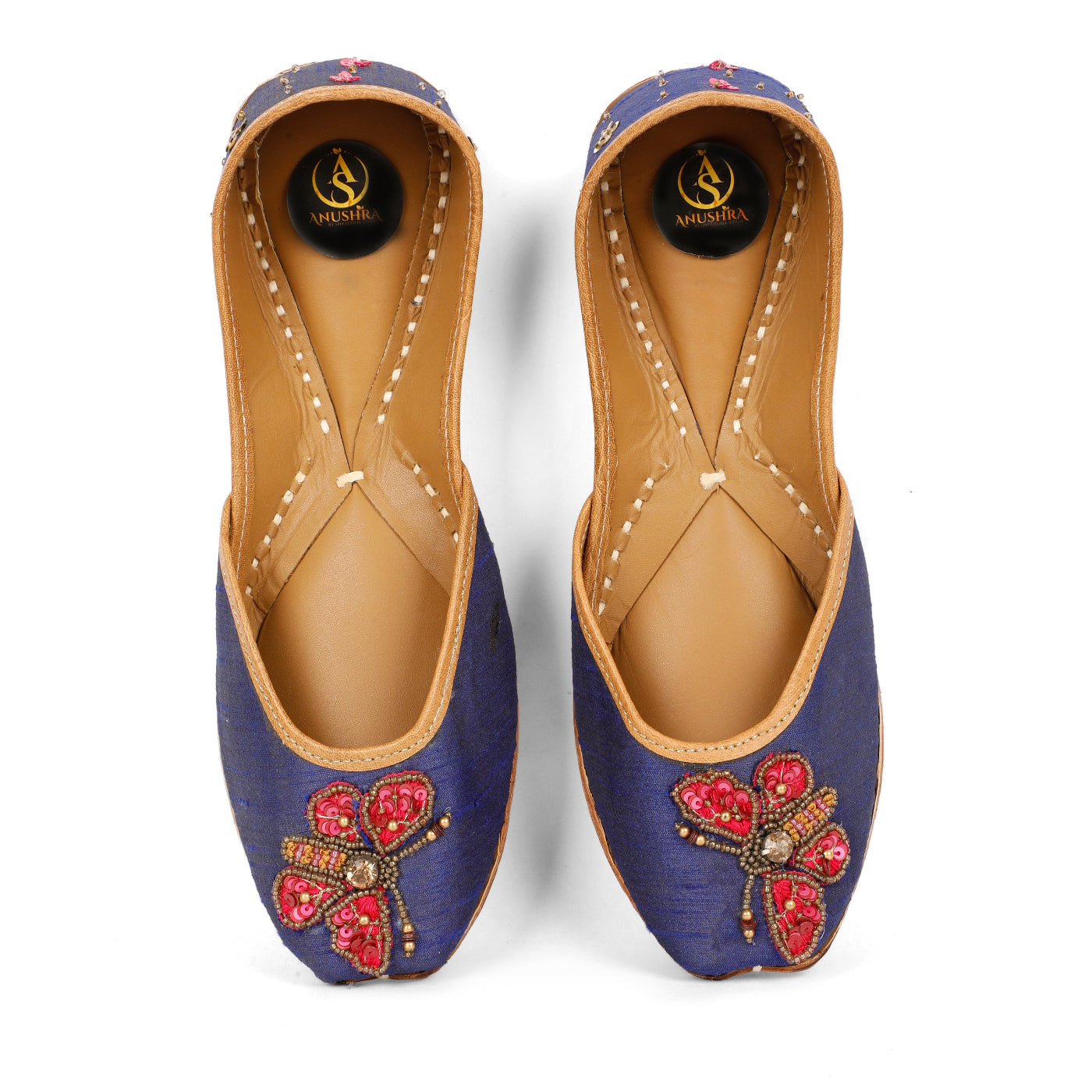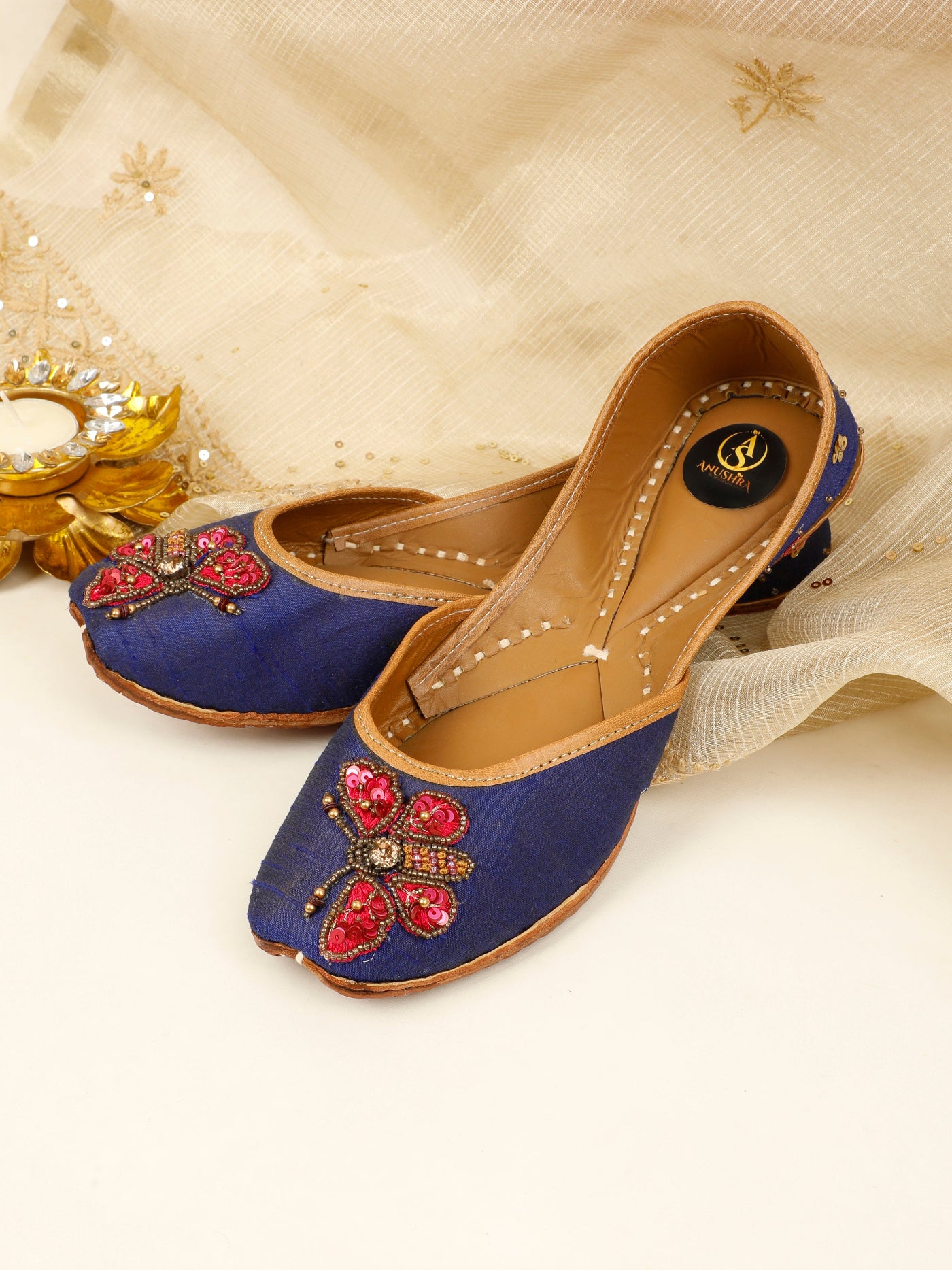 Graceful and timeless, the Butterfly Jutti is a beautiful expression of understated luxury. Crafted on a deep navy-blue base, this handcrafted jutti features an exquisite butterfly motif brought to life with rich crimson embroidery, fine beads, and subtle metallic accents. The contrast detailing adds a regal charm, while the soft leather lining and traditional hand-stitched sole ensure lasting comfort. Perfect for festive evenings, wedding functions, and elegant celebrations, this jutti blends classic craftsmanship with contemporary appeal.