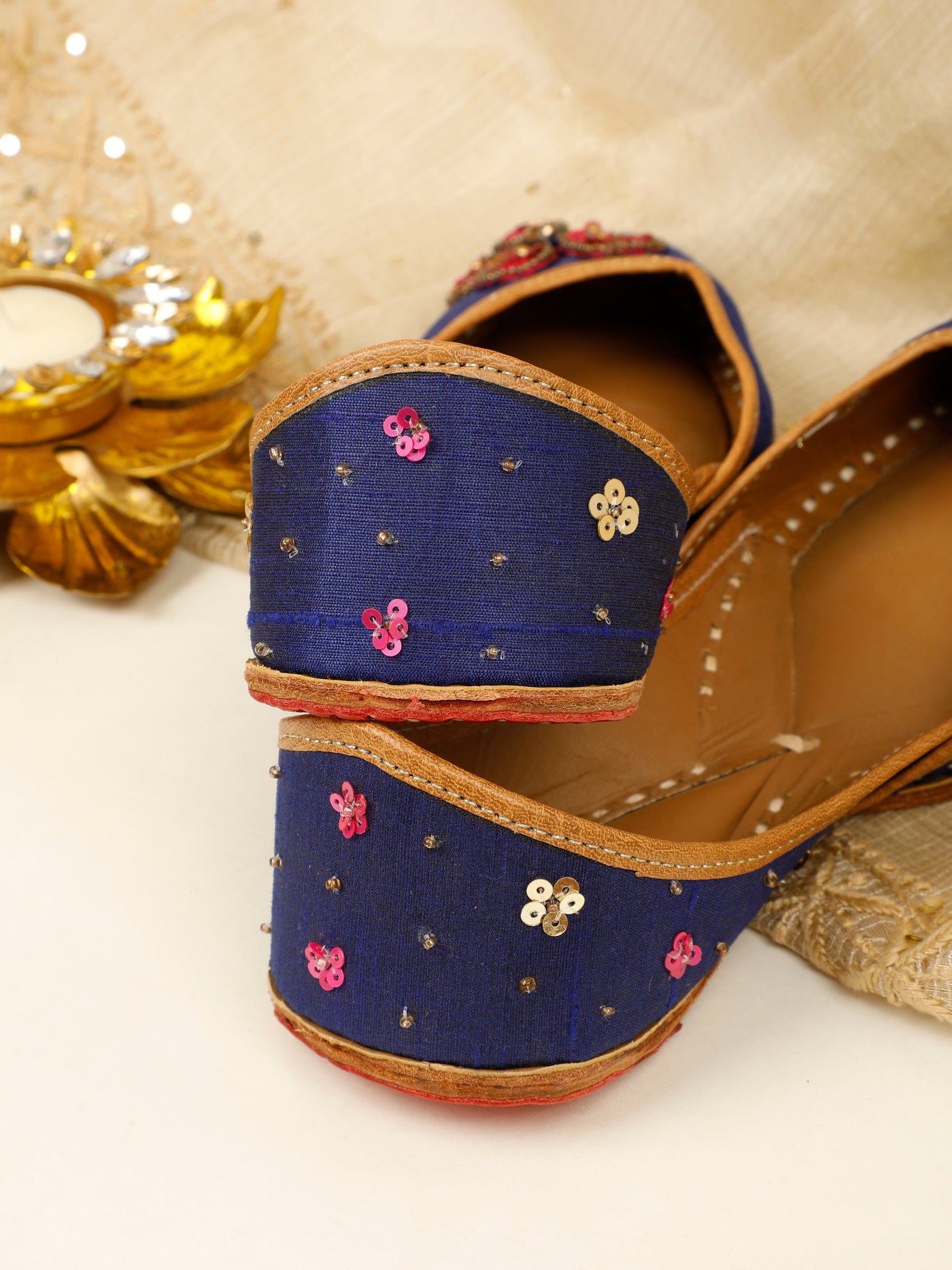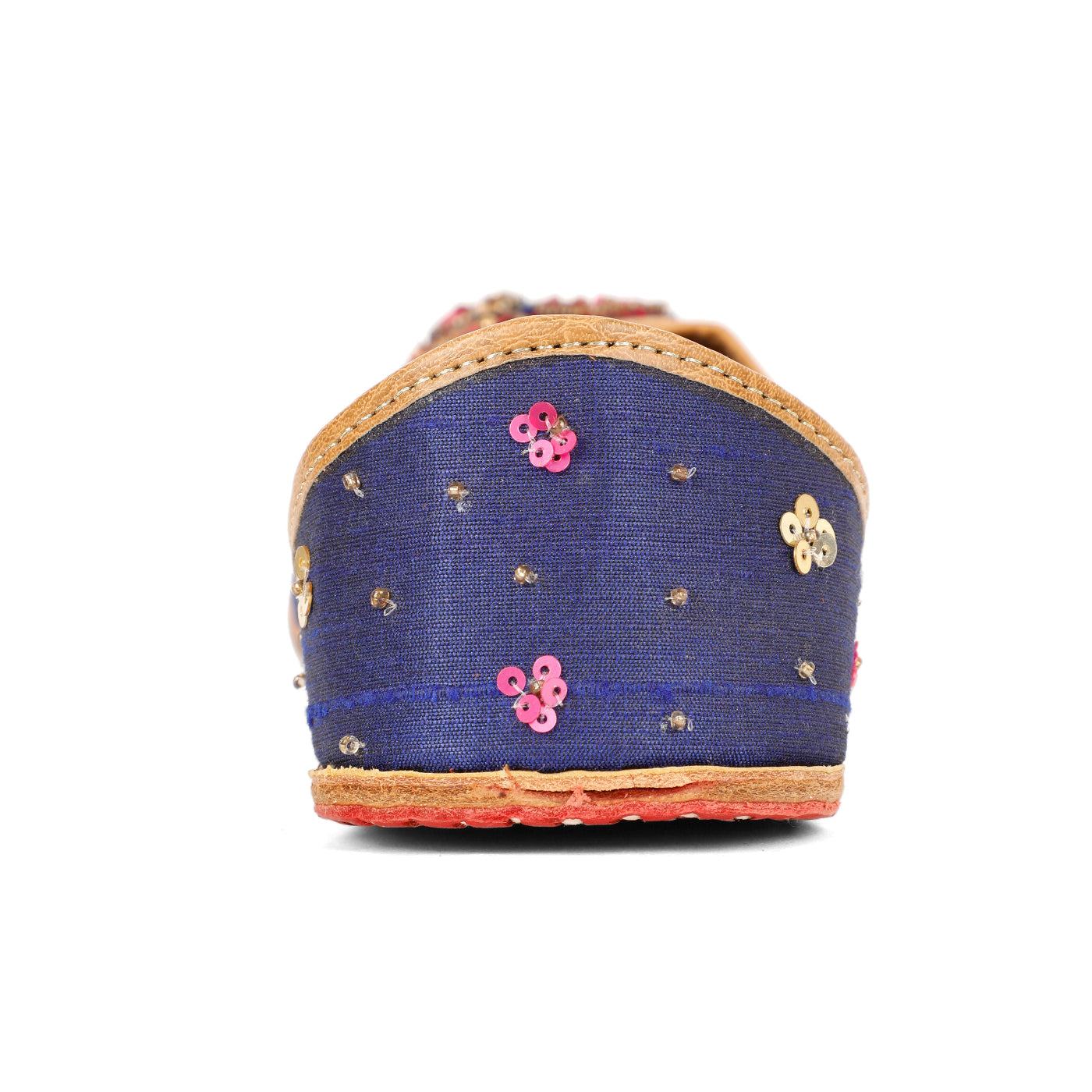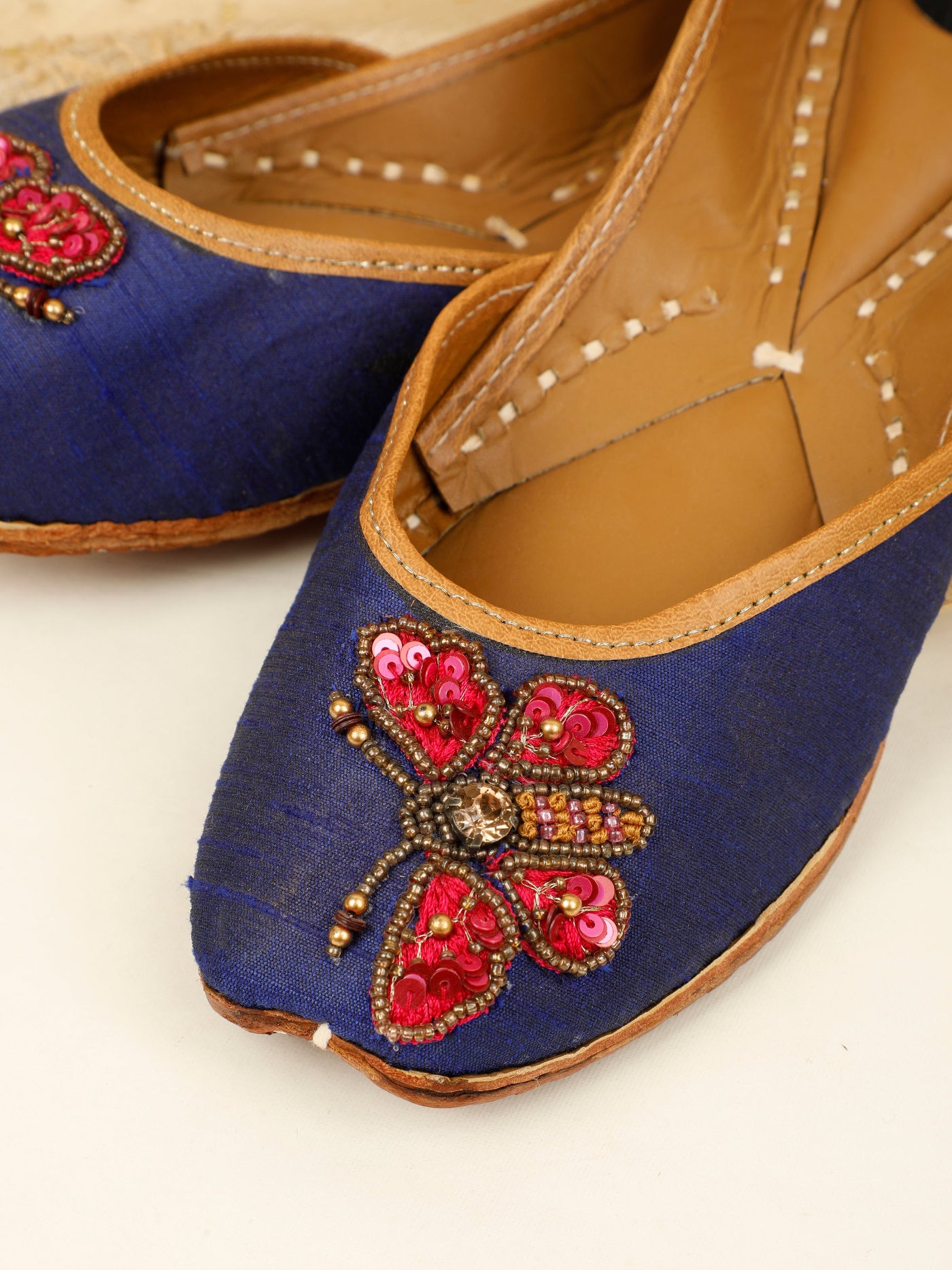 Graceful and timeless, the Butterfly Jutti is a beautiful expression of understated luxury. Crafted on a deep navy-blue base, this handcrafted jutti features an exquisite butterfly motif brought to life with rich crimson embroidery, fine beads, and subtle metallic accents. The contrast detailing adds a regal charm, while the soft leather lining and traditional hand-stitched sole ensure lasting comfort. Perfect for festive evenings, wedding functions, and elegant celebrations, this jutti blends classic craftsmanship with contemporary appeal.