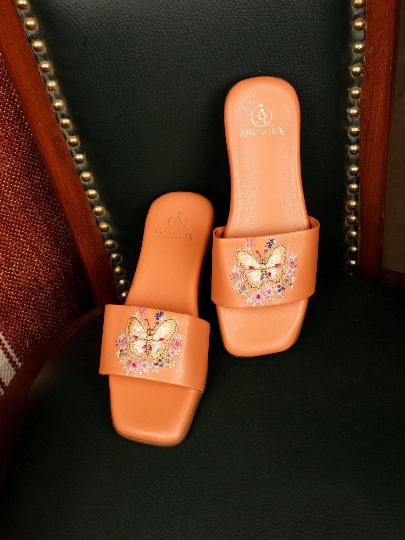Light, elegant, and full of charm, the Butterfly Flats celebrate delicate craftsmanship with a whimsical touch. Set on a warm tan base, the beautifully embroidered butterfly motif is enhanced with tiny floral accents, creating a fresh and graceful look. Designed with a cushioned footbed and an easy slip-on silhouette, these flats offer all-day comfort while adding a hint of playful elegance. Perfect for daytime festivities, brunches, and casual ethnic styling.