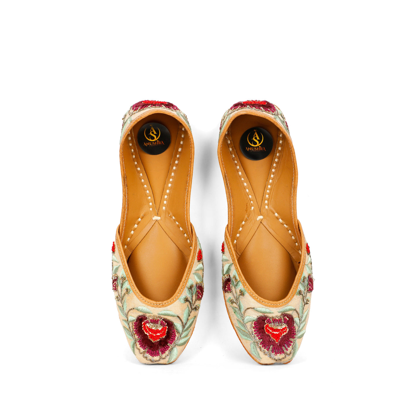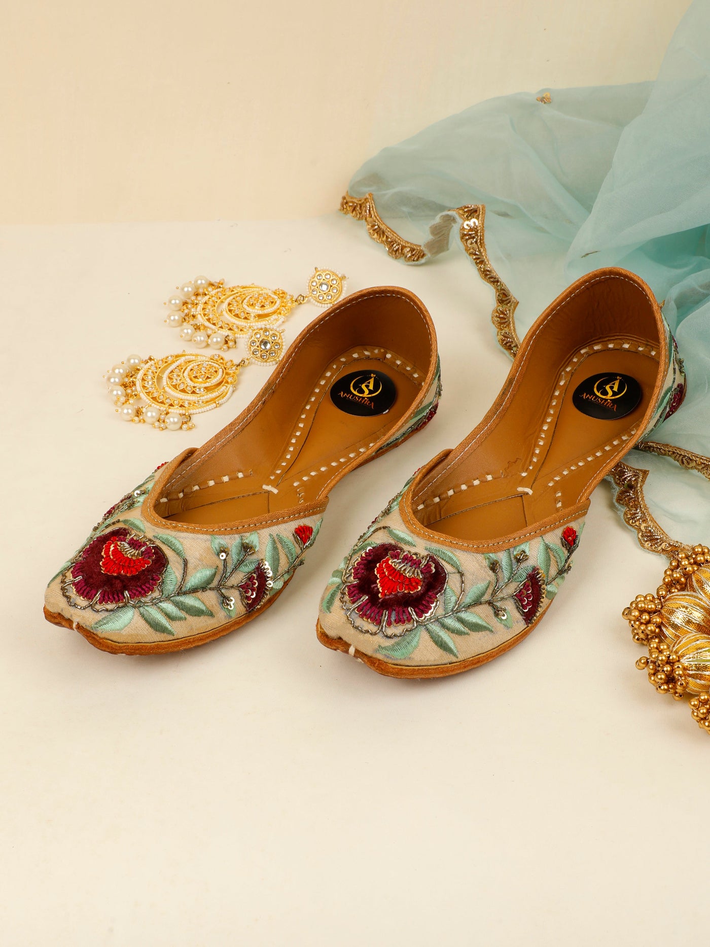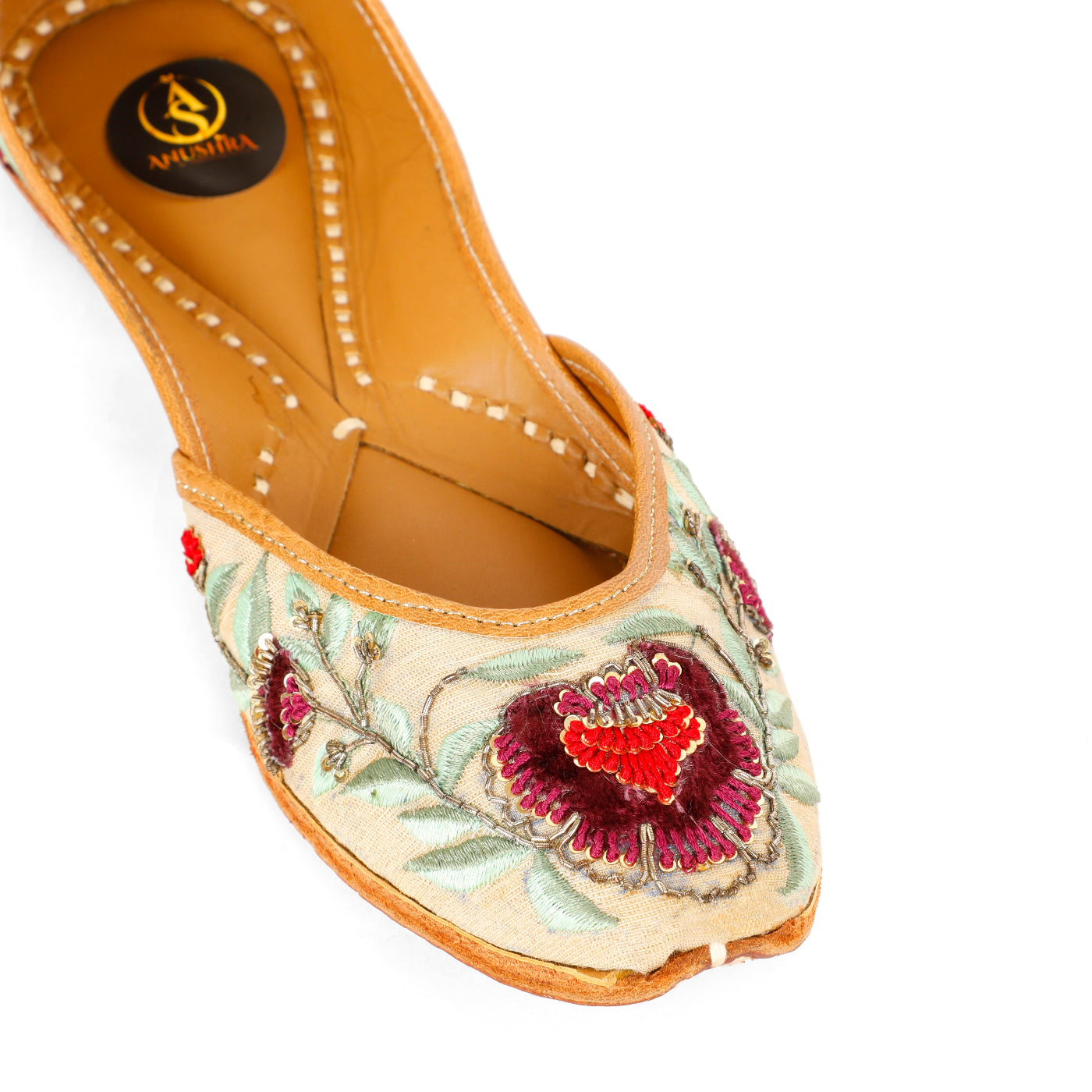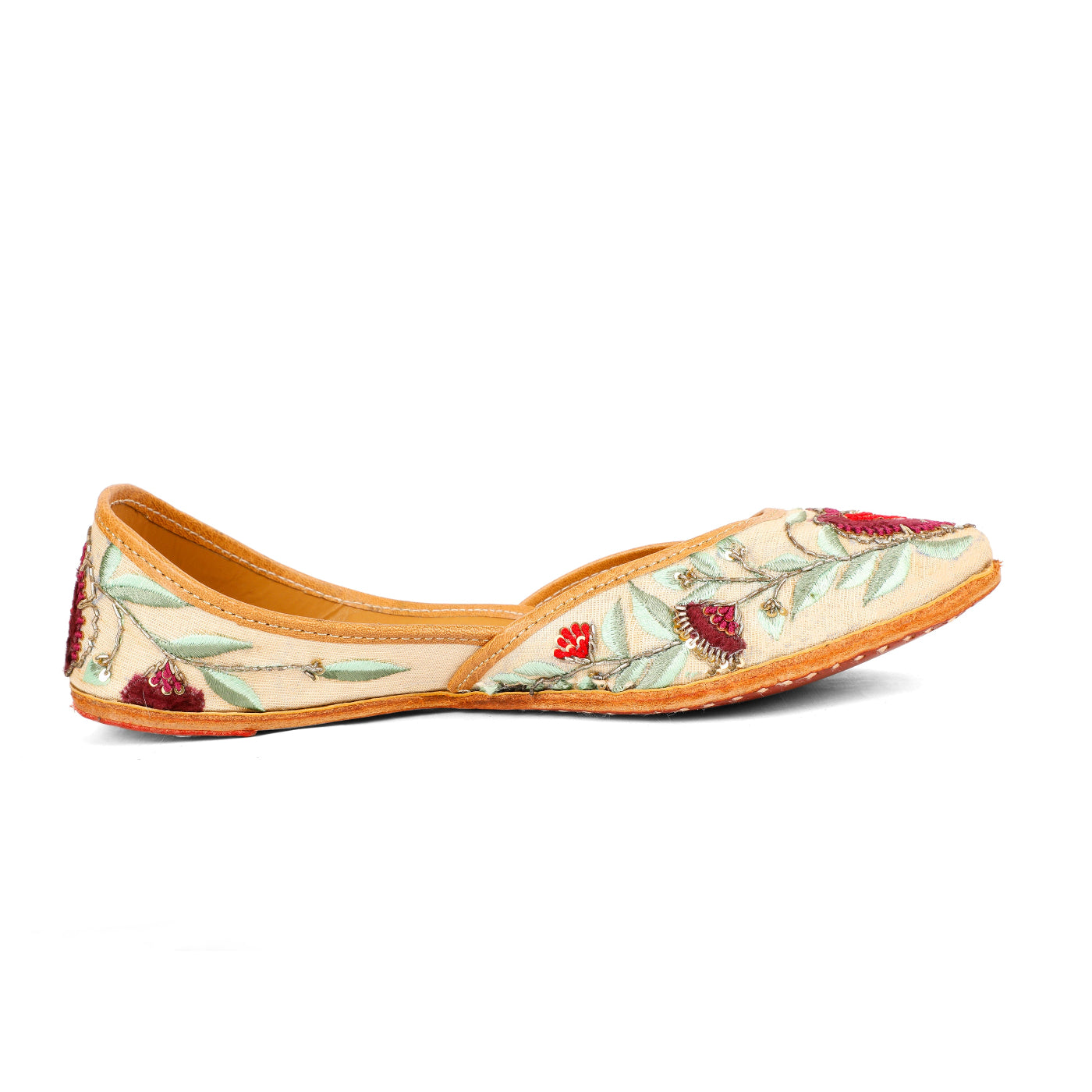 Graceful, refined, and steeped in tradition, the Gulrez Jutti is crafted for moments that call for timeless elegance. Set on a soft ivory-beige base, this handcrafted jutti features exquisite floral embroidery in deep wine and crimson hues, complemented by soothing sage-green leaves and delicate metallic accents. The intricate detailing brings a regal charm, while the cushioned leather lining and hand-stitched sole ensure all-day comfort. Perfect for weddings, festive soirées, and elegant celebrations, this jutti pairs beautifully with both classic and contemporary ethnic wear.