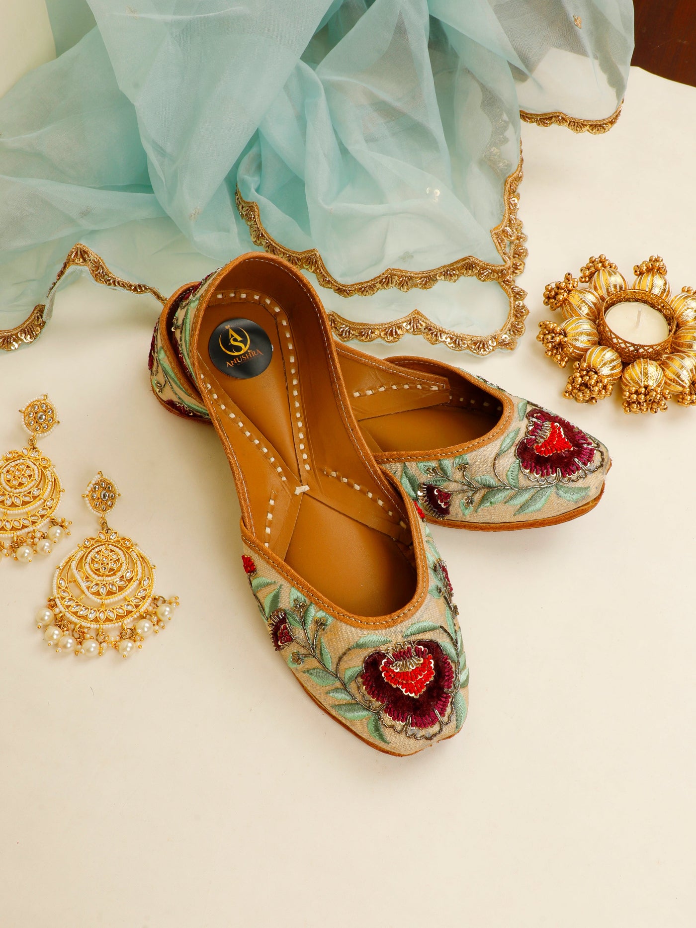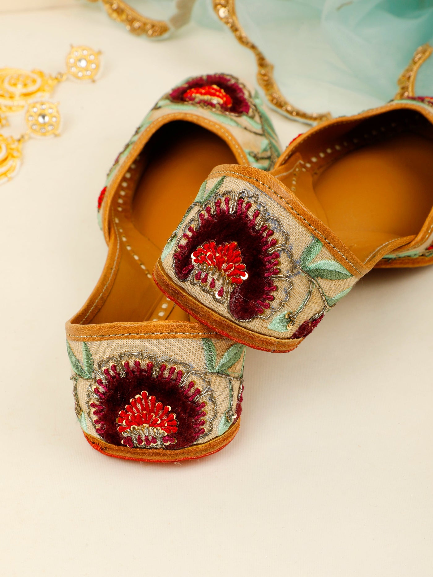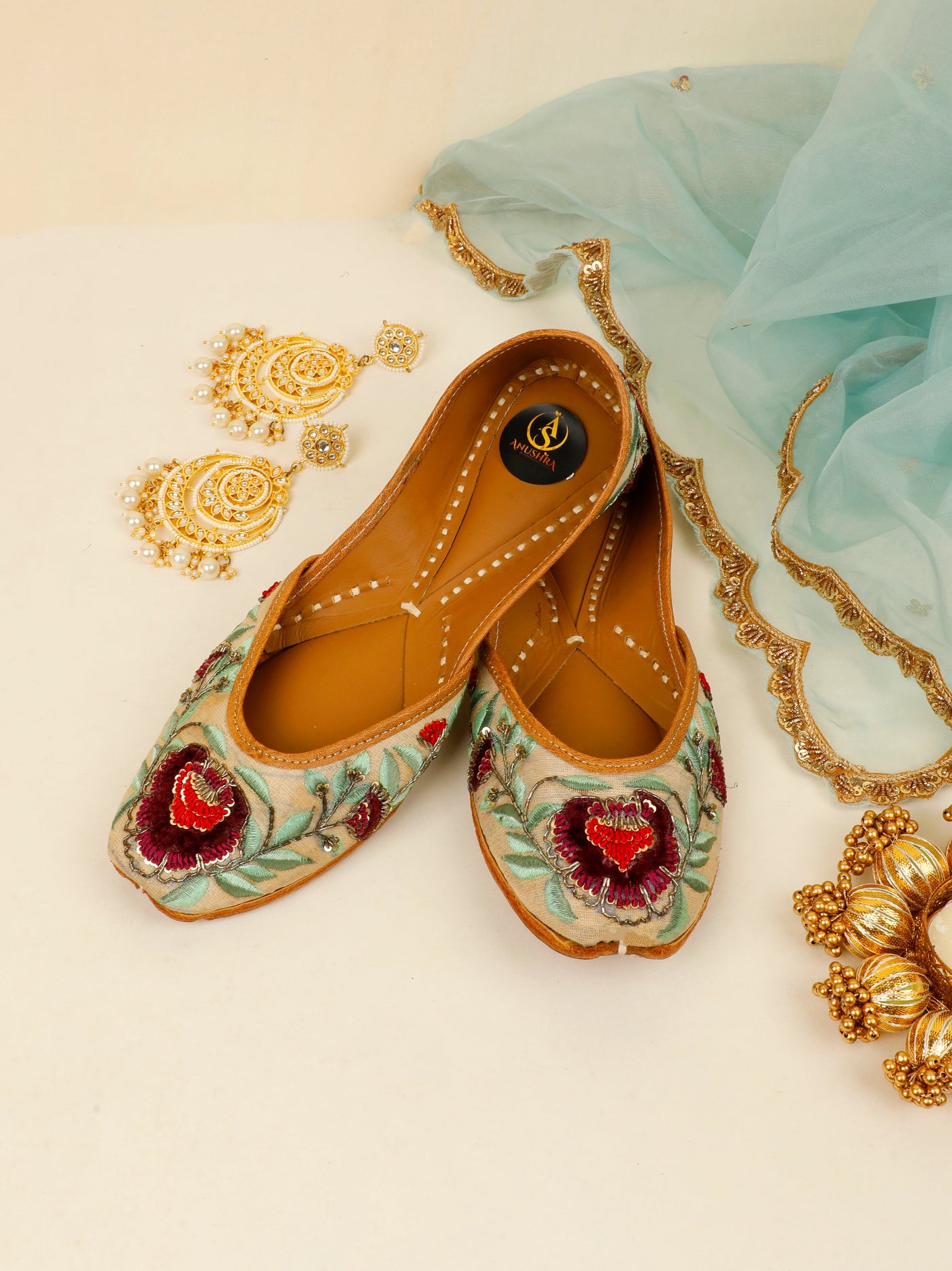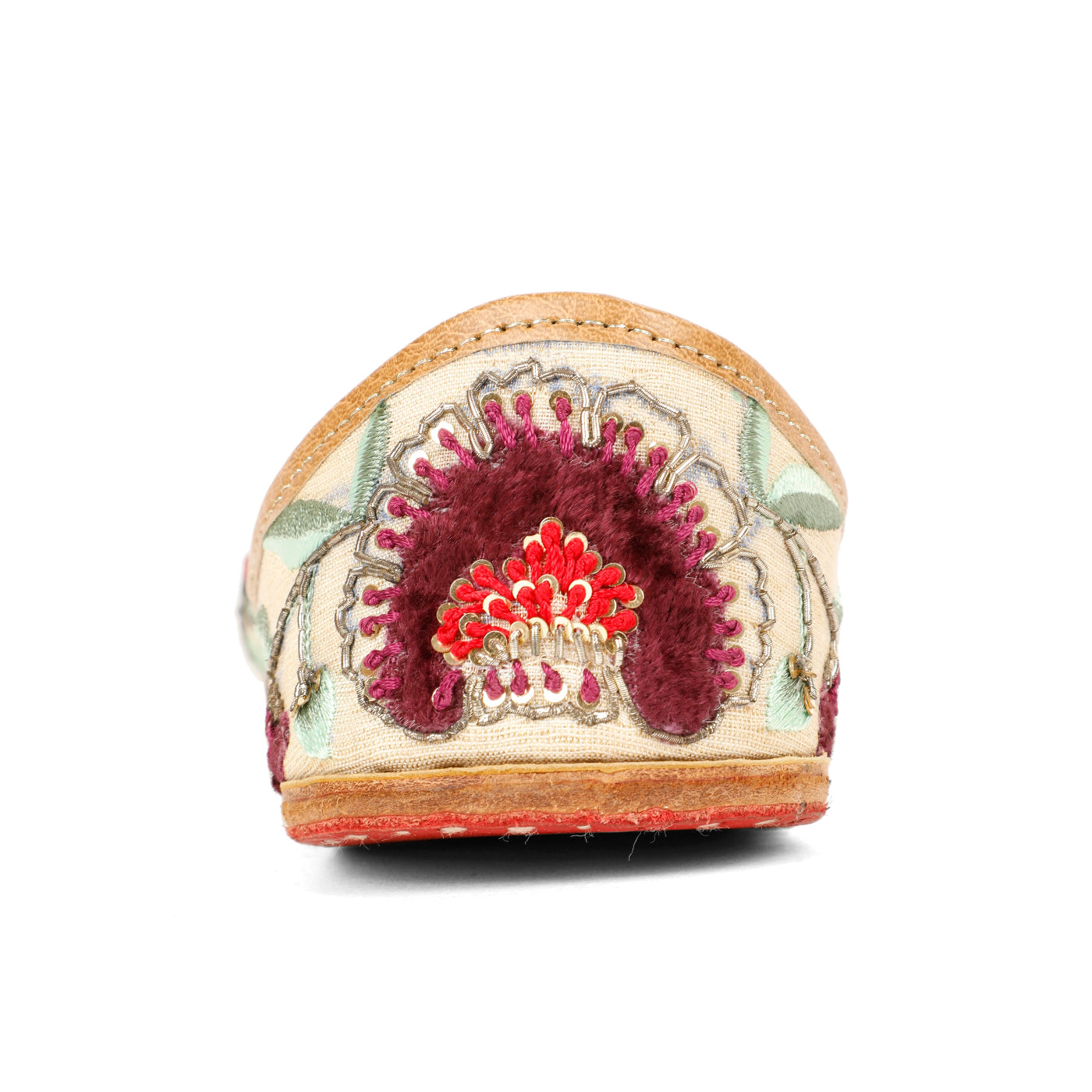 Graceful, refined, and steeped in tradition, the Gulrez Jutti is crafted for moments that call for timeless elegance. Set on a soft ivory-beige base, this handcrafted jutti features exquisite floral embroidery in deep wine and crimson hues, complemented by soothing sage-green leaves and delicate metallic accents. The intricate detailing brings a regal charm, while the cushioned leather lining and hand-stitched sole ensure all-day comfort. Perfect for weddings, festive soirées, and elegant celebrations, this jutti pairs beautifully with both classic and contemporary ethnic wear.
