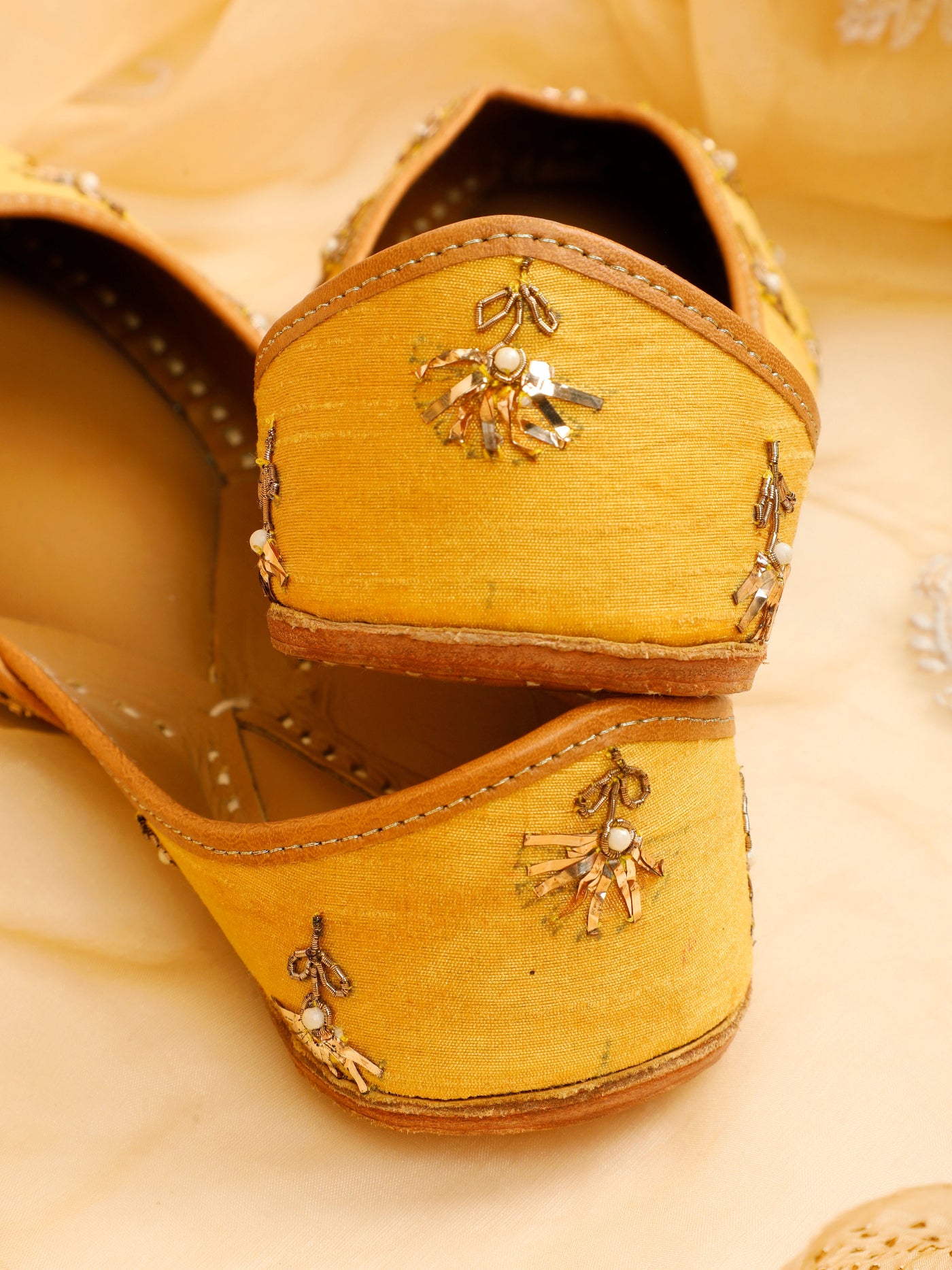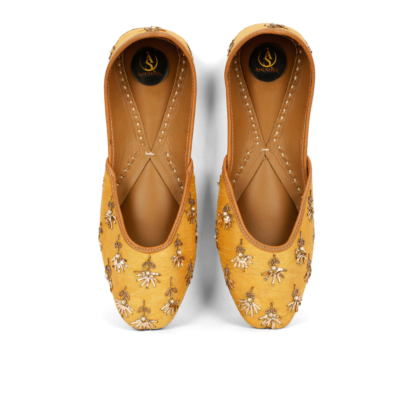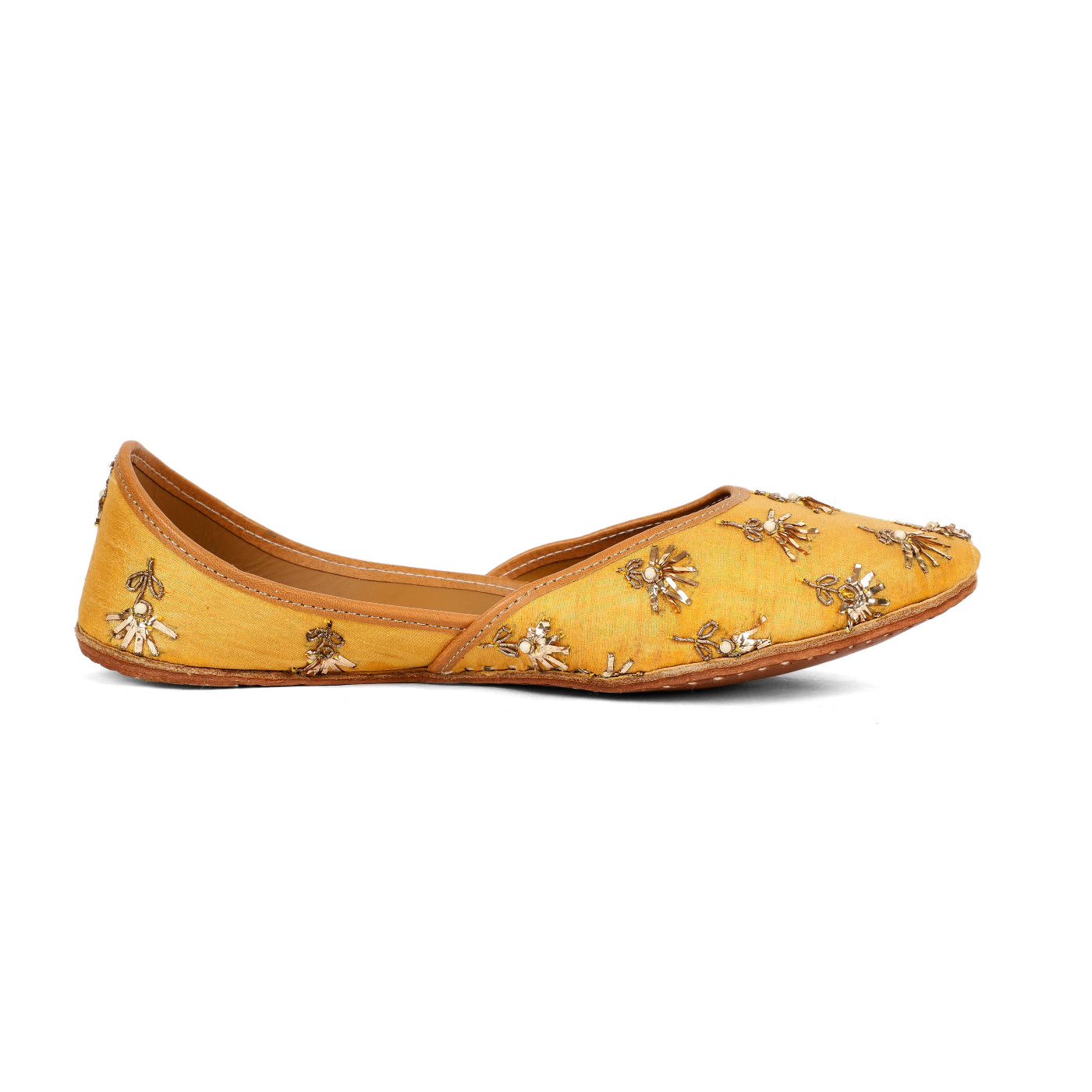 Illuminate your festive look with the timeless charm of our Fawn Jutti. Crafted in a rich golden-yellow fabric, this jutti is delicately embellished with hand-embroidered bead and Mukesh work motifs that shimmer beautifully with every step. The subtle sparkle adds a refined elegance, making it perfect for both daytime celebrations and evening festivities.