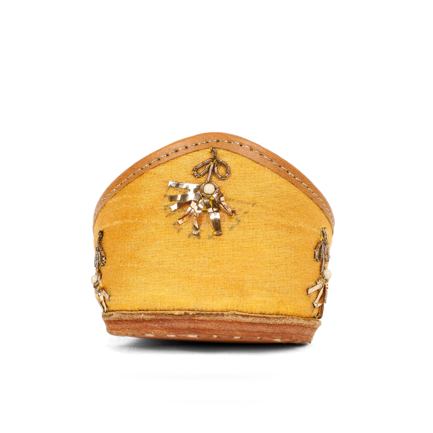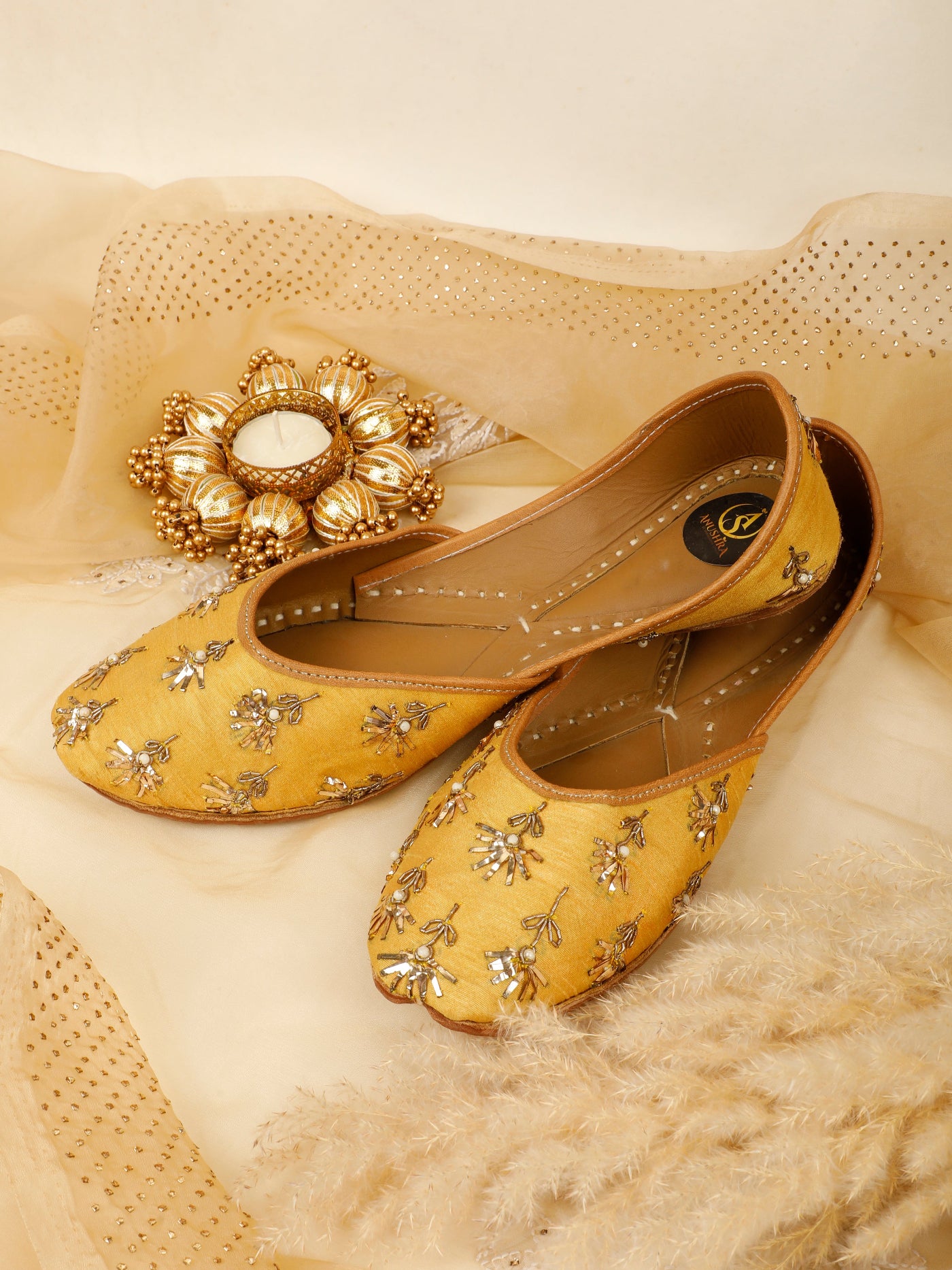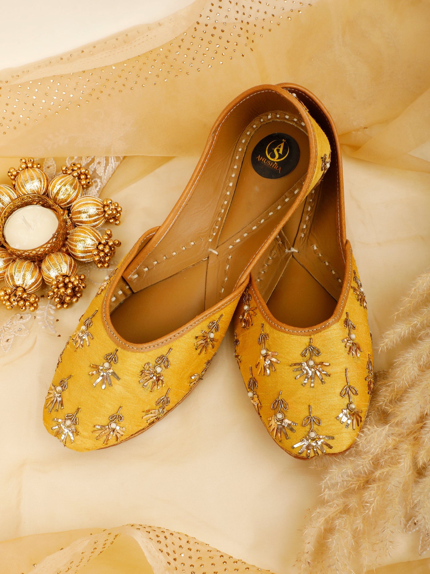 Illuminate your festive look with the timeless charm of our Fawn Jutti. Crafted in a rich golden-yellow fabric, this jutti is delicately embellished with hand-embroidered bead and Mukesh work motifs that shimmer beautifully with every step. The subtle sparkle adds a refined elegance, making it perfect for both daytime celebrations and evening festivities.