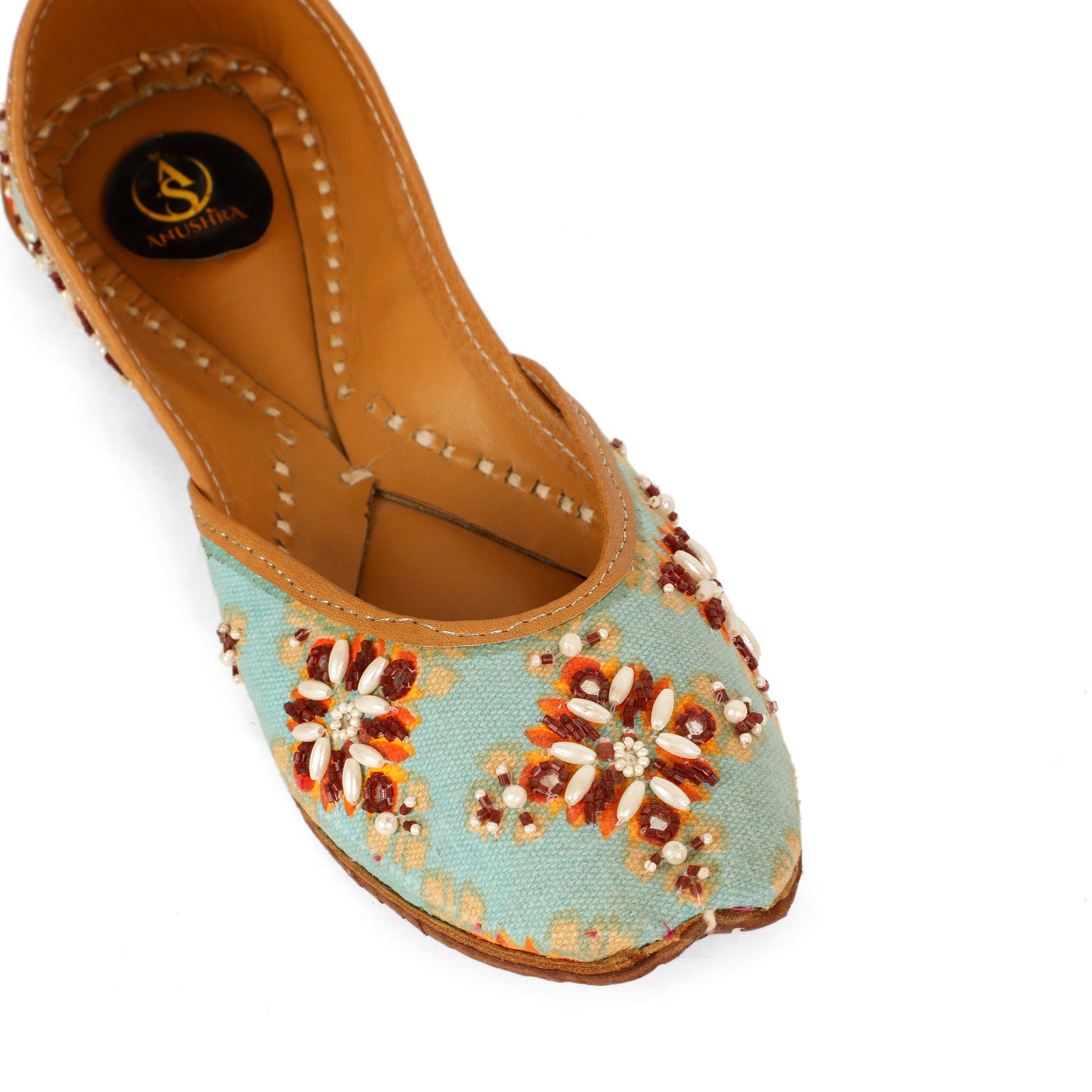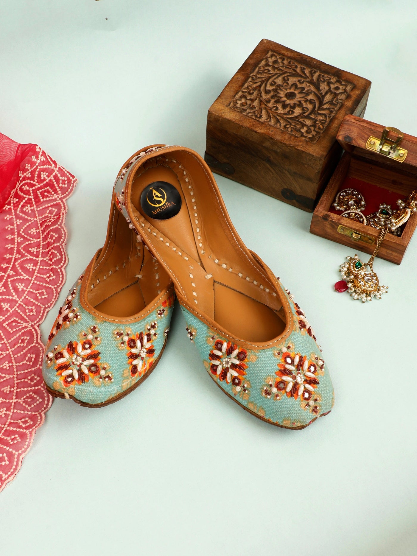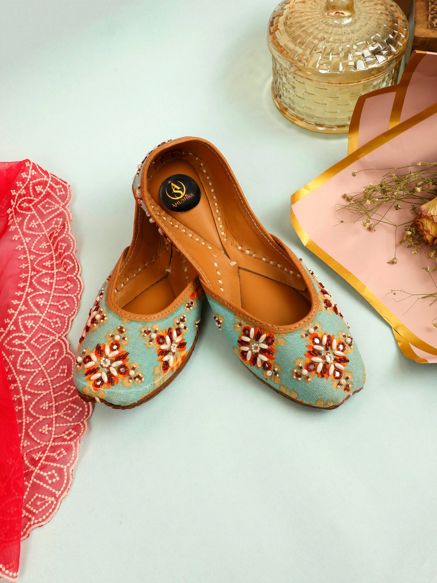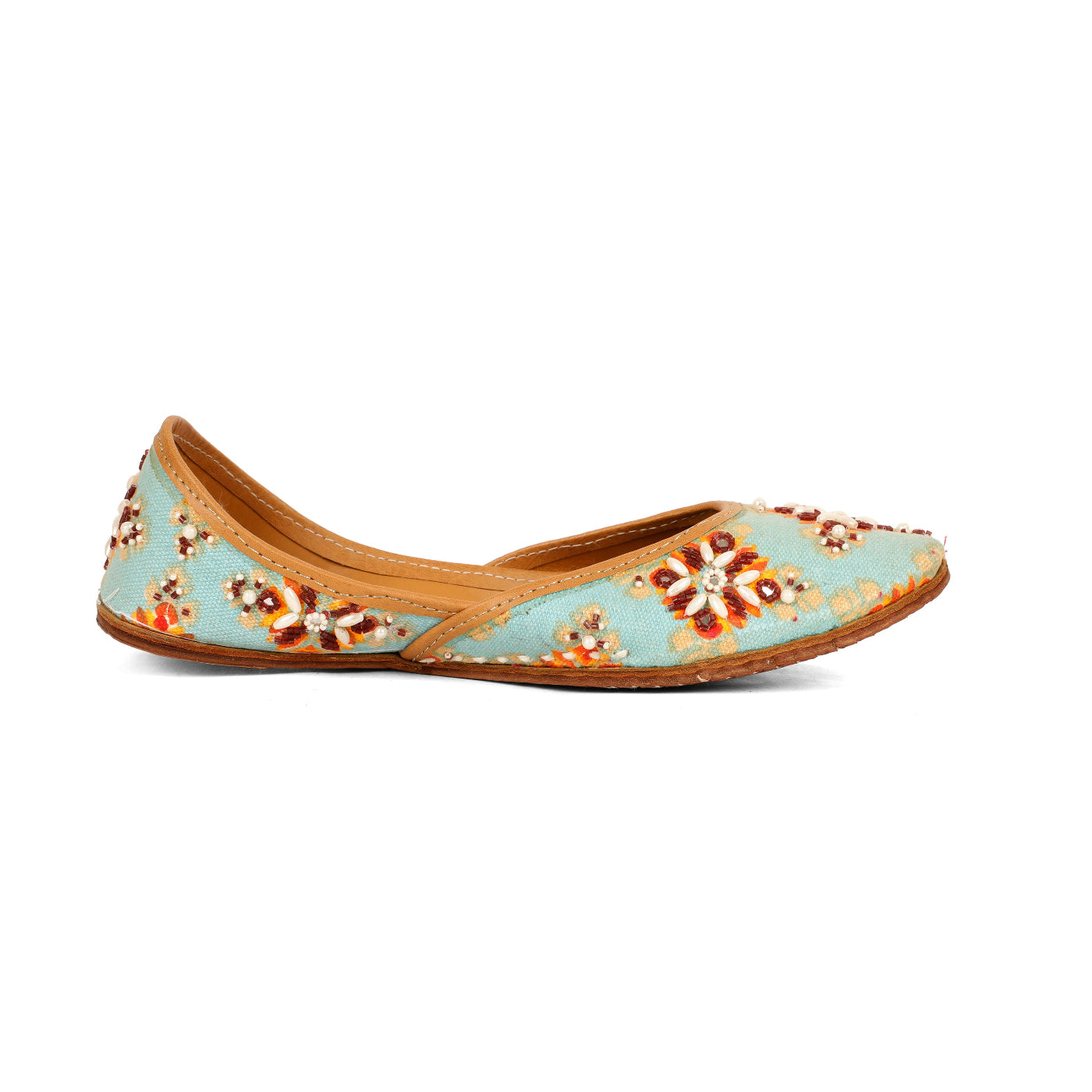 Bring festive elegance to your every step with our Mehfil  Jutti. Set on a refreshing aqua base, this jutti is beautifully hand-embellished with floral motifs in warm hues of rust, ivory, and gold beads. The intricate craftsmanship adds a joyful charm, while the soft leather lining ensures comfort throughout the day. Perfect for celebrations, daytime weddings, and ethnic gatherings, this pair effortlessly blends vibrancy with tradition.