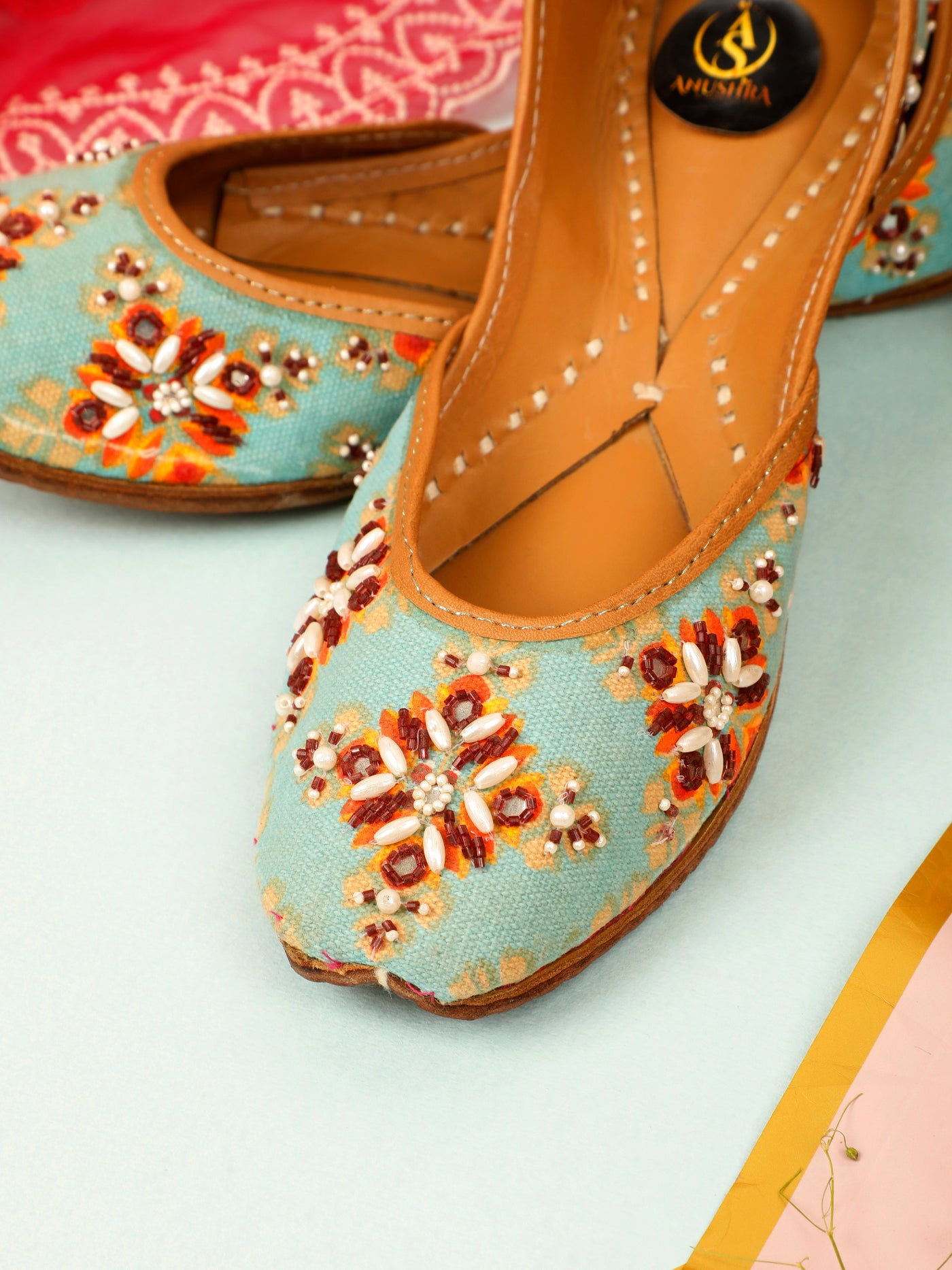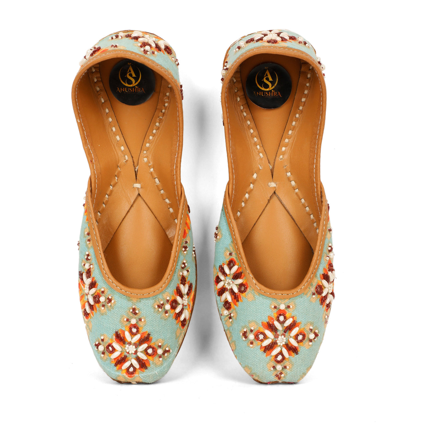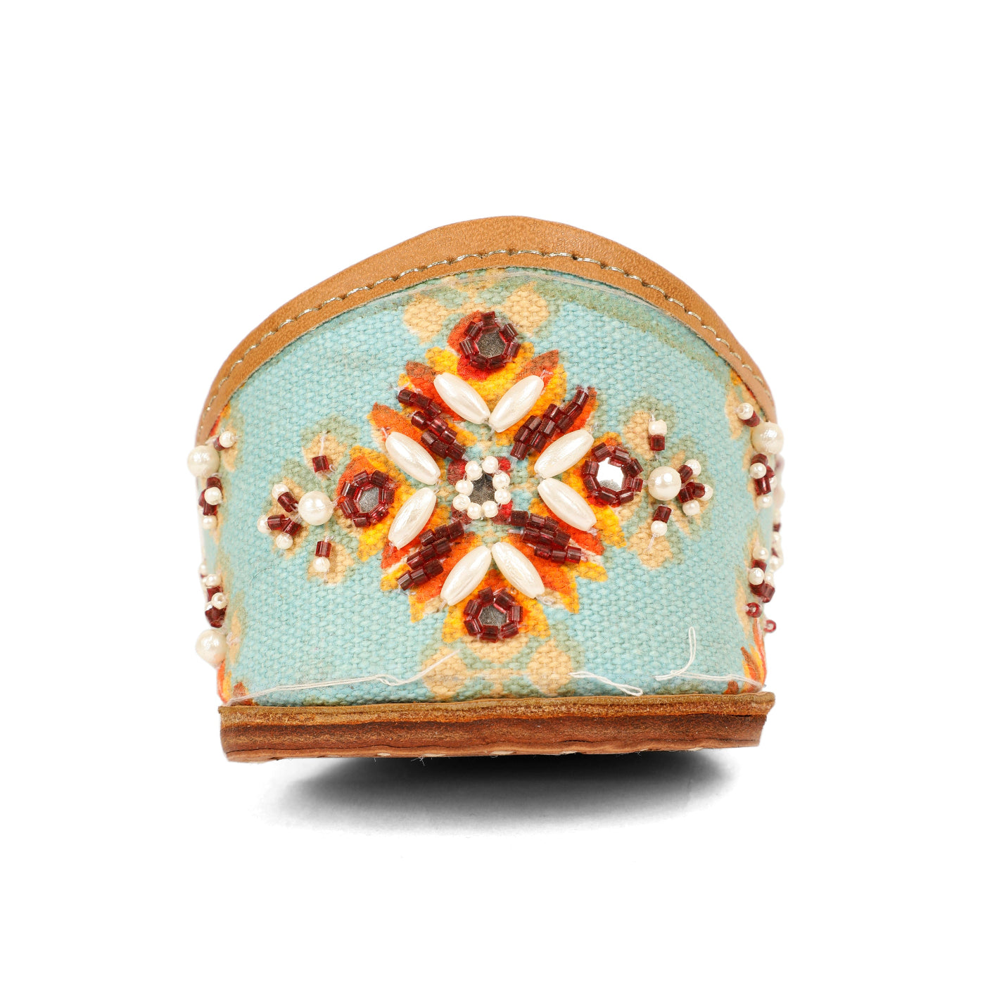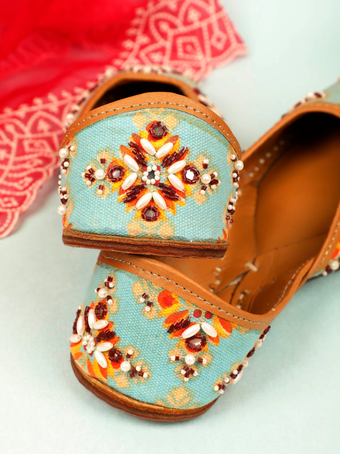Bring festive elegance to your every step with our Mehfil  Jutti. Set on a refreshing aqua base, this jutti is beautifully hand-embellished with floral motifs in warm hues of rust, ivory, and gold beads. The intricate craftsmanship adds a joyful charm, while the soft leather lining ensures comfort throughout the day. Perfect for celebrations, daytime weddings, and ethnic gatherings, this pair effortlessly blends vibrancy with tradition.