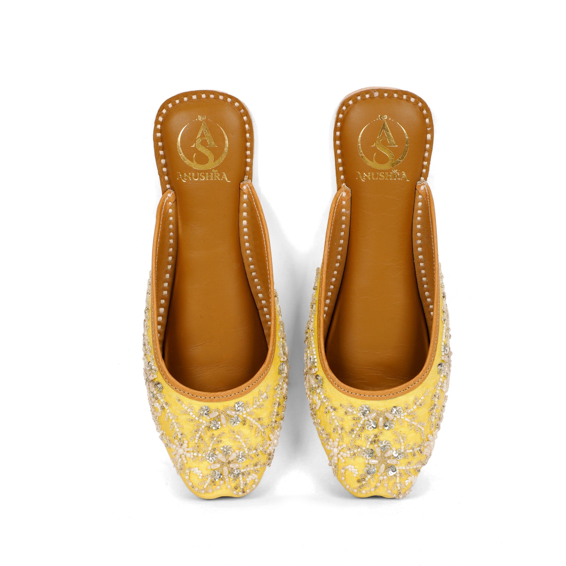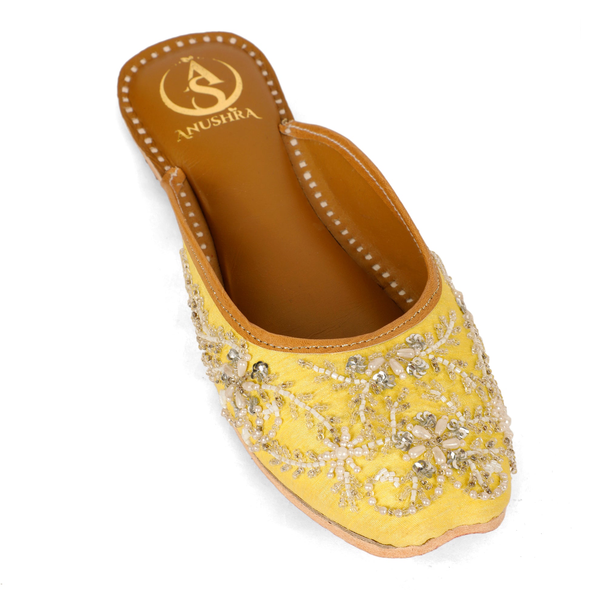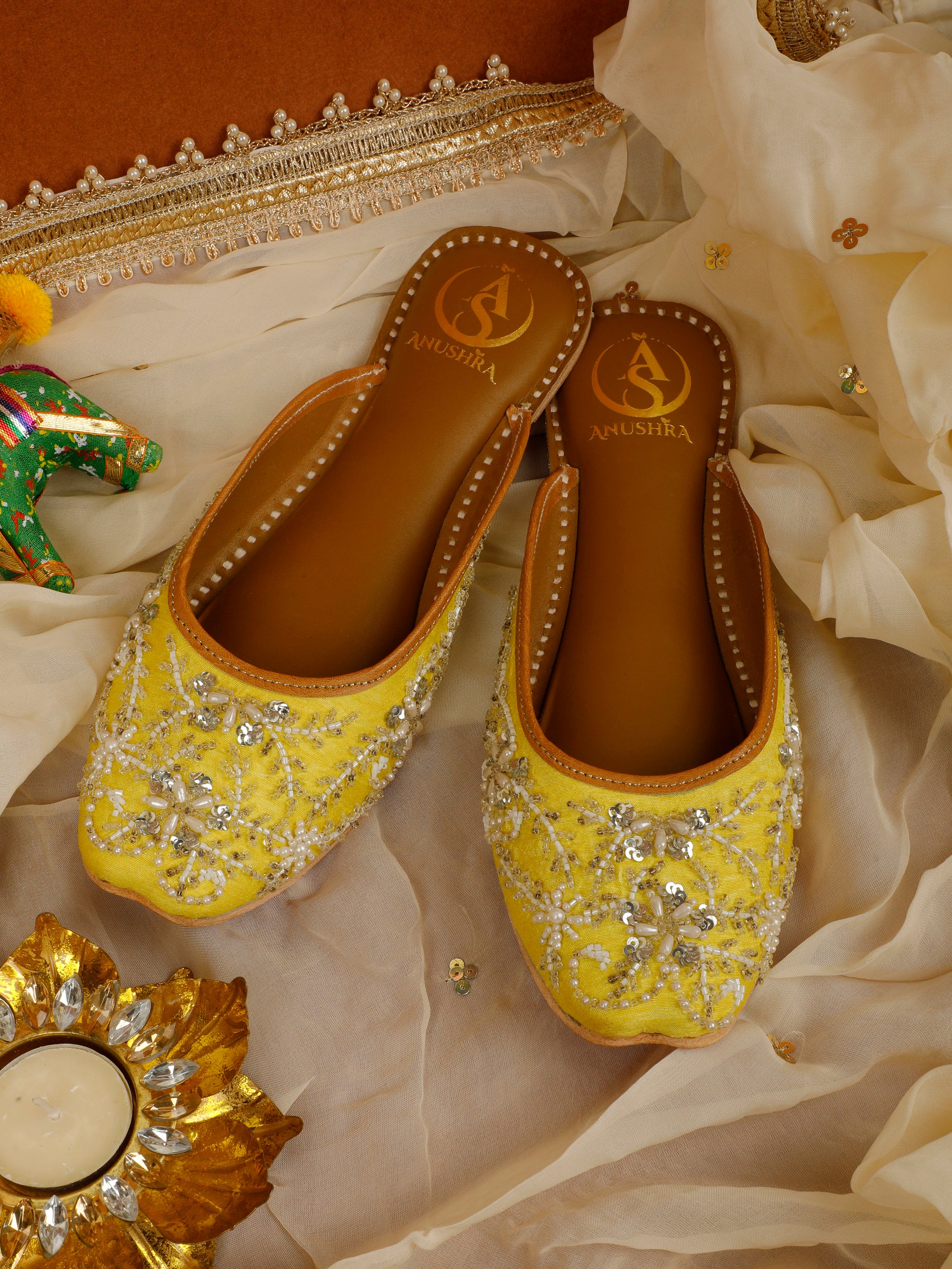 Radiating warmth and festive charm, the Jhoomar Half Jutti is a celebration of refined craftsmanship. Drenched in a soft kesar yellow hue, this half jutti features intricate hand embroidery embellished with delicate pearls, beads, and shimmering sequins that catch the light beautifully.Designed with a comfortable cushioned sole and an easy slip-on open back, it blends effortless wearability with regal aesthetics. The detailed floral patterns lend it a luxurious touch, making it an exquisite choice for weddings, haldi ceremonies, festive occasions, and traditional celebrations.