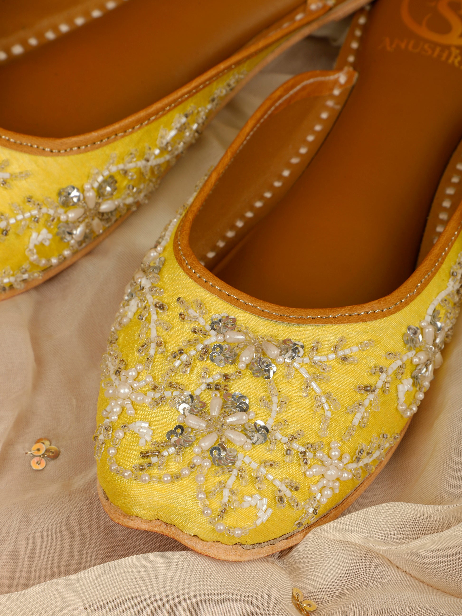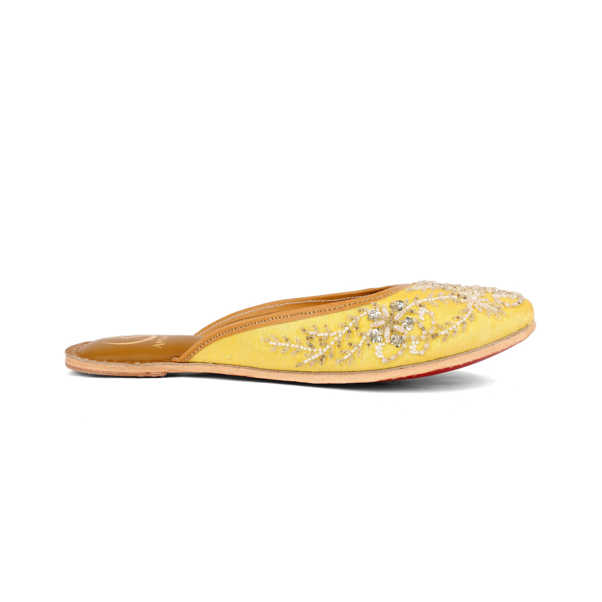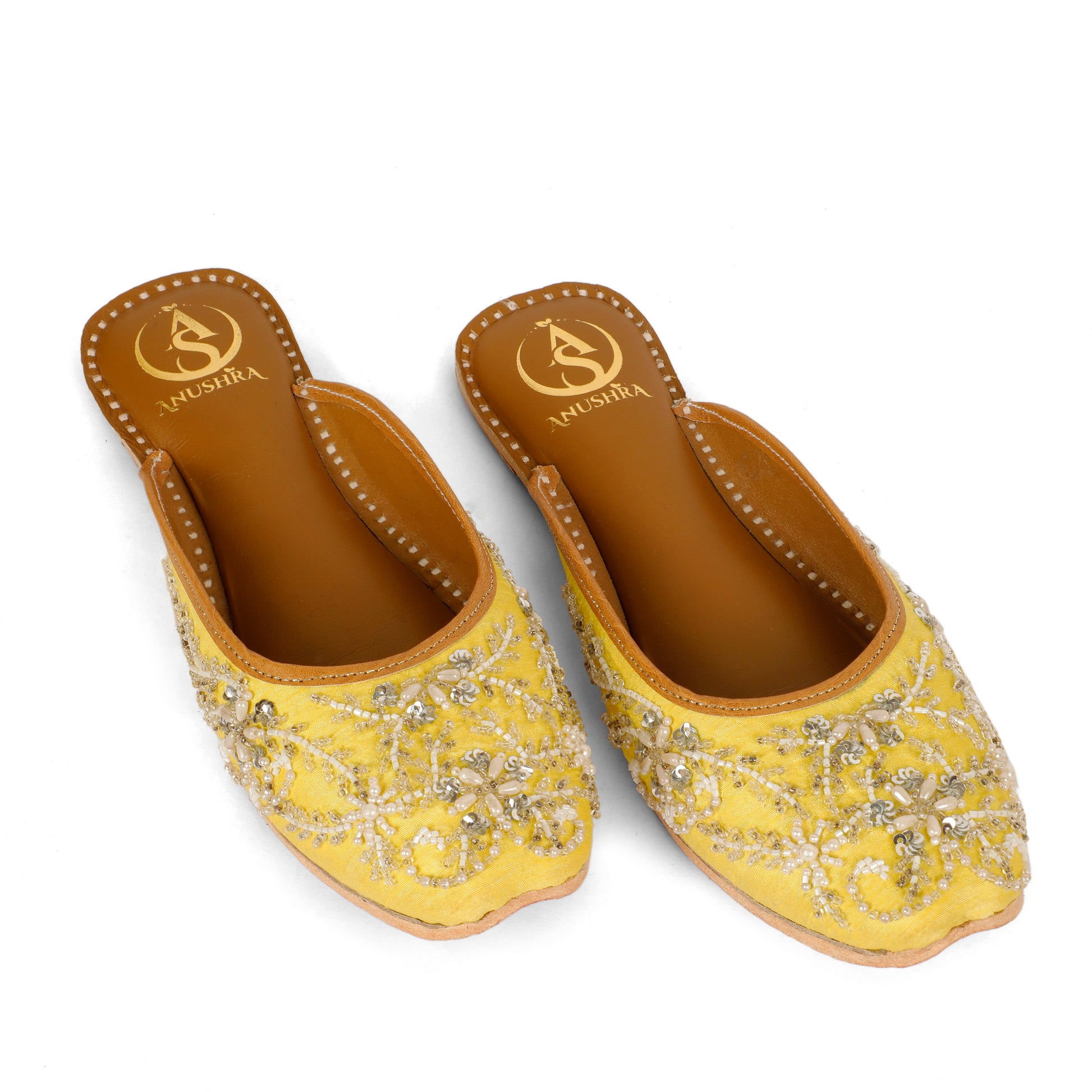 Radiating warmth and festive charm, the Jhoomar Half Jutti is a celebration of refined craftsmanship. Drenched in a soft kesar yellow hue, this half jutti features intricate hand embroidery embellished with delicate pearls, beads, and shimmering sequins that catch the light beautifully.Designed with a comfortable cushioned sole and an easy slip-on open back, it blends effortless wearability with regal aesthetics. The detailed floral patterns lend it a luxurious touch, making it an exquisite choice for weddings, haldi ceremonies, festive occasions, and traditional celebrations.