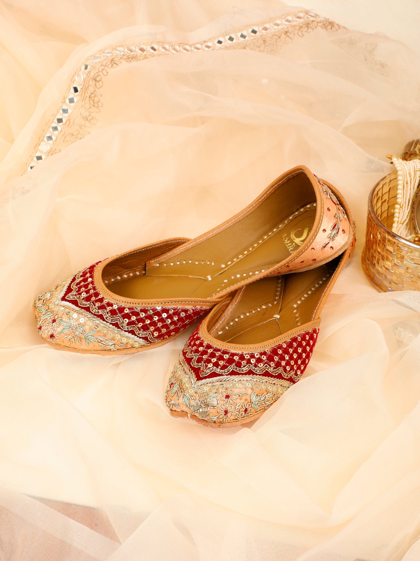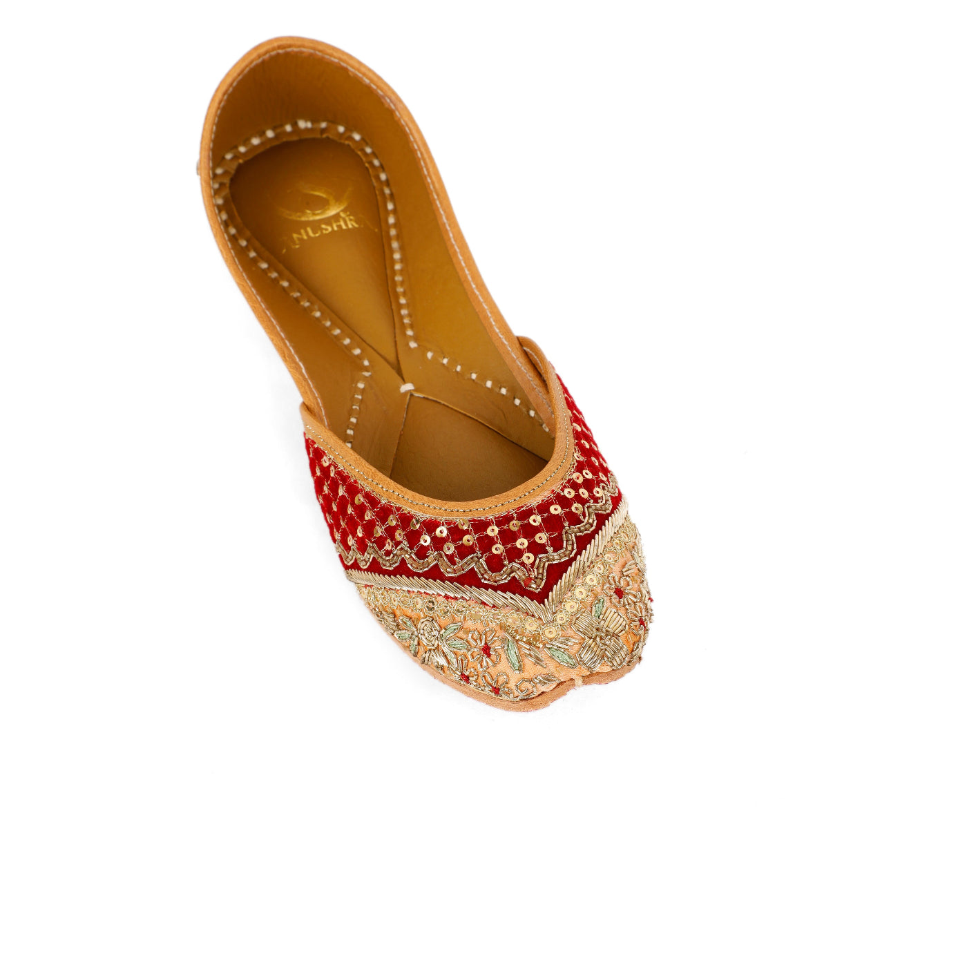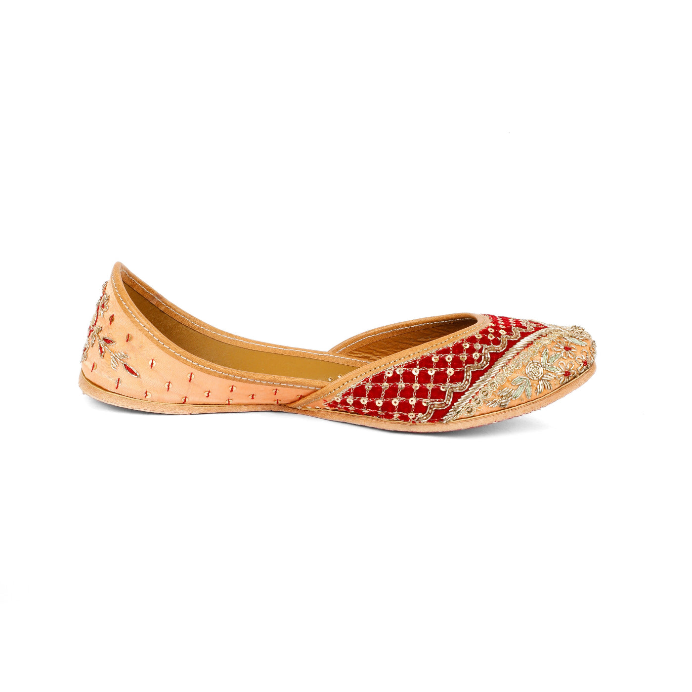 Finished with a soft cushioned insole and a classic jutti silhouette, it offers comfort without compromising on grandeur. Perfect for weddings, receptions, and festive soirées, this jutti pairs beautifully with lehengas, silk sarees, and heavy ethnic ensembles.