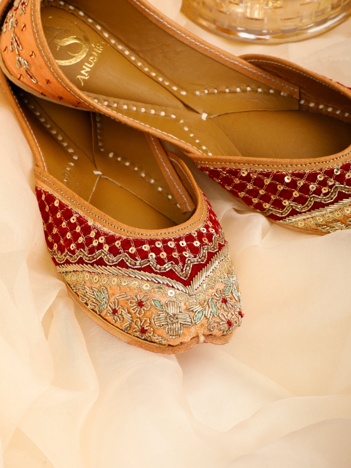Step into regal elegance with our Noor Jutti, a celebration of heritage craftsmanship. Designed on a rich maroon and peach base, this jutti features intricate zardozi embroidery highlighted with sequins, metallic threads, and delicate hand detailing. The layered patterns and refined borders create a striking contrast, giving it a luxurious, bridal-ready appeal.