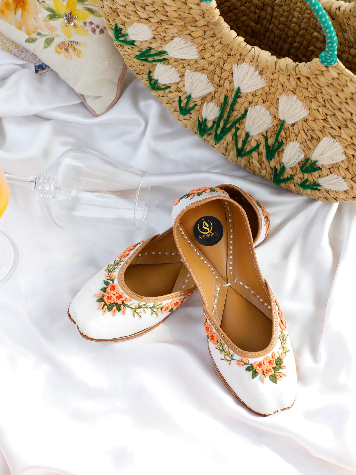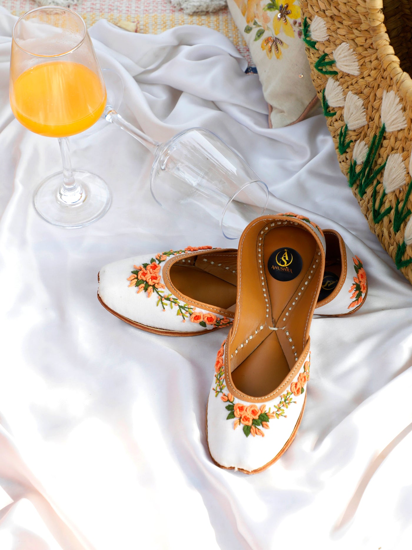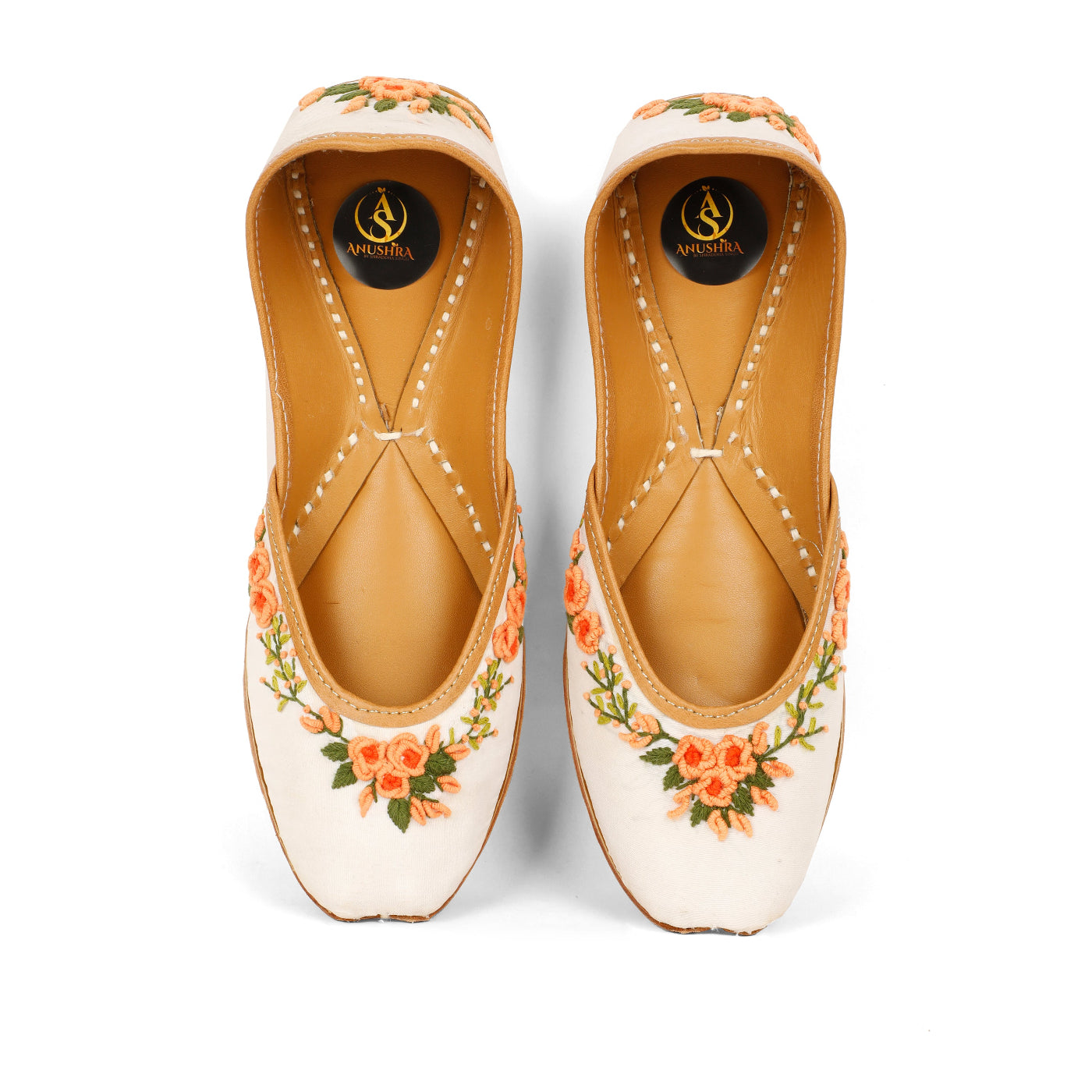 Delicate, fresh, and effortlessly elegant — the Gulnaar Jutti is crafted on a pristine white base and adorned with fine floral embroidery in soft peach and green tones. Inspired by blooming summer gardens and leisurely festive mornings, this jutti brings a subtle charm to your ethnic wardrobe. The cushioned leather sole ensures comfort, making it perfect for long celebrations, brunches, and intimate gatherings.