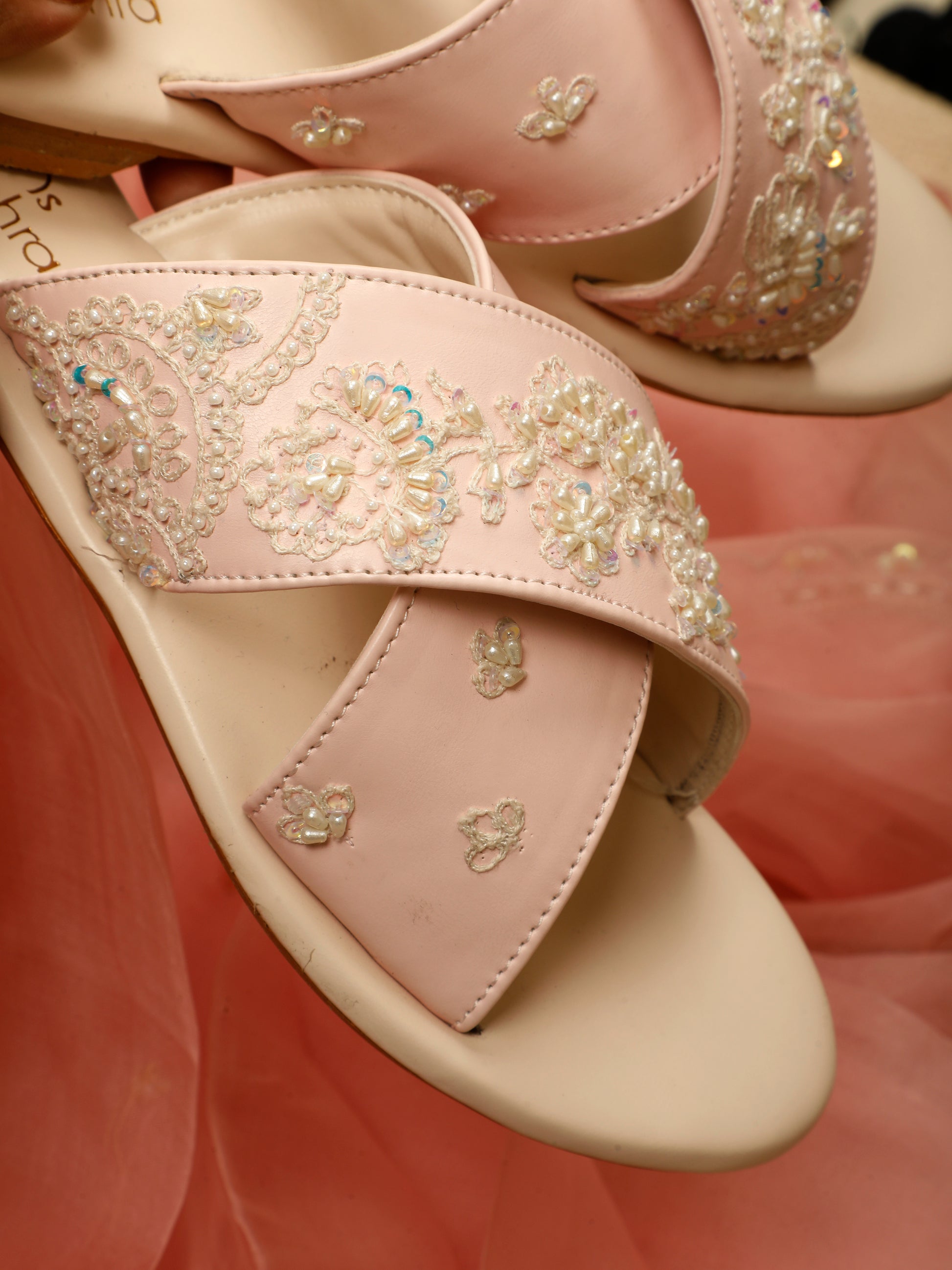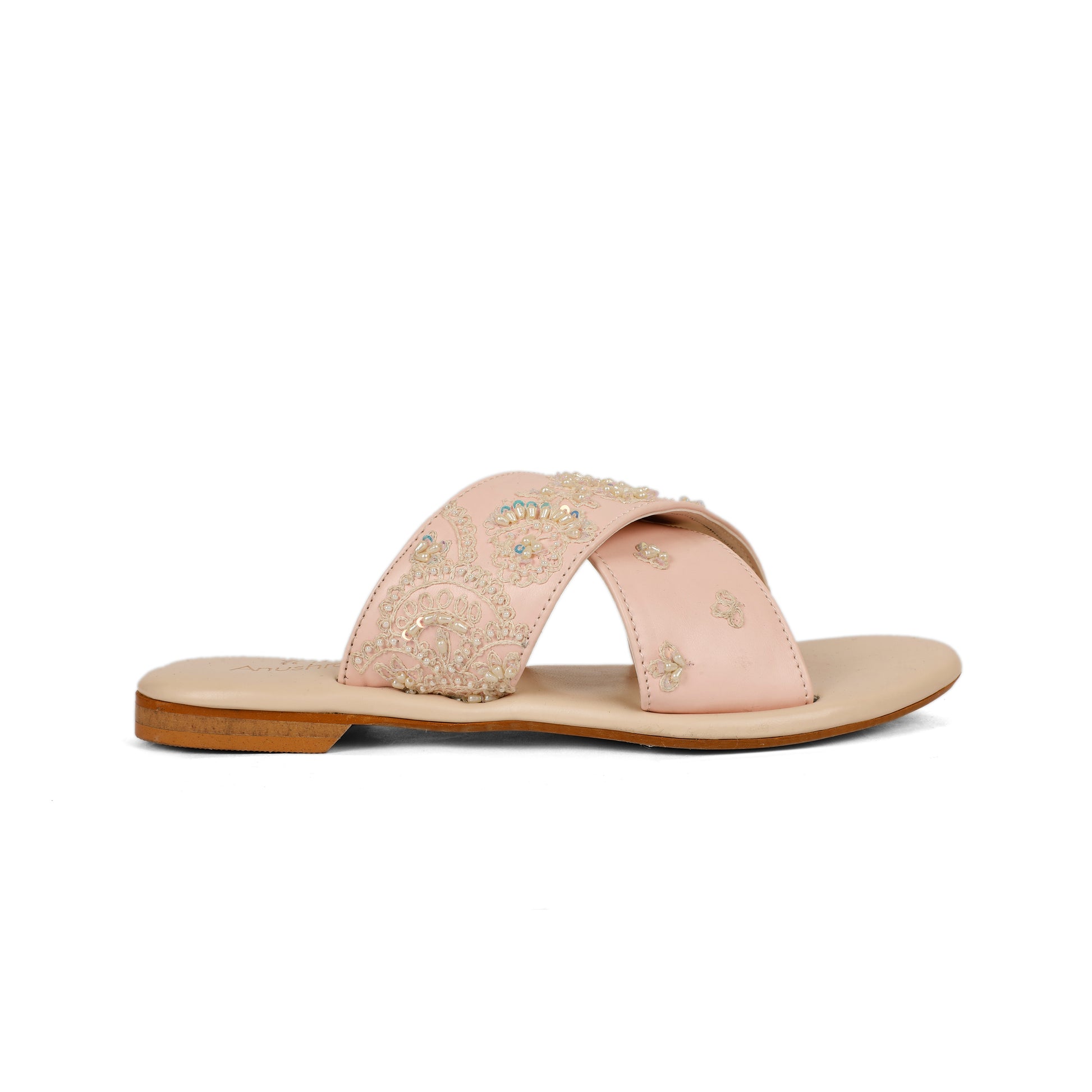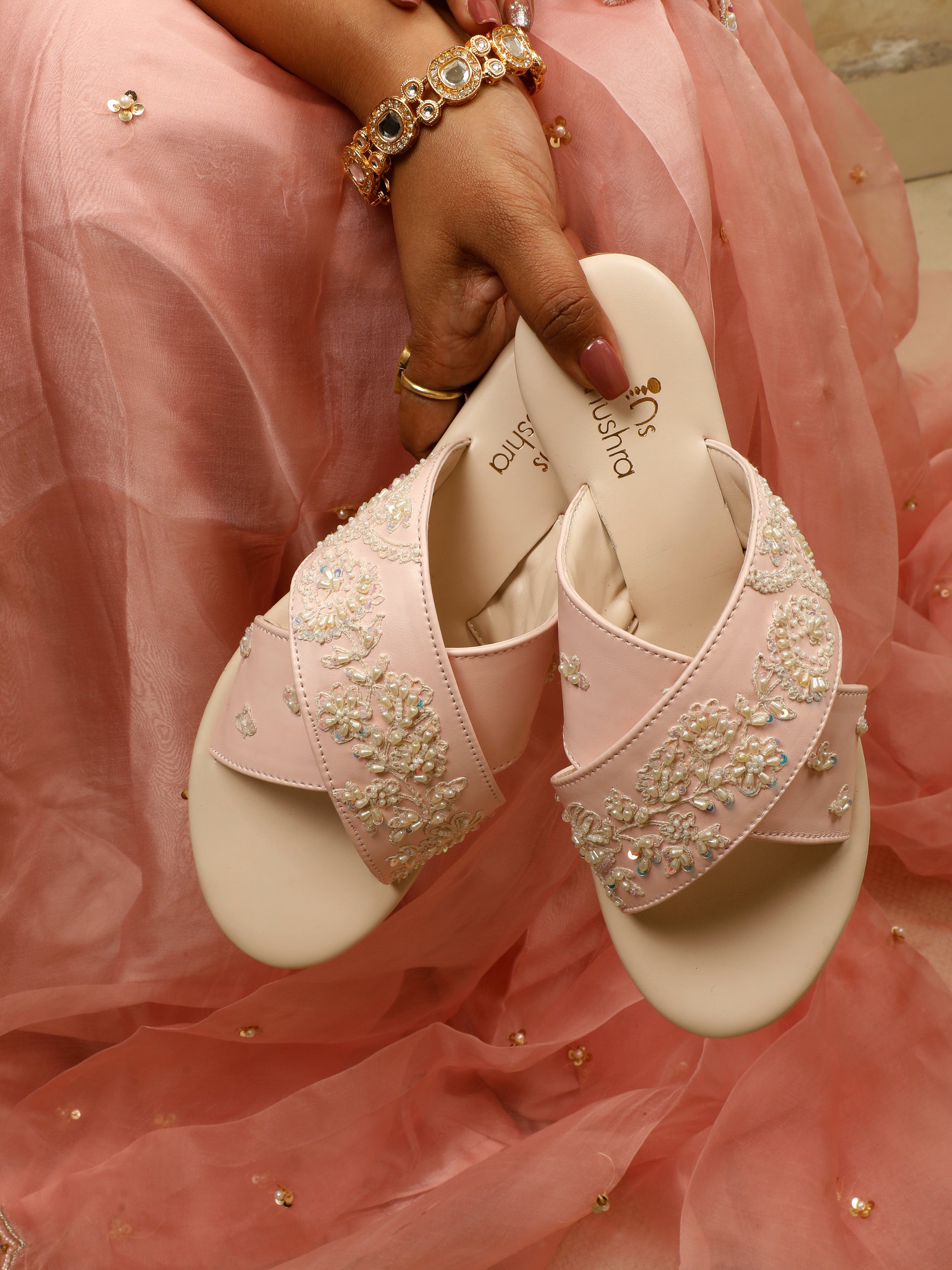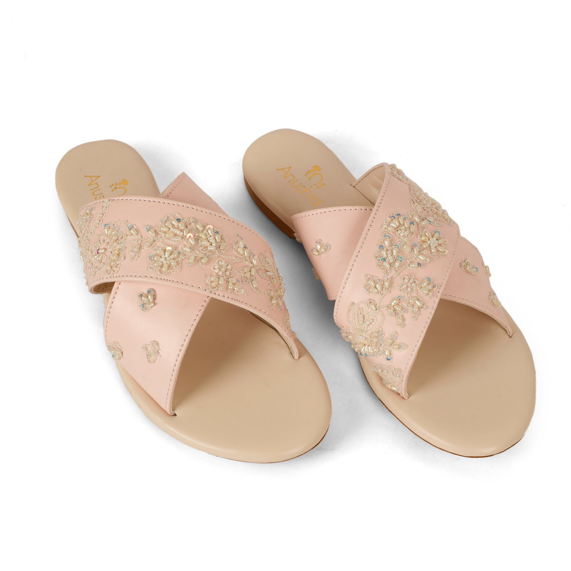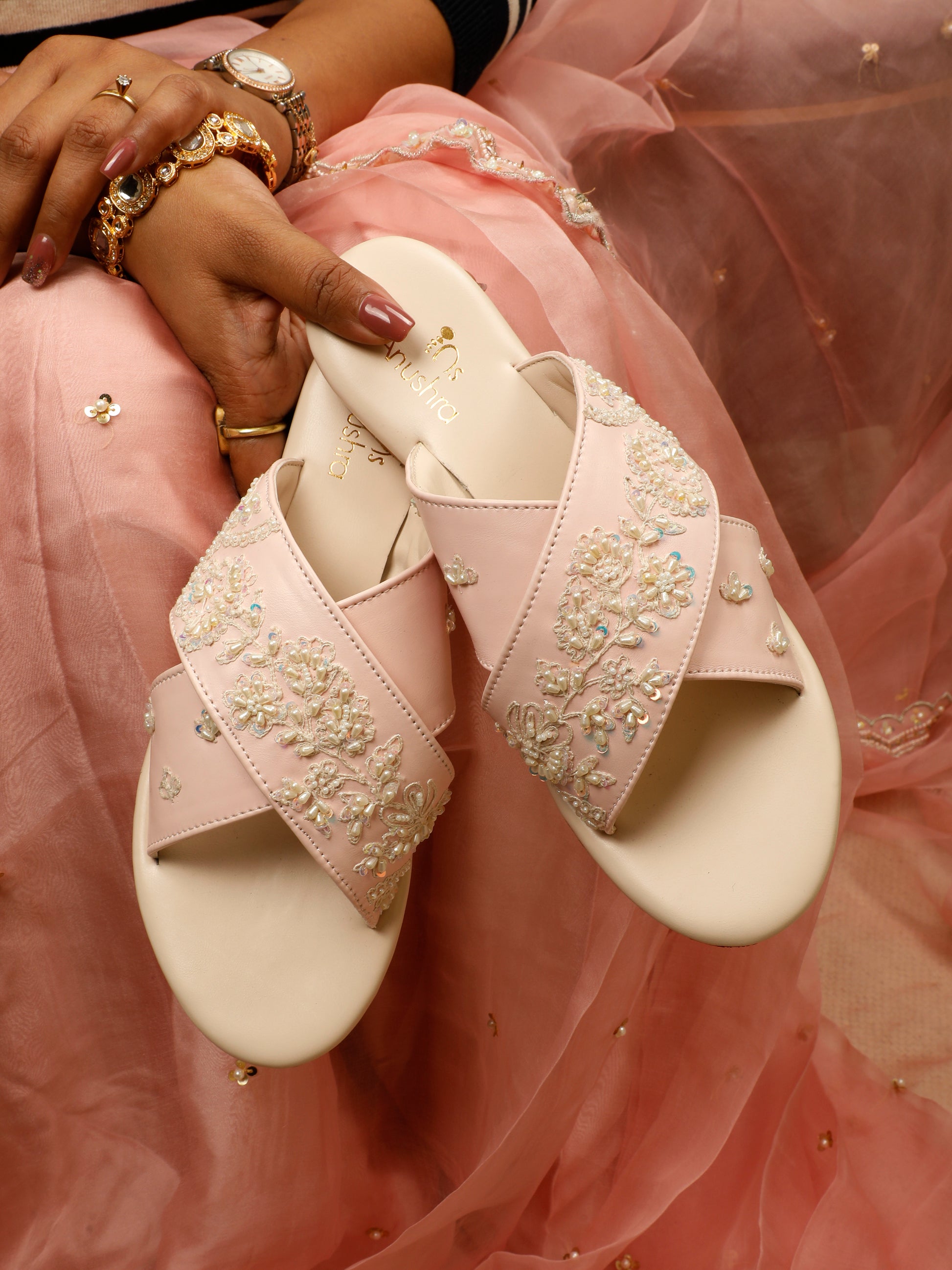 Delicate, graceful, and effortlessly chic Pearl Criss-Cross Sliders are crafted for moments that call for subtle luxury. Featuring soft blush straps adorned with intricate pearl and sequin floral embroidery, this design exudes timeless elegance. The criss-cross silhouette provides a flattering fit, while the cushioned ivory sole ensures comfort with every step. Perfect for weddings, festive gatherings, or elegant daywear, these sliders pair beautifully with lehengas, sarees, and pastel ensembles.
