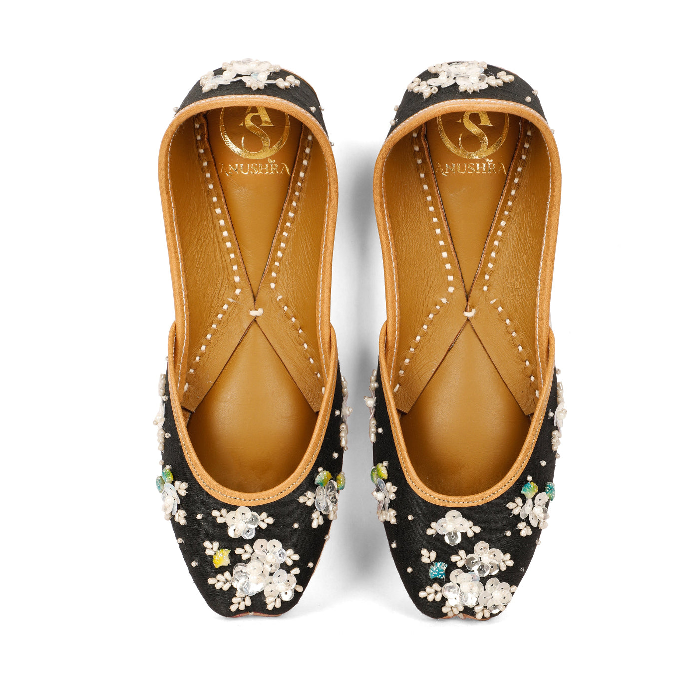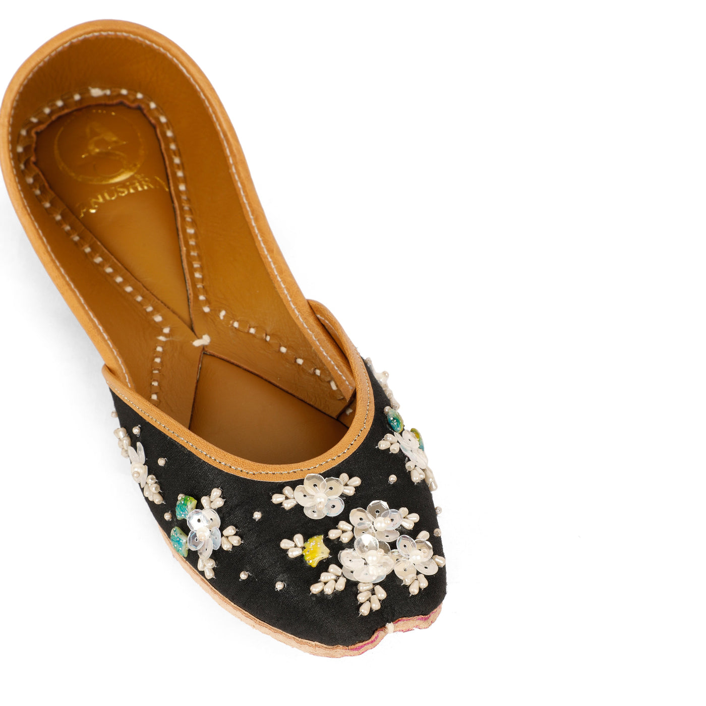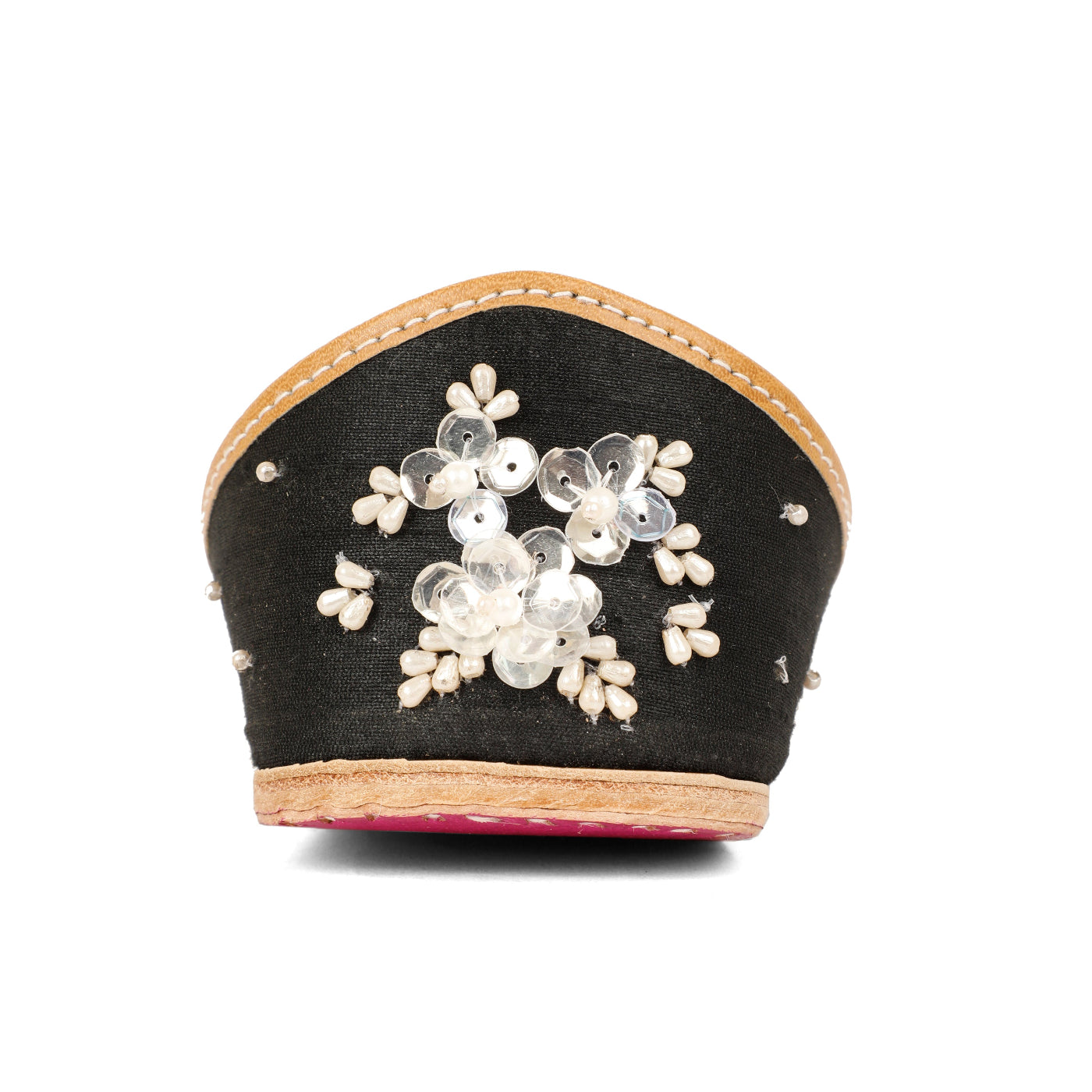 Elegant with a hint of charm, the Ruh  Jutti is designed for those who love subtle luxury. Crafted on a deep black base, this jutti features delicate hand-embroidered floral motifs adorned with pearls, sequins, and soft pastel accents that beautifully stand out against the dark canvas.