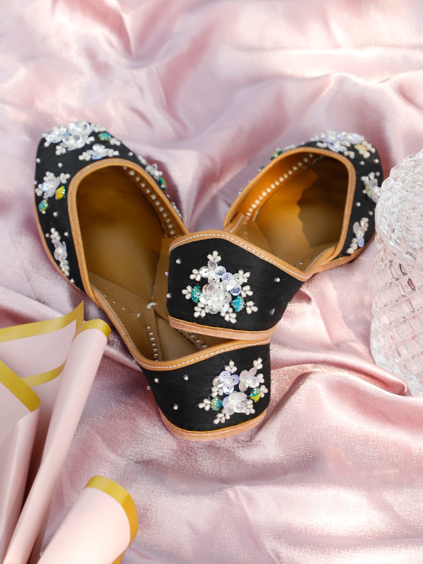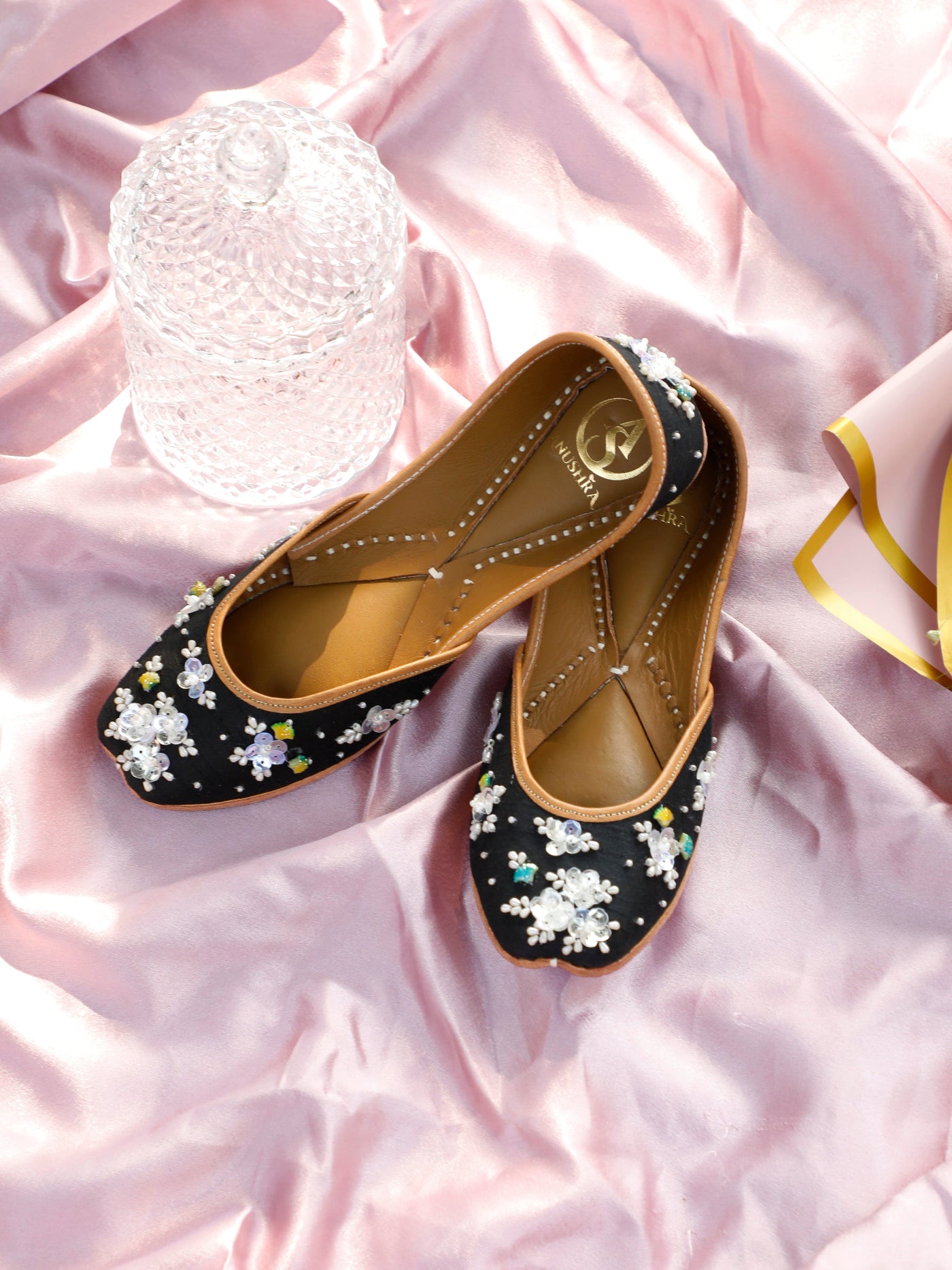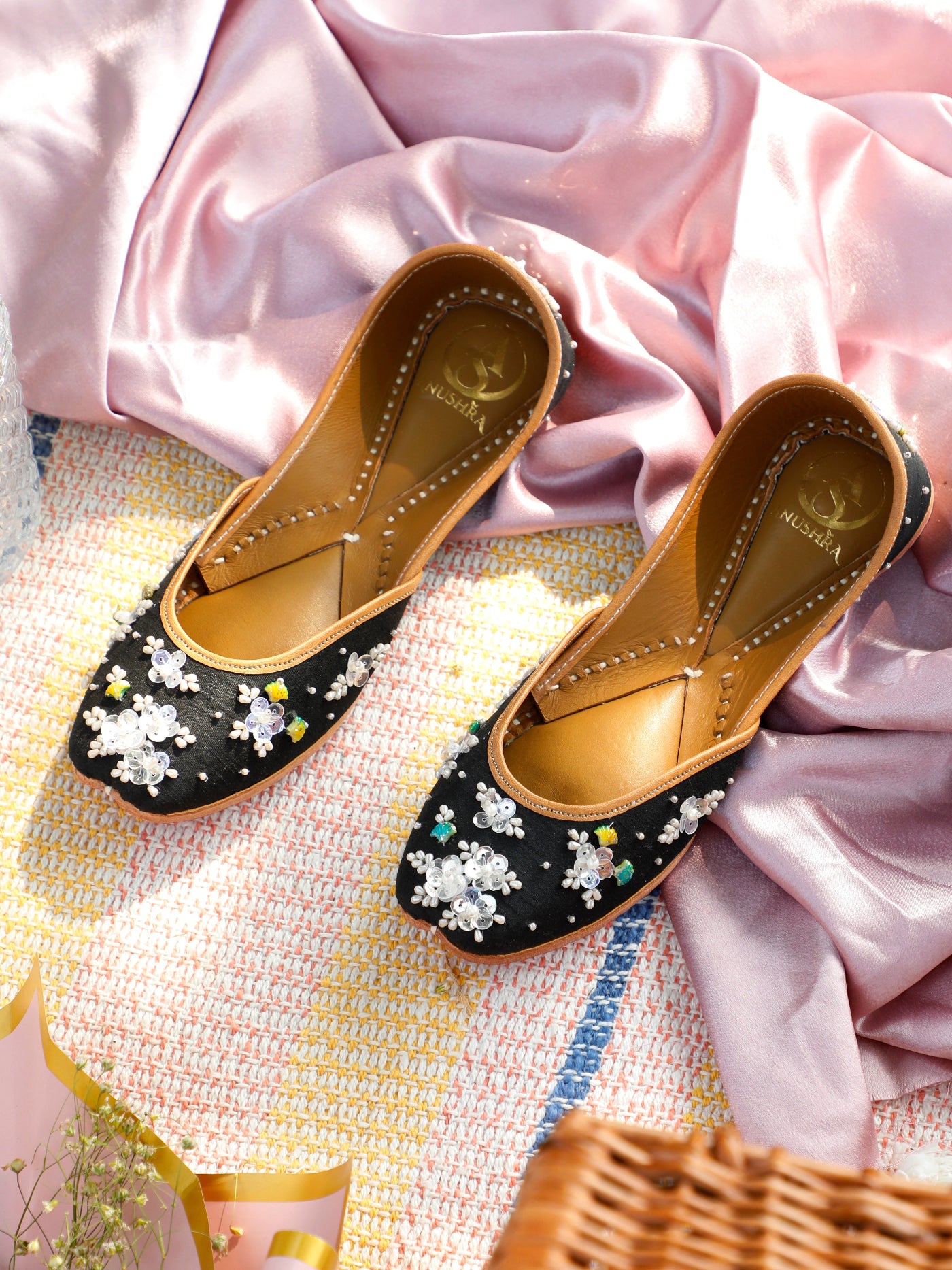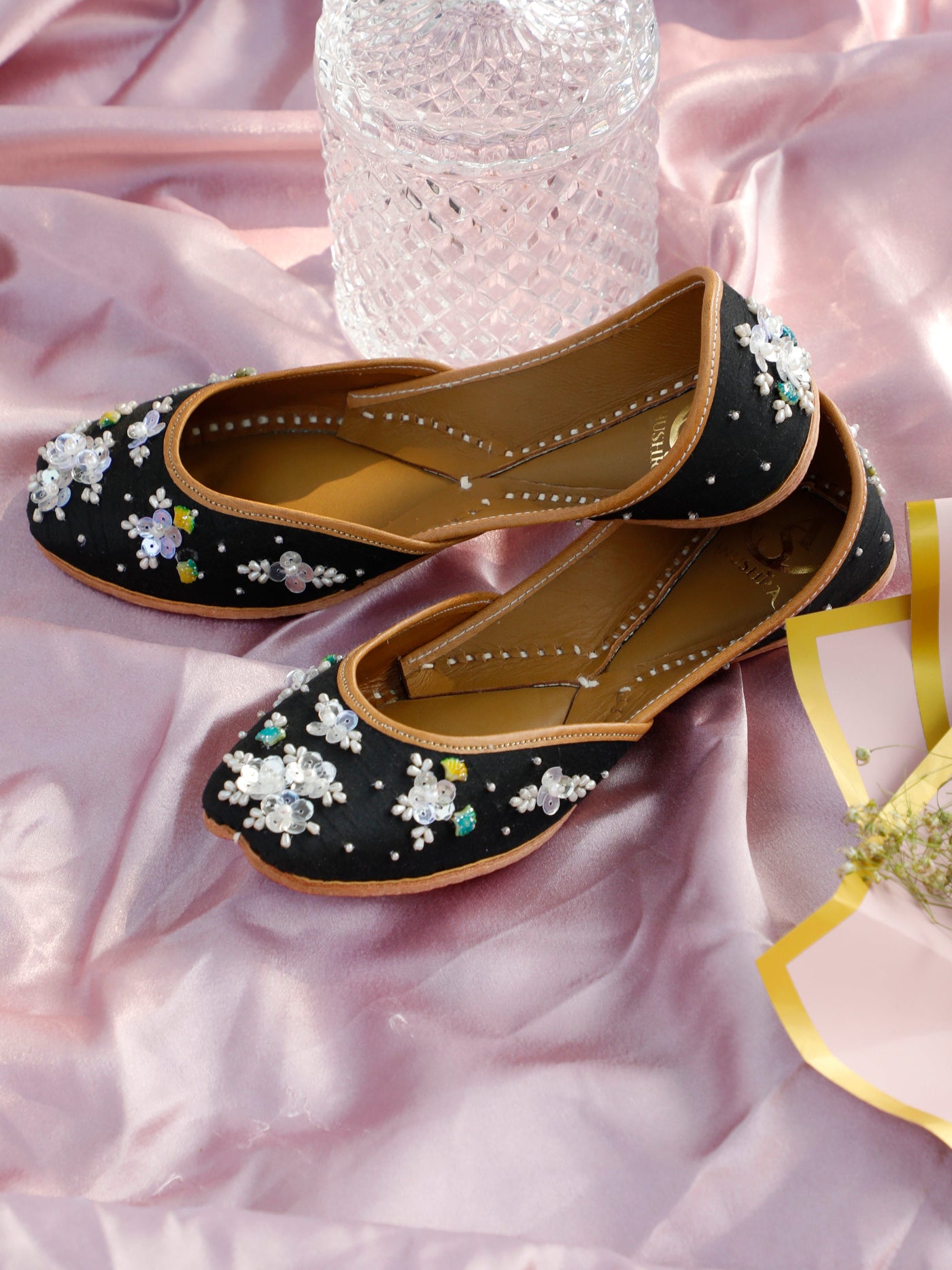Elegant with a hint of charm, the Ruh  Jutti is designed for those who love subtle luxury. Crafted on a deep black base, this jutti features delicate hand-embroidered floral motifs adorned with pearls, sequins, and soft pastel accents that beautifully stand out against the dark canvas.