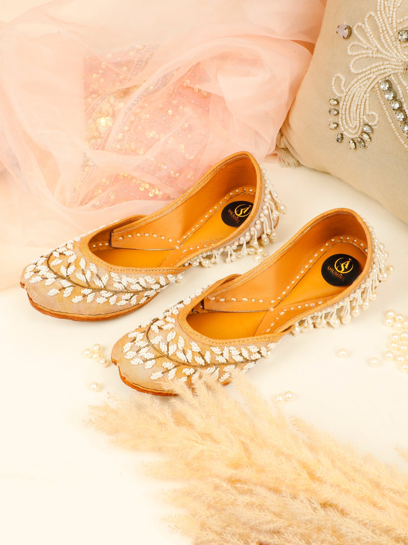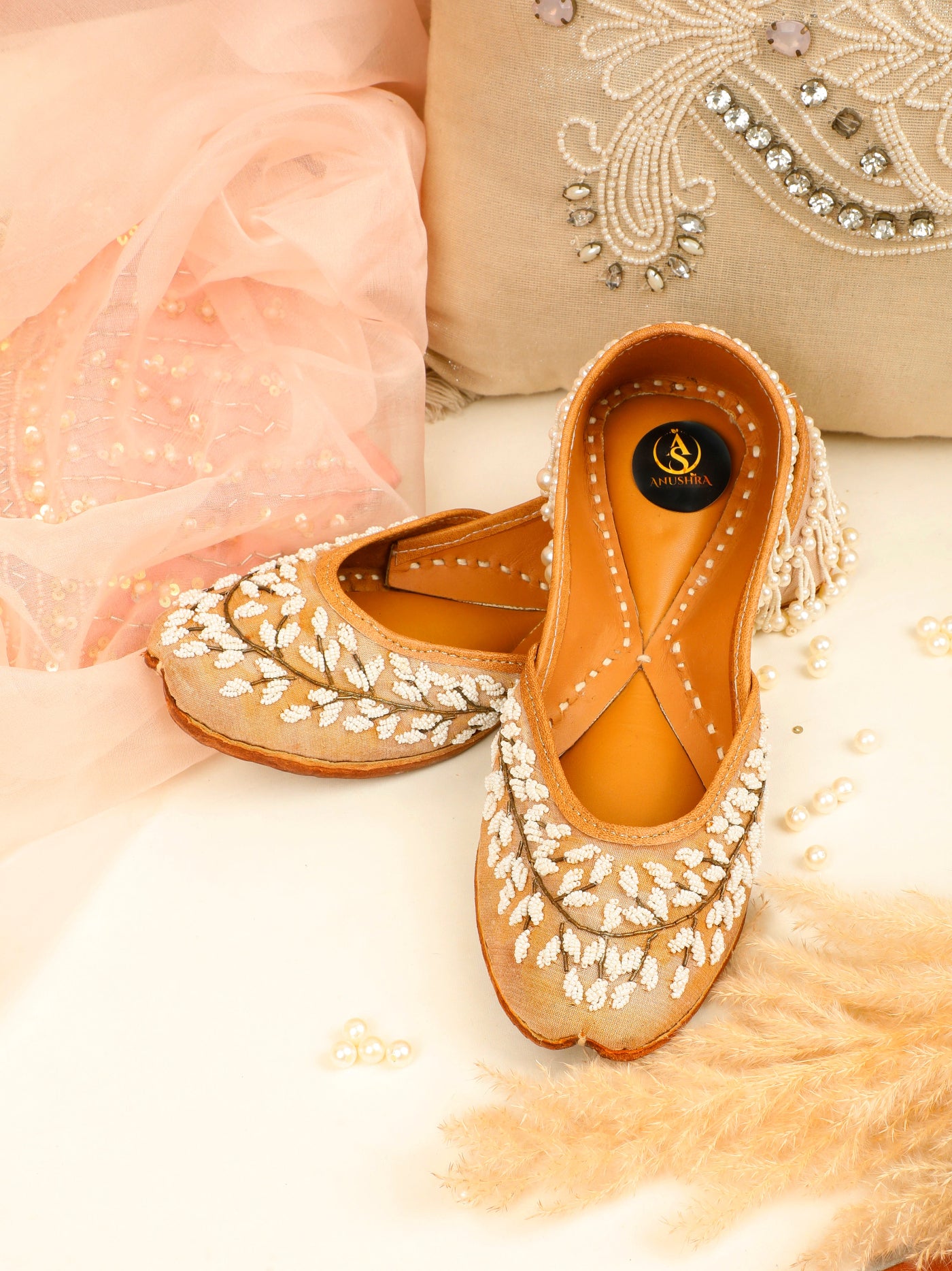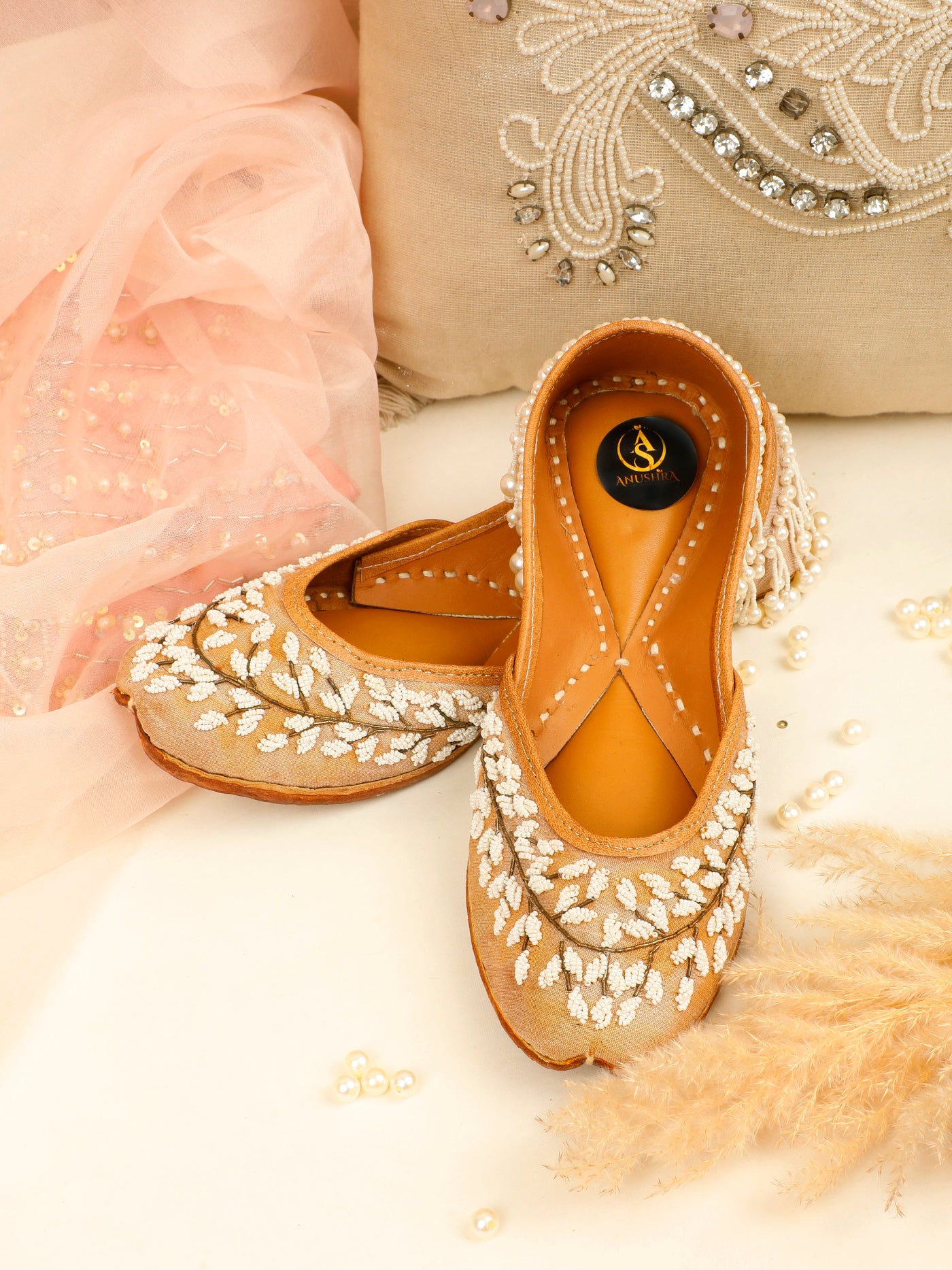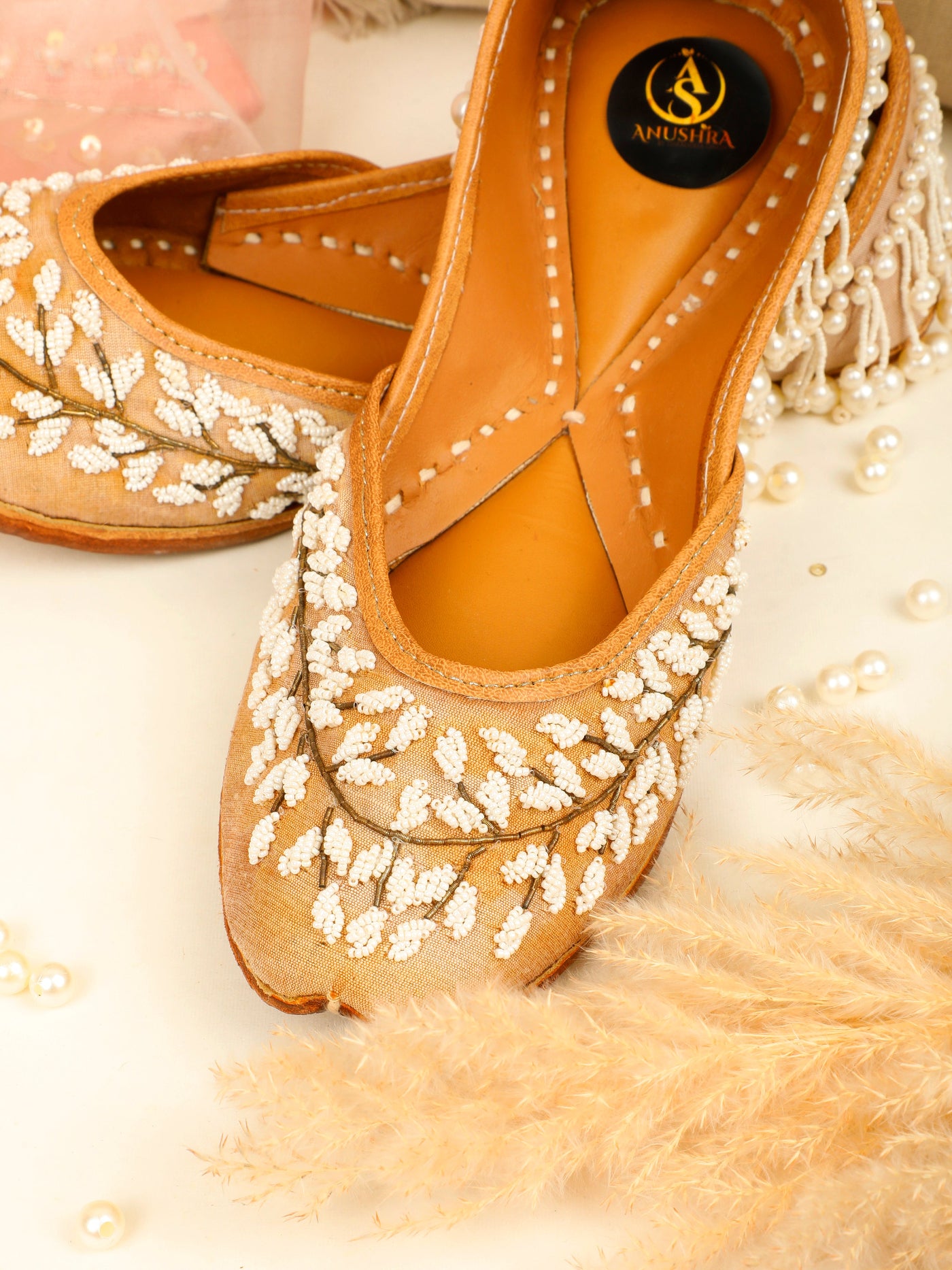Gracefully handcrafted, the Moti Baag Jutti is a celebration of subtle luxury. Designed on a warm beige base, this jutti features intricate hand embroidery resembling delicate pearl clusters arranged like blooming vines. The minimal yet refined detailing lends a timeless charm, while the cushioned leather sole ensures comfort through long festive hours. Perfect for bridesmaids, intimate weddings, festive mornings, and elegant ethnic looks.