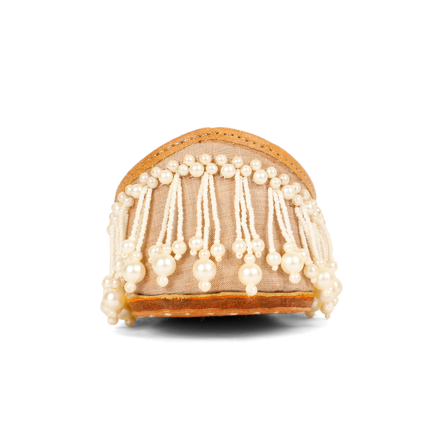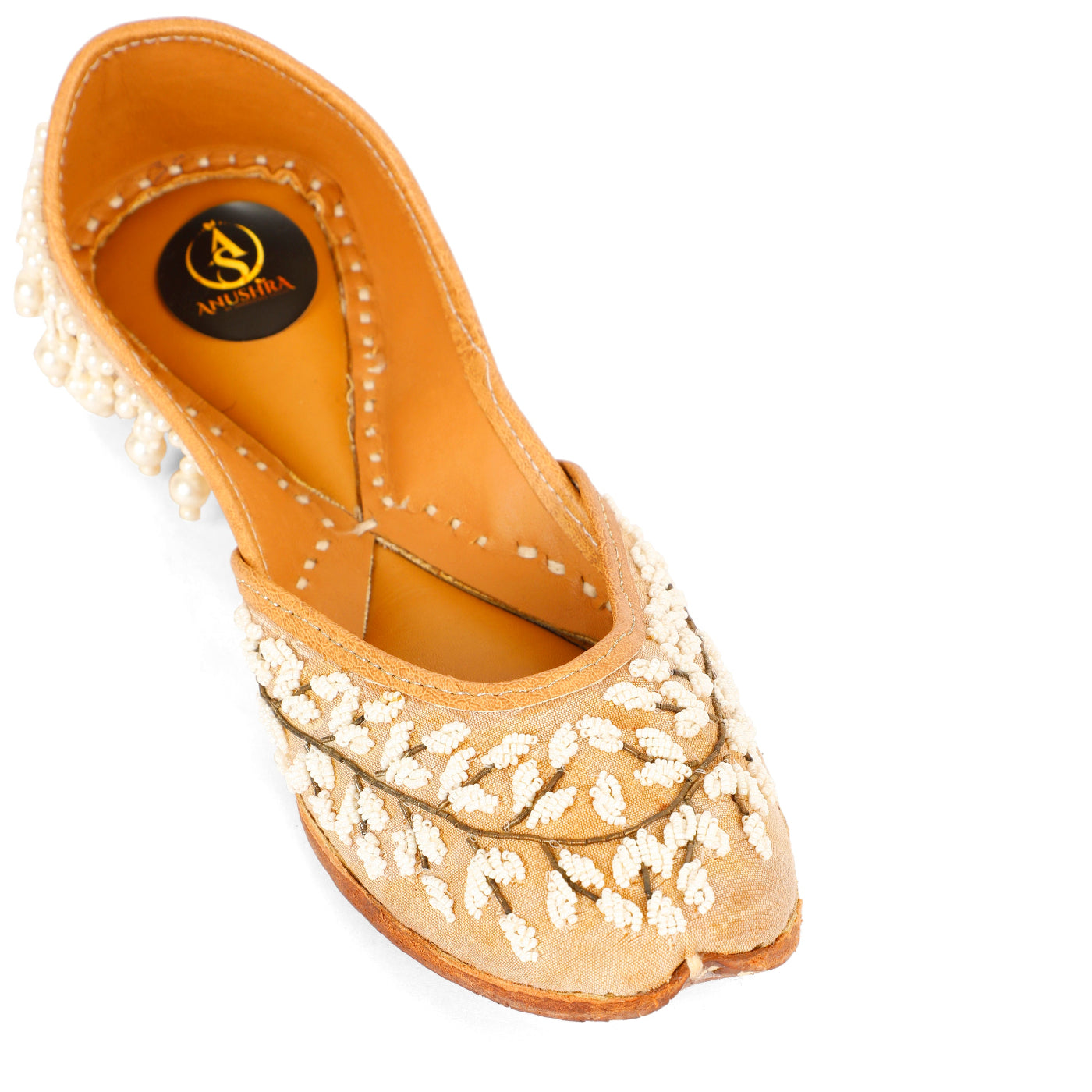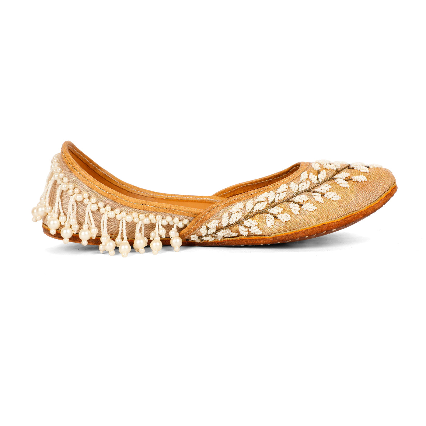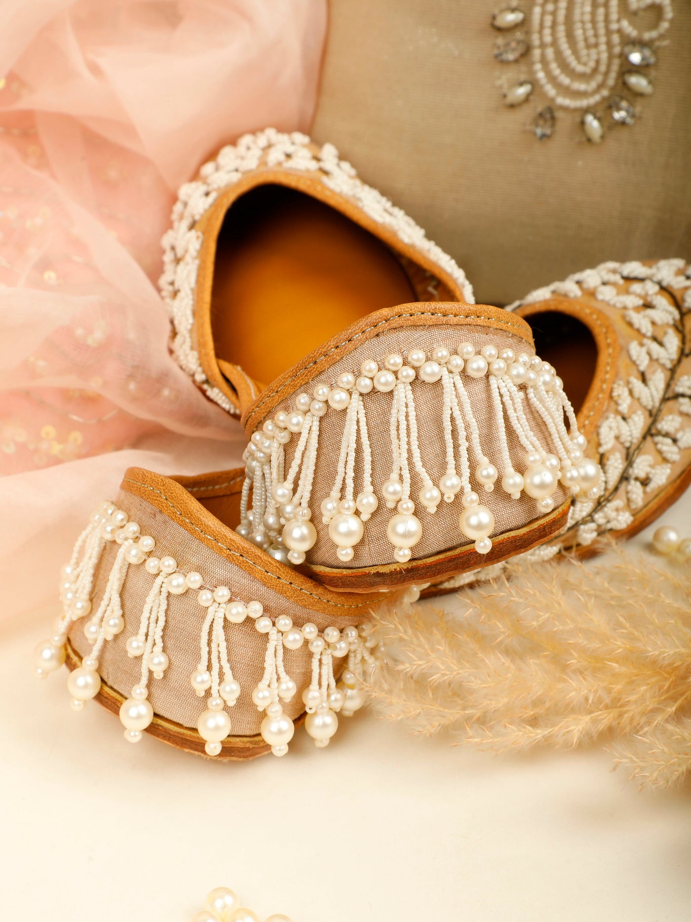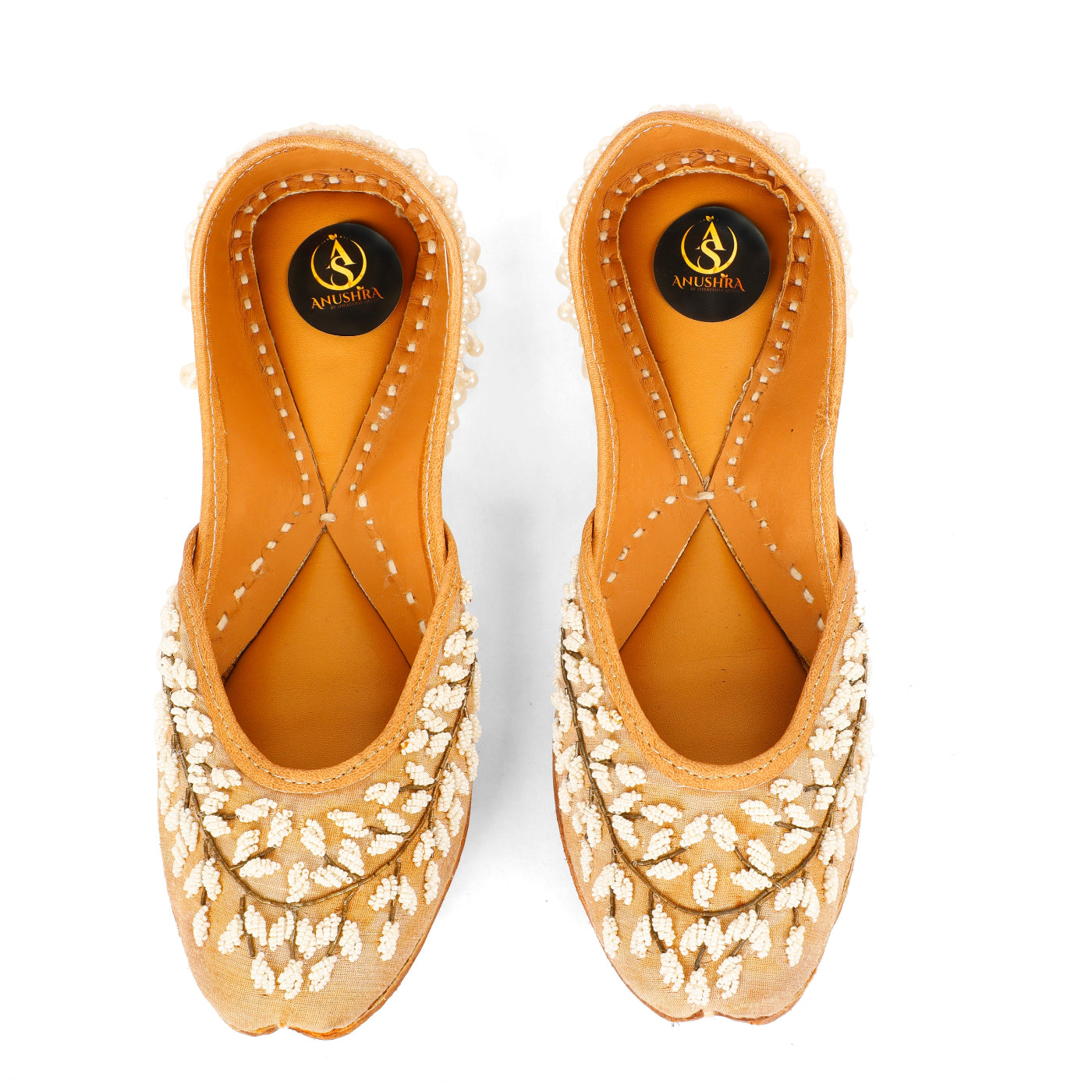 Gracefully handcrafted, the Moti Baag Jutti is a celebration of subtle luxury. Designed on a warm beige base, this jutti features intricate hand embroidery resembling delicate pearl clusters arranged like blooming vines. The minimal yet refined detailing lends a timeless charm, while the cushioned leather sole ensures comfort through long festive hours. Perfect for bridesmaids, intimate weddings, festive mornings, and elegant ethnic looks.
