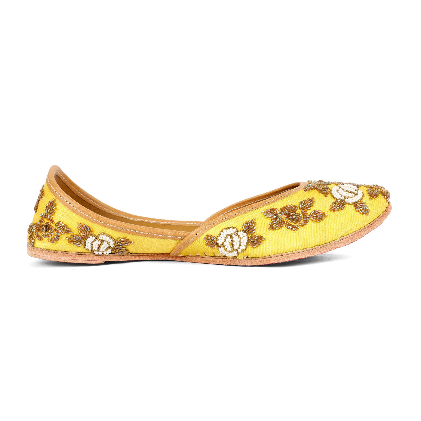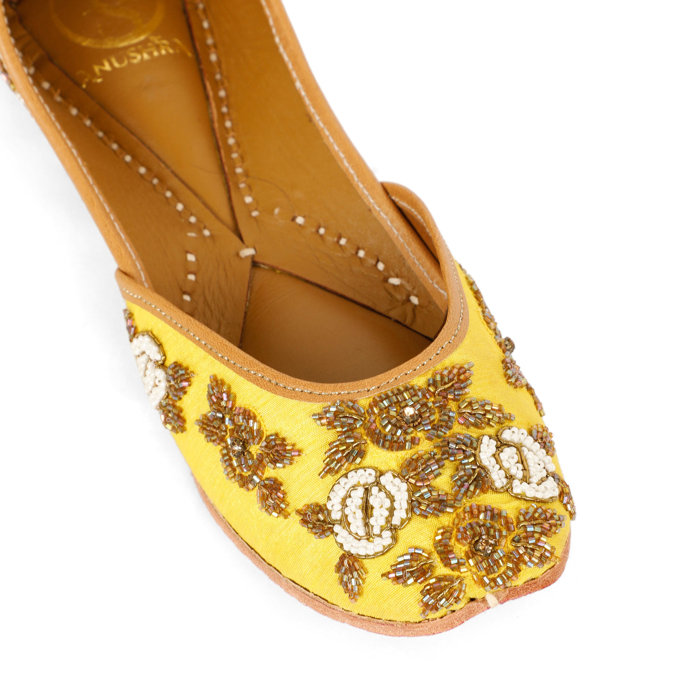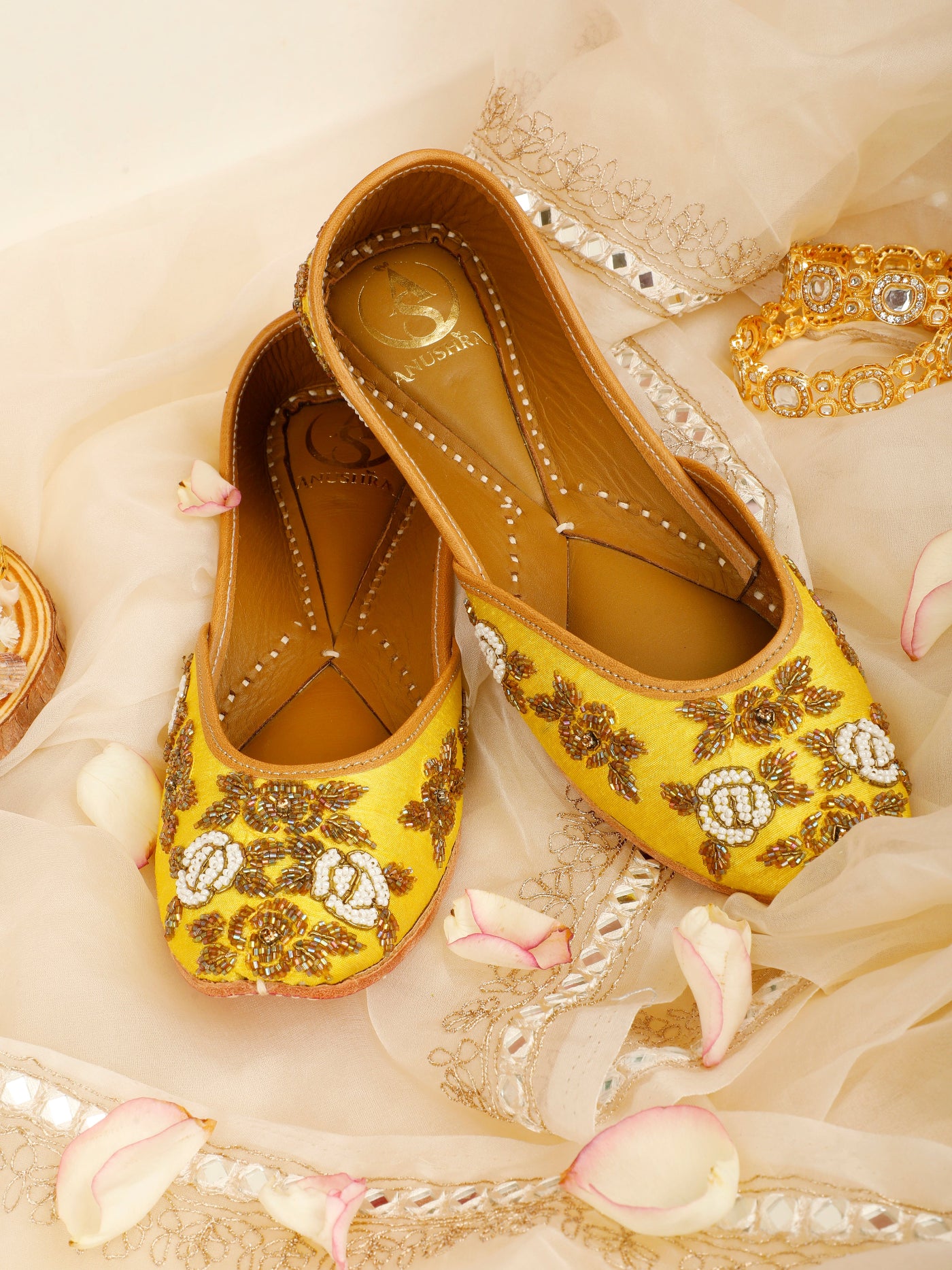 Radiating festive charm and timeless elegance, the Sunshine Jutti is a true celebration of handcrafted beauty. Crafted on a rich mustard-yellow base, this jutti is adorned with intricate floral embroidery using antique gold beads and ivory accents, creating a graceful balance of vibrance and sophistication. The soft leather lining and traditional stitching ensure comfort with every step, making it a perfect pick for haldi ceremonies, weddings, and joyful festive occasions.