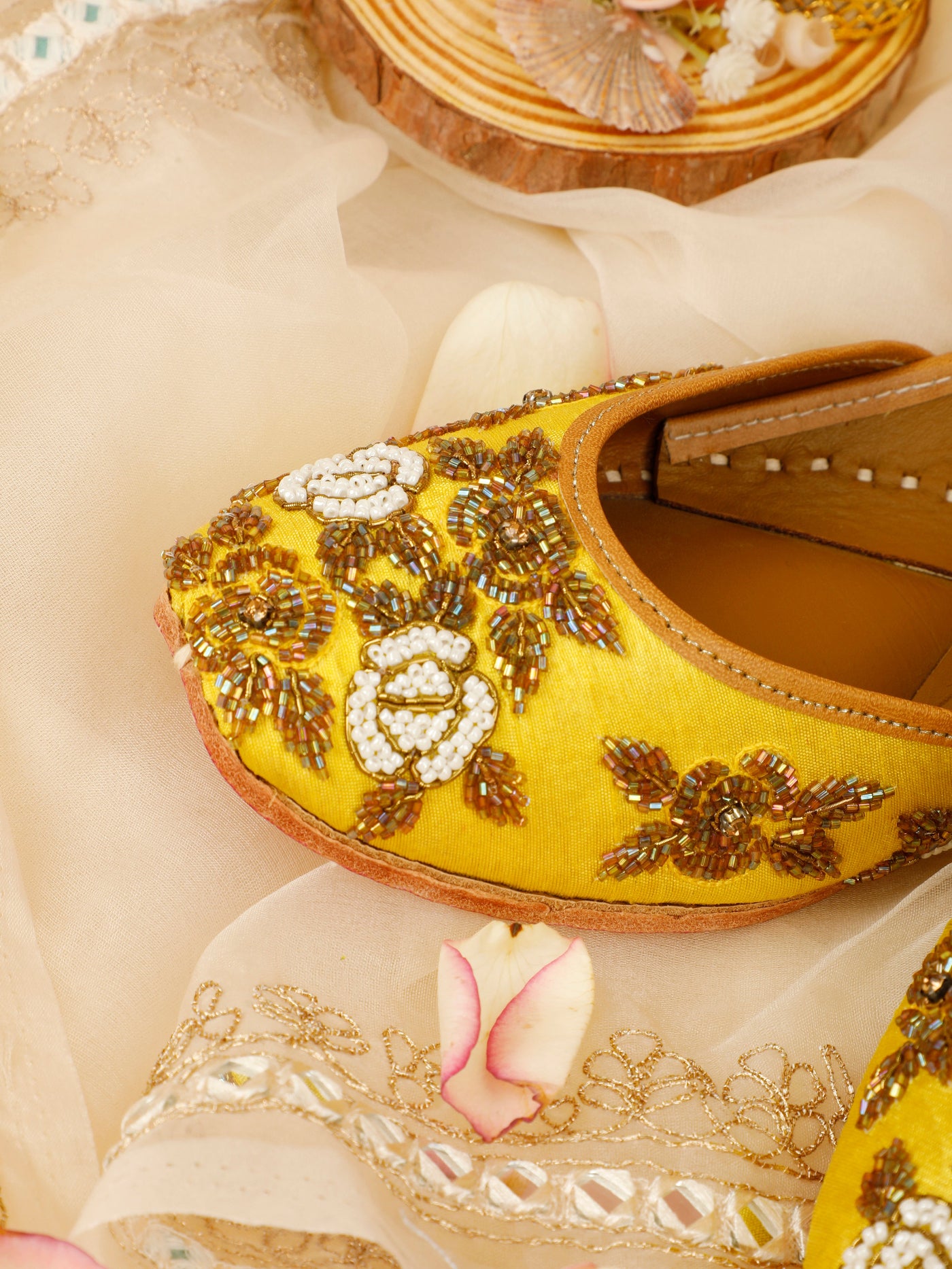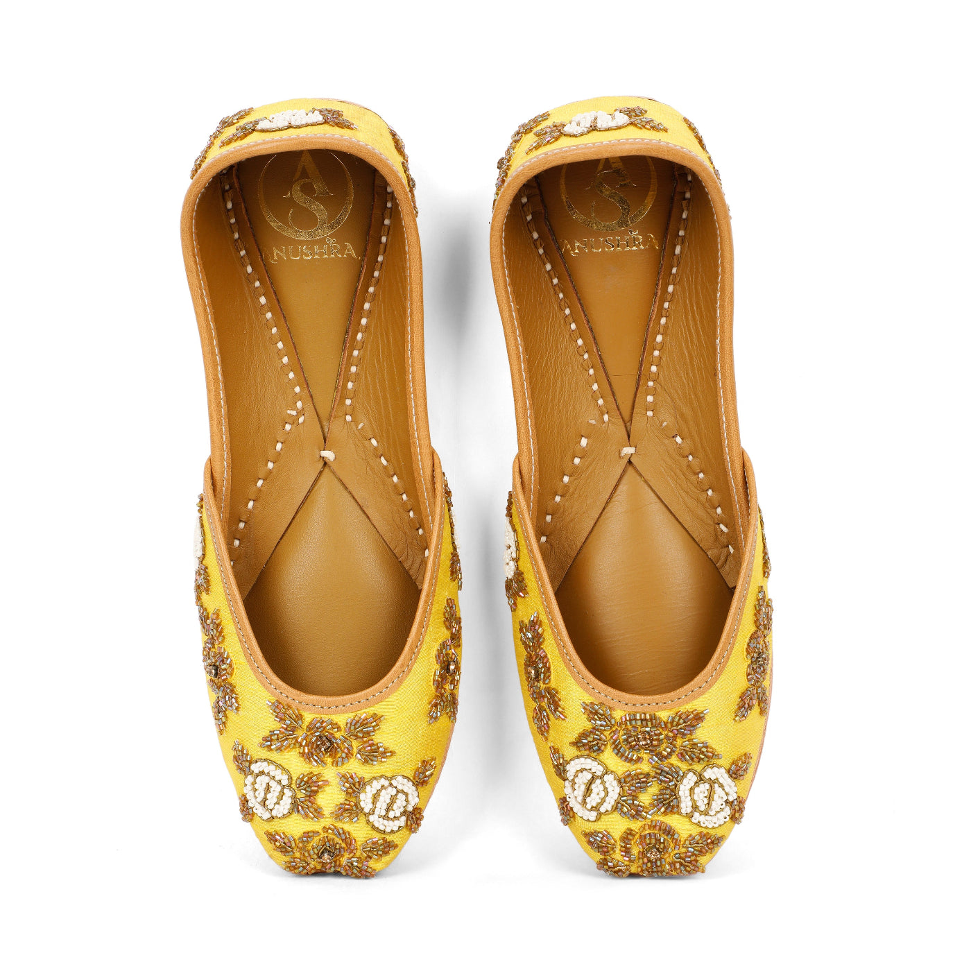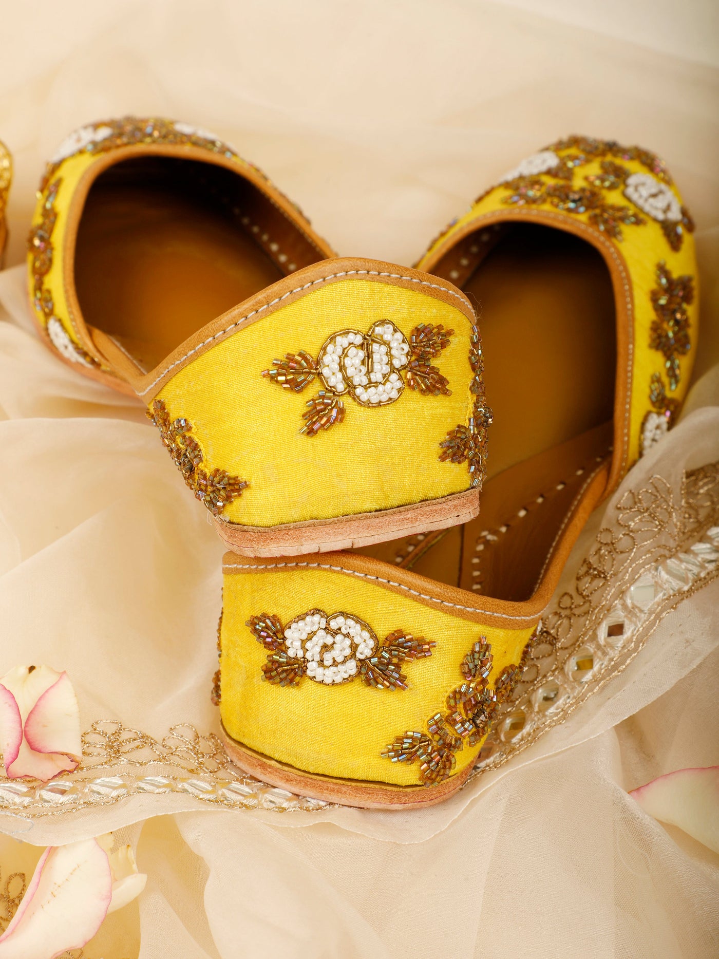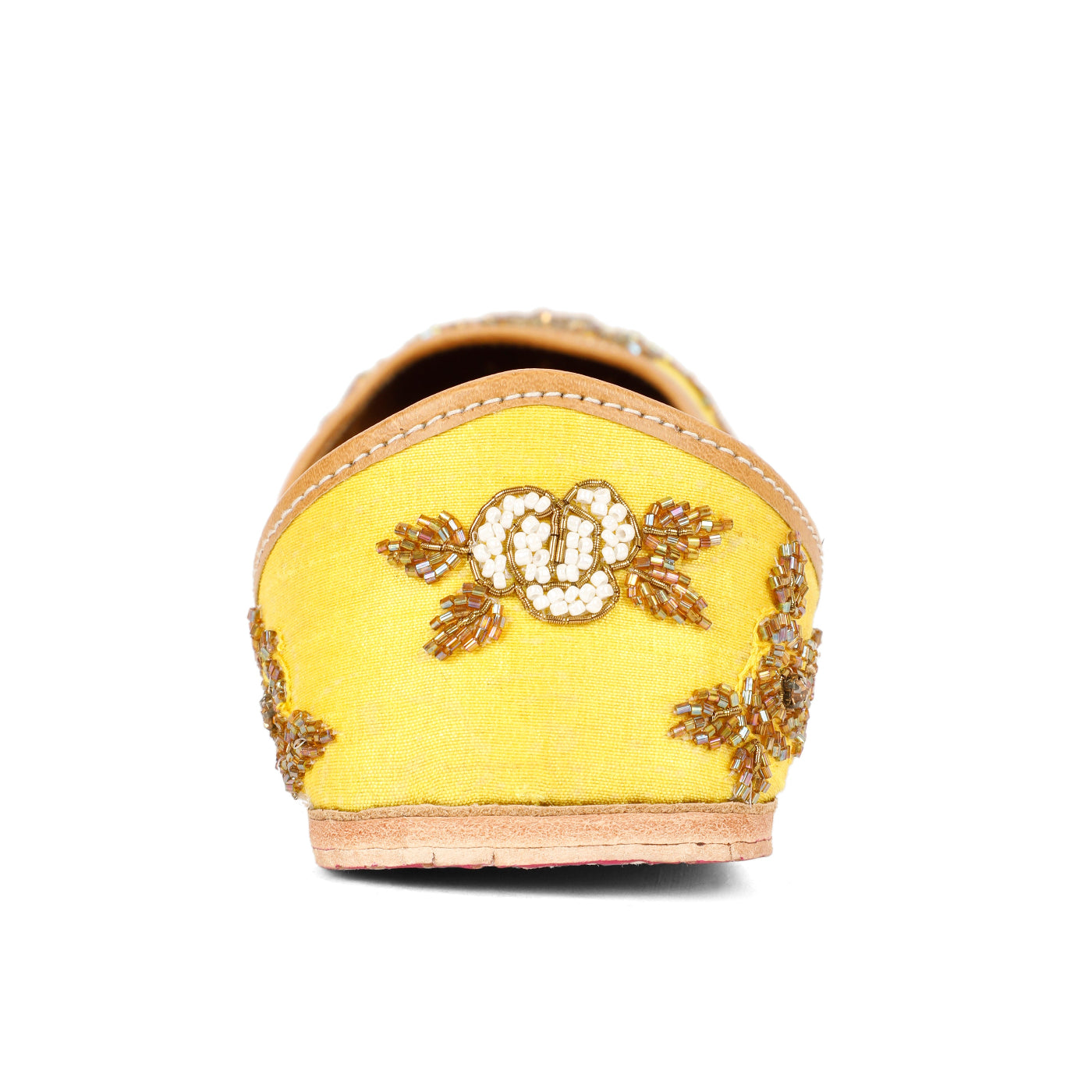 Radiating festive charm and timeless elegance, the Sunshine Jutti is a true celebration of handcrafted beauty. Crafted on a rich mustard-yellow base, this jutti is adorned with intricate floral embroidery using antique gold beads and ivory accents, creating a graceful balance of vibrance and sophistication. The soft leather lining and traditional stitching ensure comfort with every step, making it a perfect pick for haldi ceremonies, weddings, and joyful festive occasions.