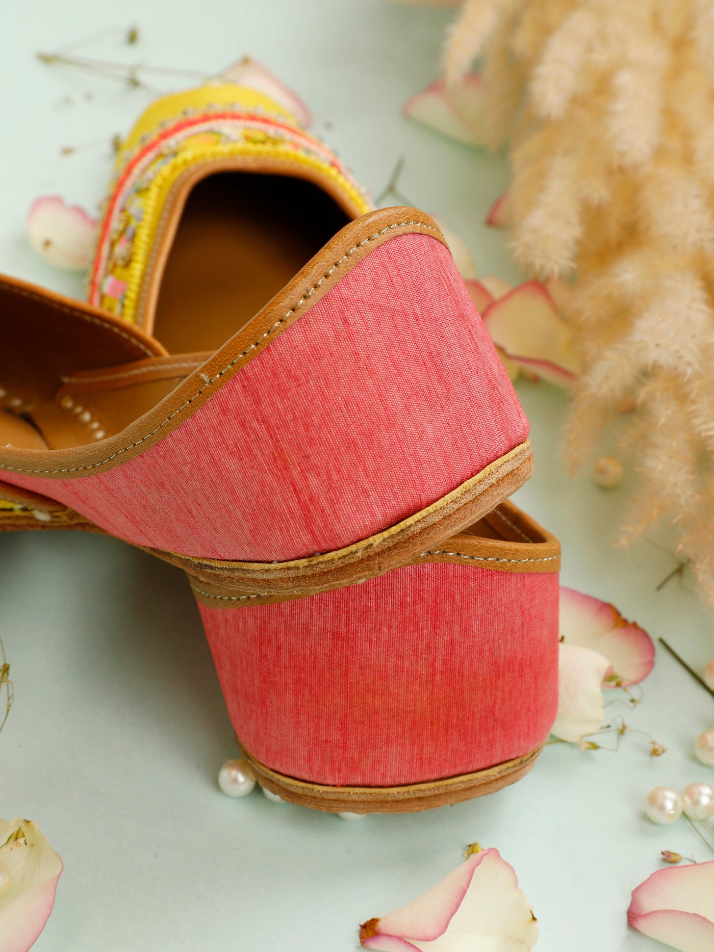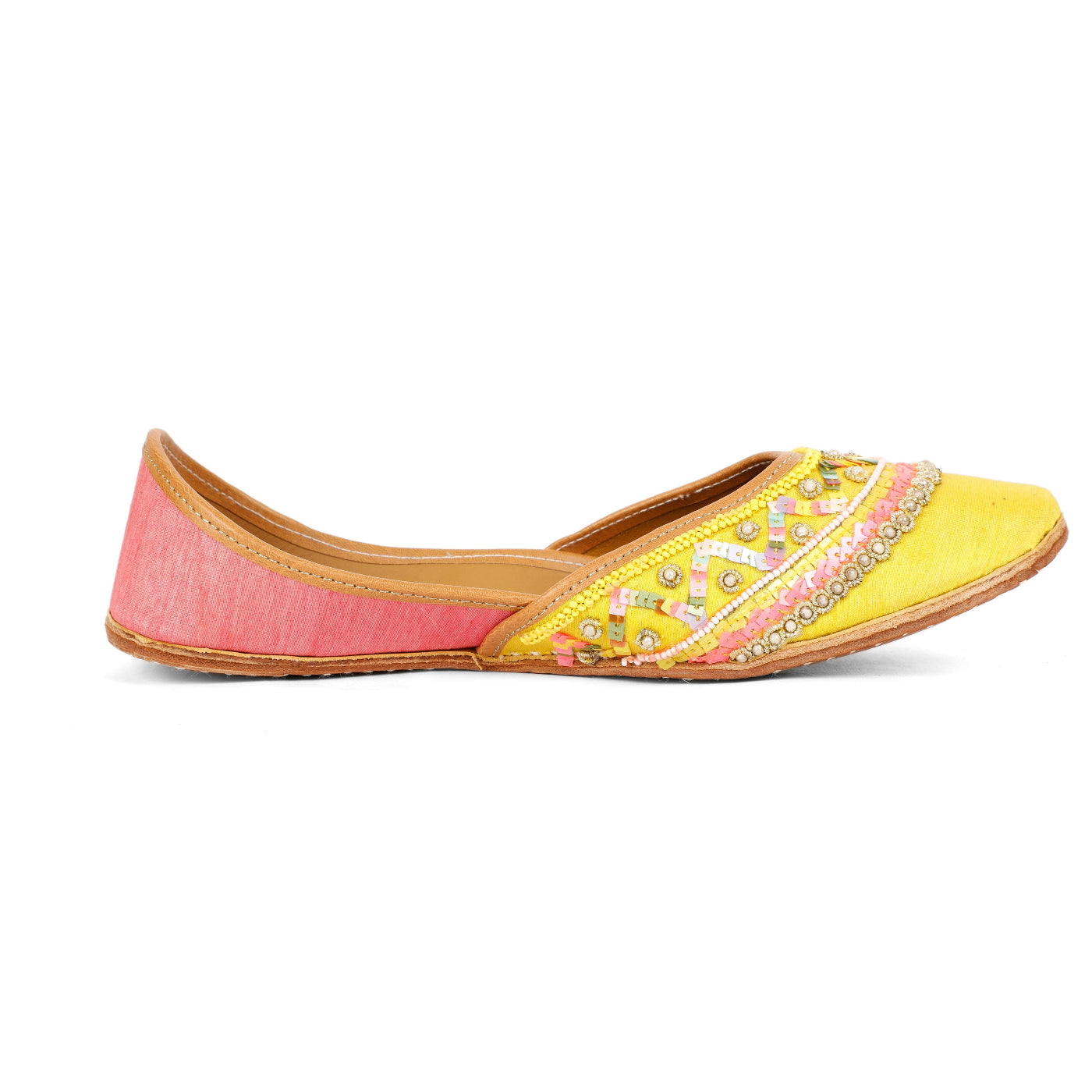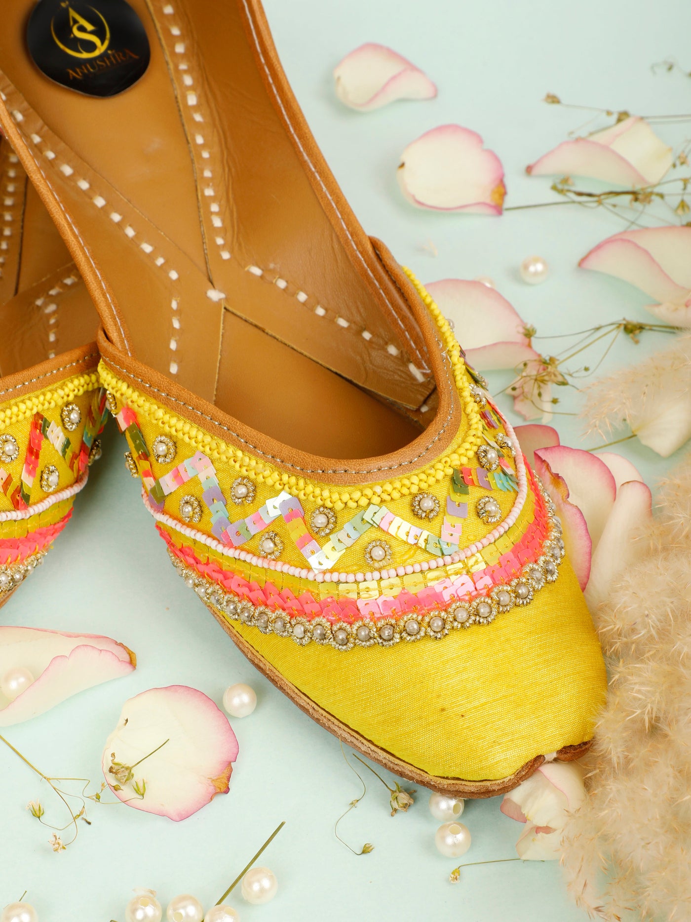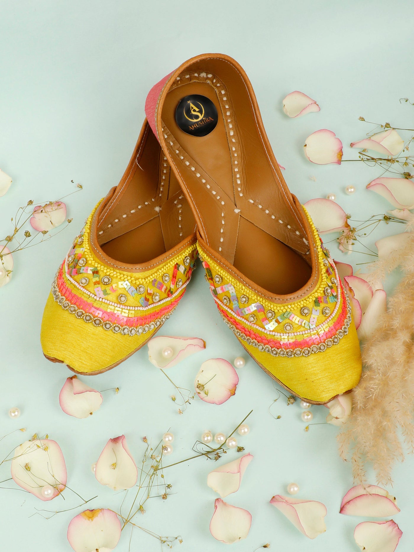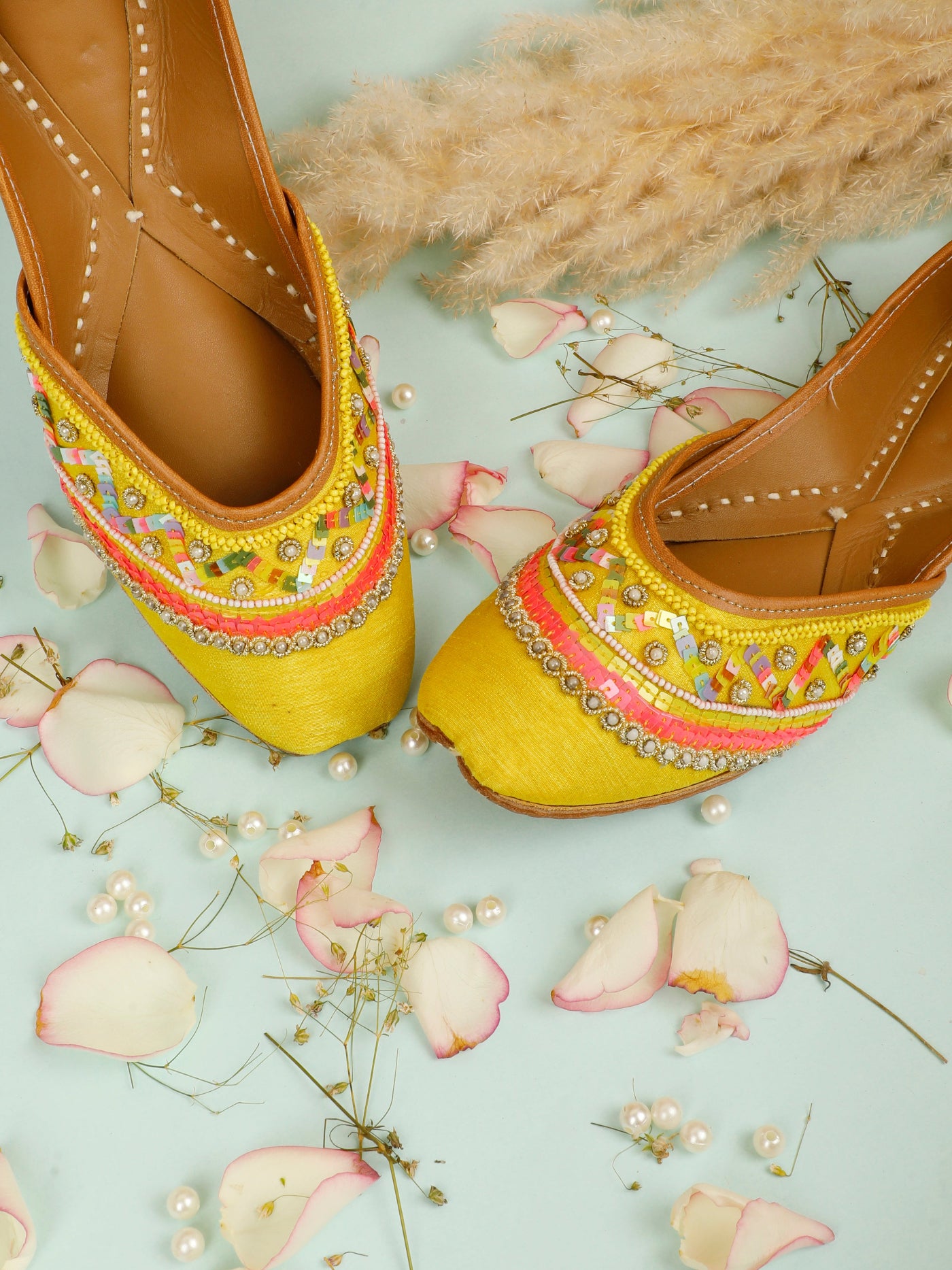 Bright, festive, and beautifully handcrafted, the yellow pop Jutti is a celebration of traditional artistry with a joyful pop of color. Crafted in a radiant yellow base, this jutti features intricate hand embroidery accented with pastel threads, delicate beads, and subtle sequence detailing. The soft inner lining ensures all-day comfort, while the fine stitching reflects timeless Indian craftsmanship. Perfect for haldi ceremonies, festive gatherings, and wedding celebrations, this jutti adds effortless elegance to ethnic and fusion outfits alike